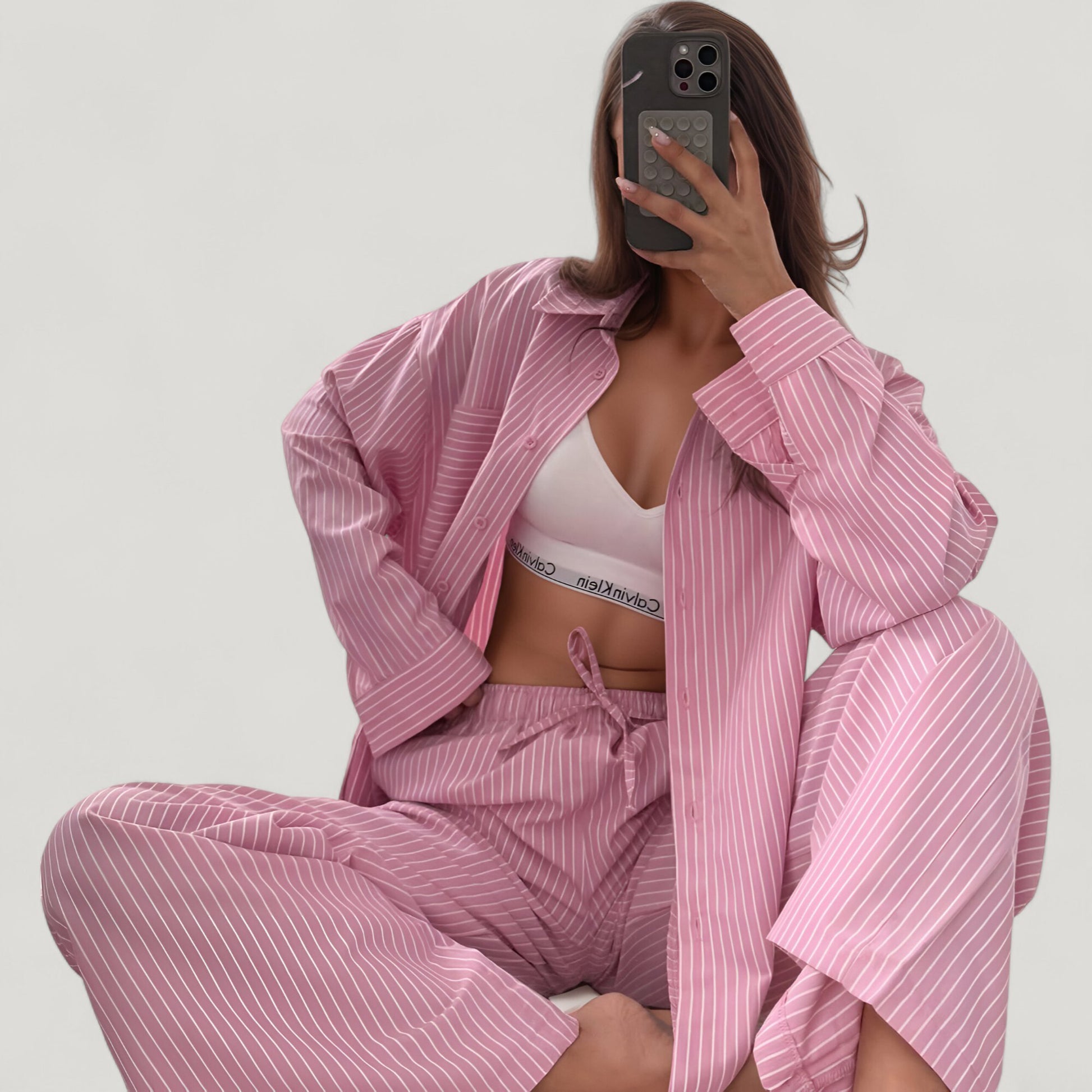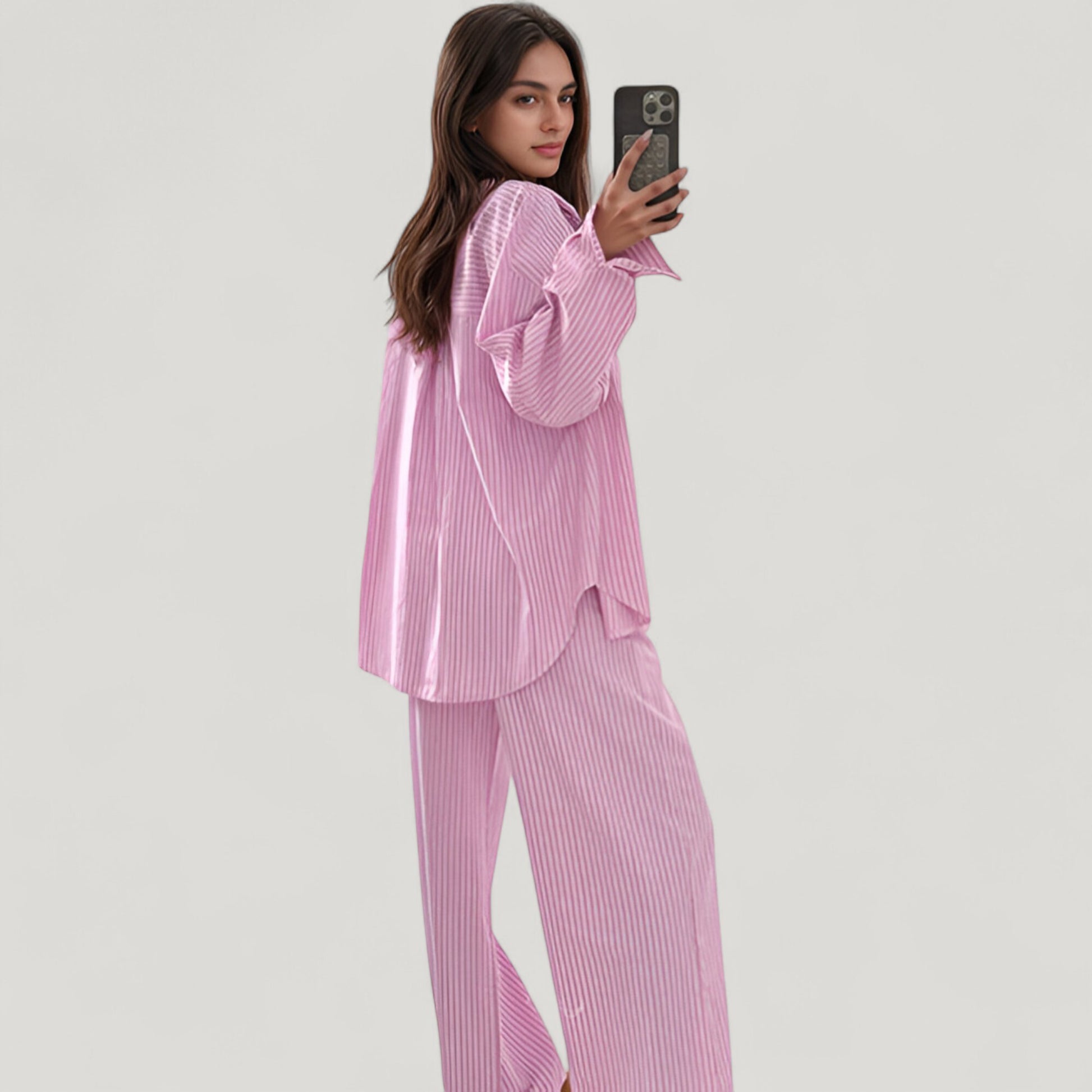 The Anna-Kaci Women's Striped Pajama Set blends classic sleepwear styling with modern ease. This two-piece ensemble features a relaxed button down shirt with a patch pocket and a pair of flowy wide leg pants with a comfortable elastic waistband. The vertical stripe pattern adds a timeless appeal, while the lightweight woven fabric ensures breathable all-day wear. It's a chic, coordinated set perfect for lounging or layering.
