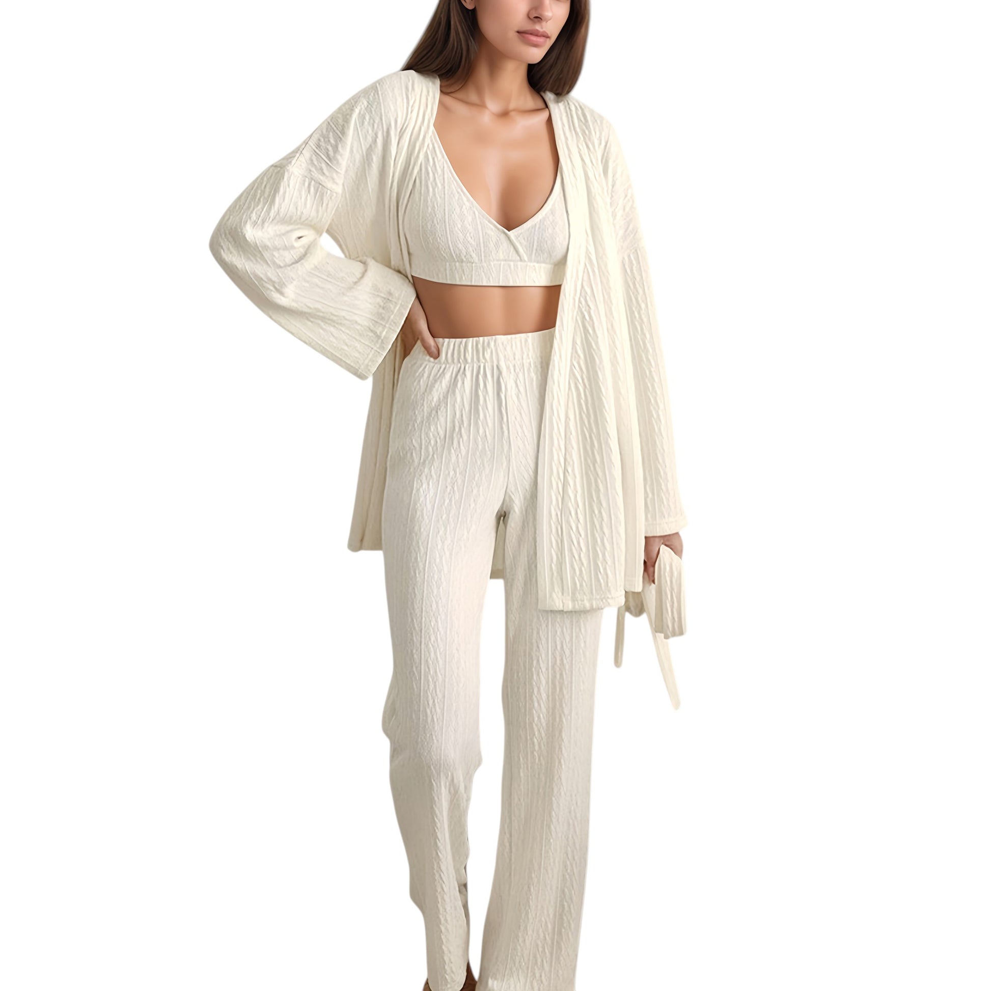 Anna-Kaci Lounge Women's 3-Piece Pajama Set with Textured Woven Knit Bra Top Open Cardigan and High Waist Pants