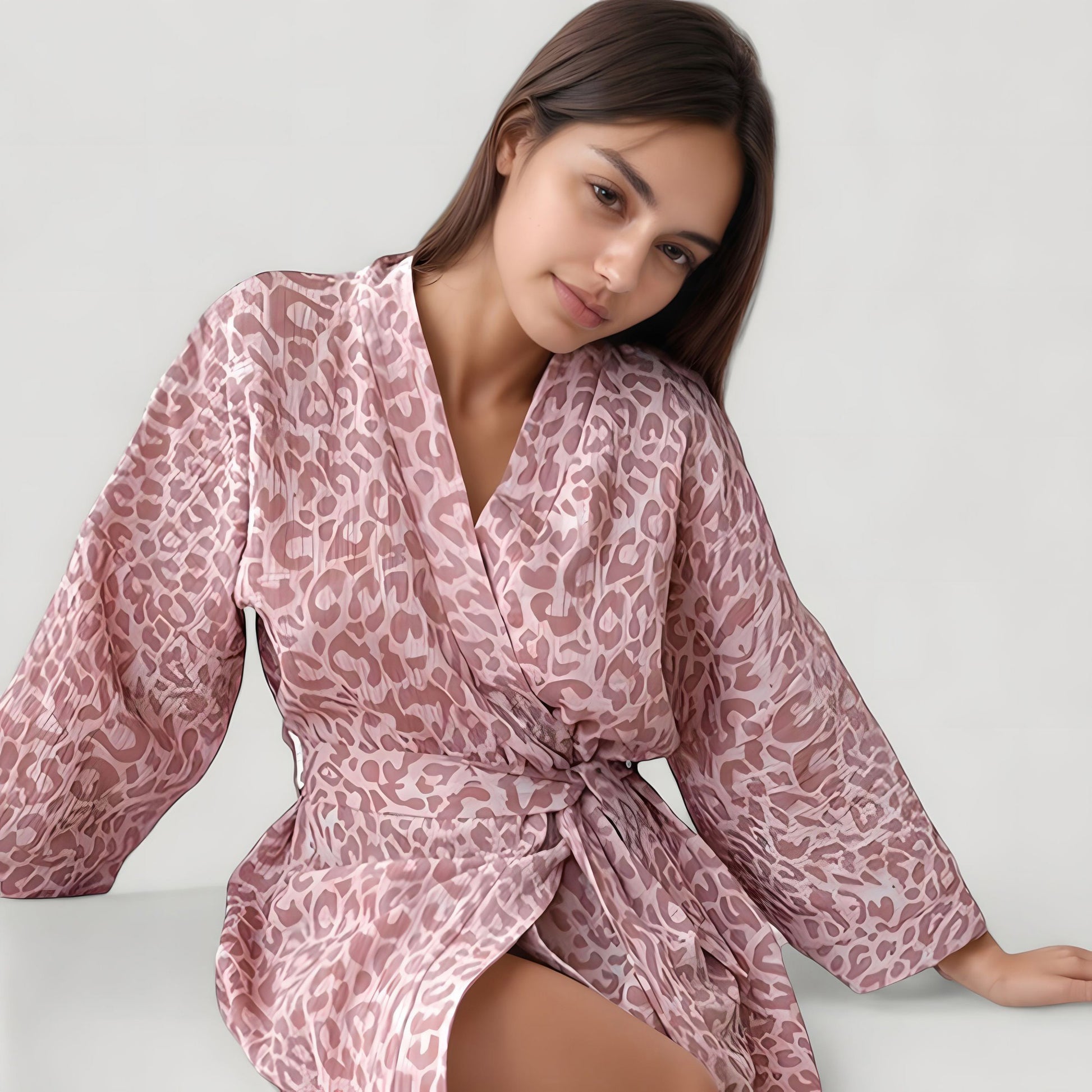 Anna-Kaci Lounge Women's Woven Leopard Print Bath Robe with Waist Tie and Wide Sleeves