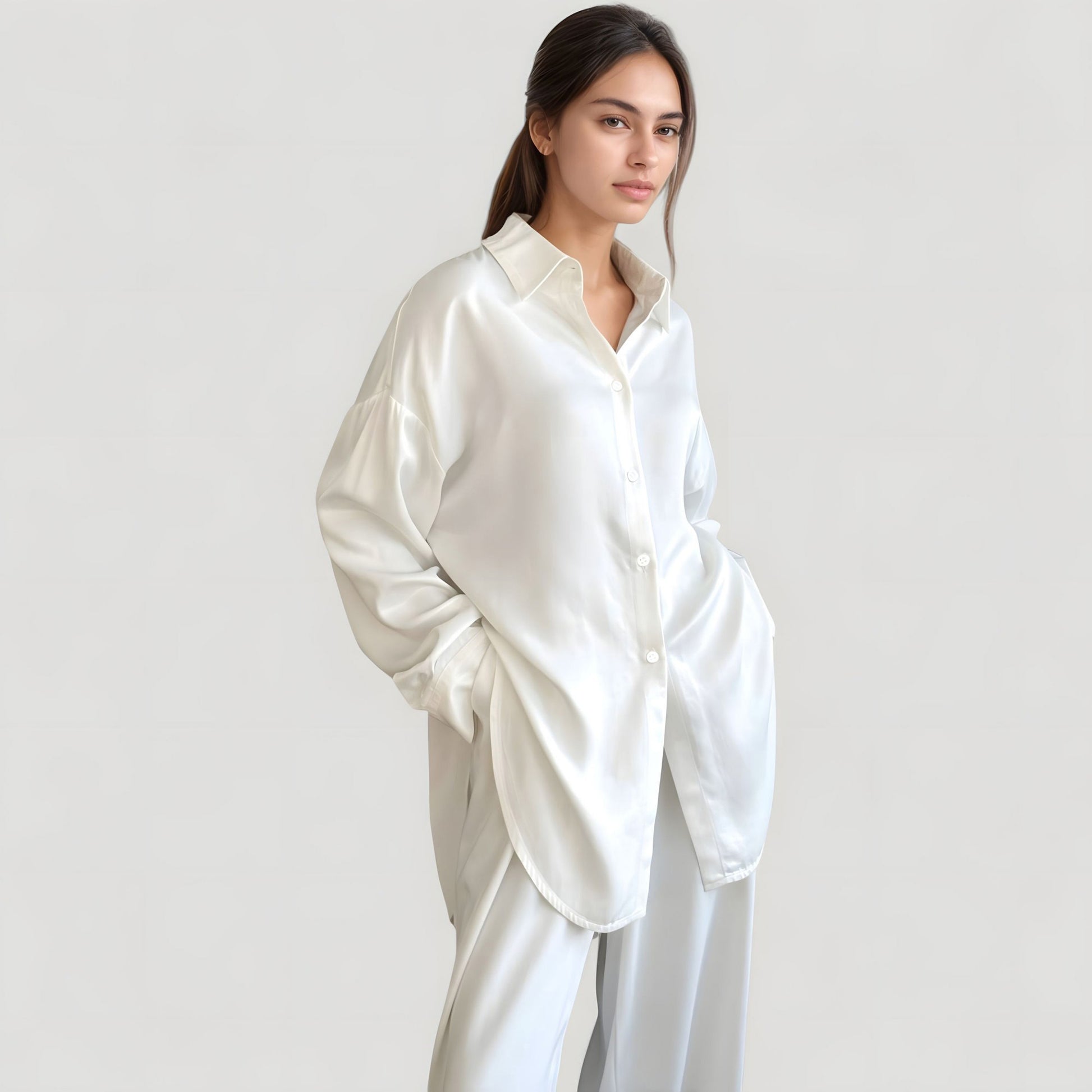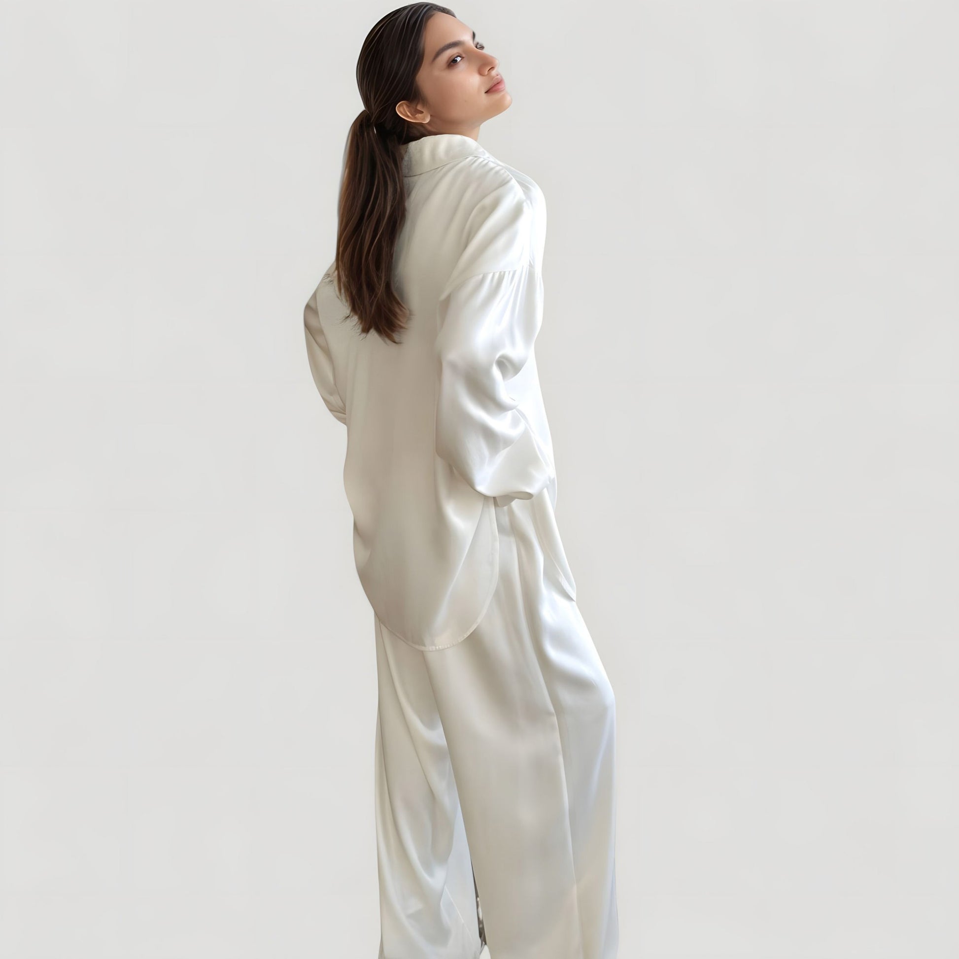 The Anna-Kaci Women's Satin Pajama Set combines elegance and ease with its flowy silhouette and luxurious feel. This two-piece set features a relaxed-fit button-down shirt and matching wide leg pants, offering a polished yet comfortable look. The silky woven fabric gives off a soft sheen while remaining breathable and smooth against the skin. Perfect for elevating your lounging or sleepwear style.