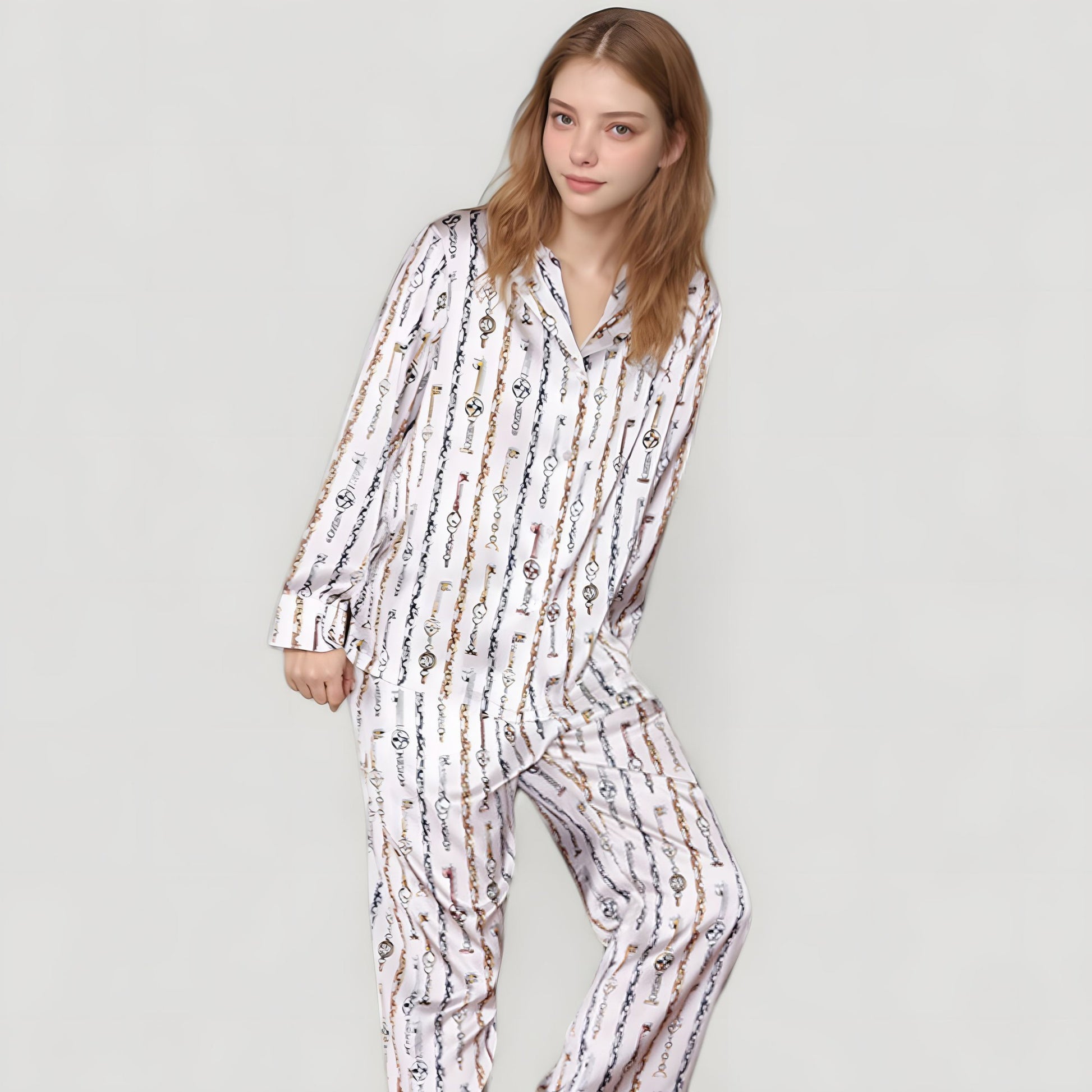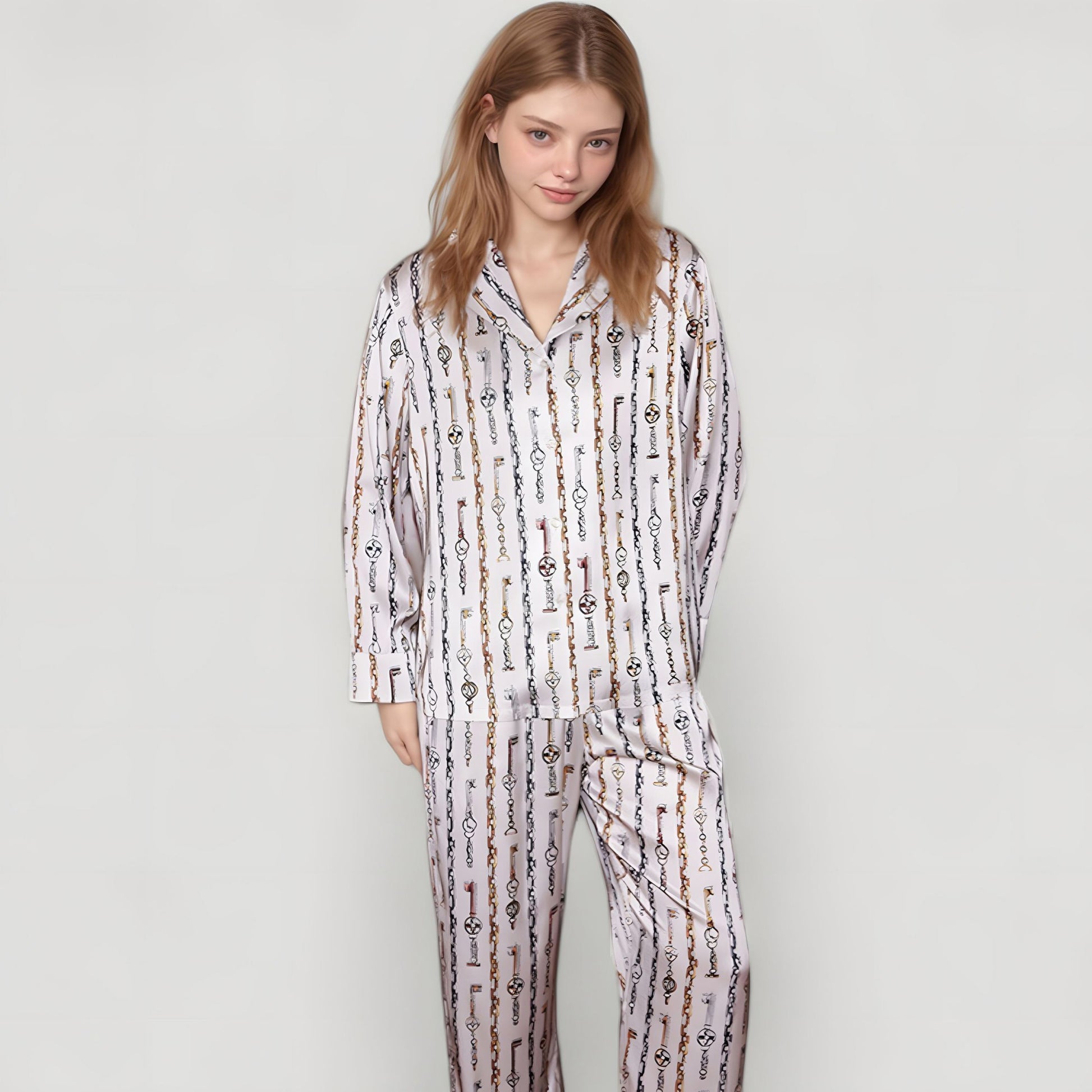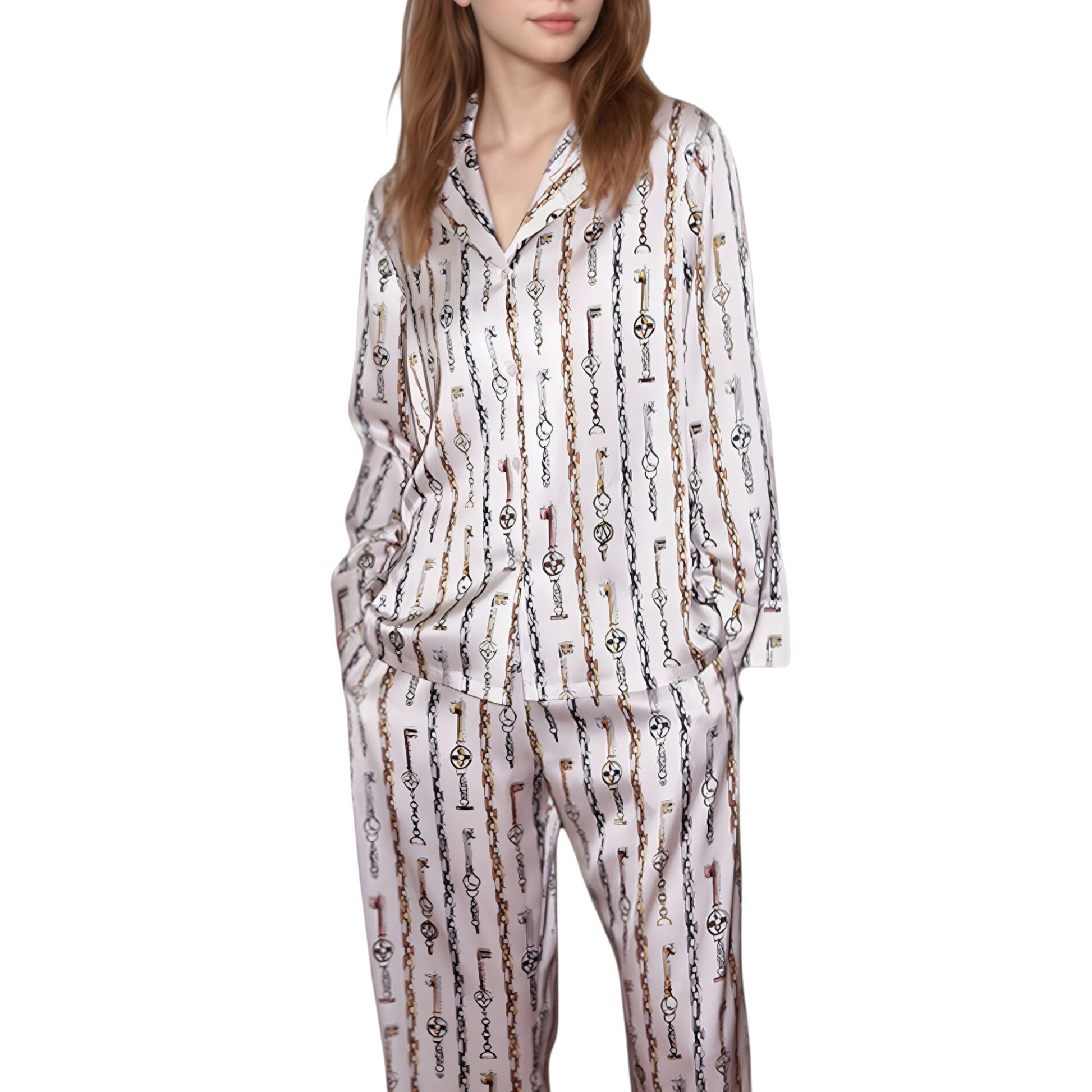 Anna-Kaci Lounge Women's Key and Chain Print Woven Pajama Set with Button Down Long Sleeve Top and Relaxed Fit Pants