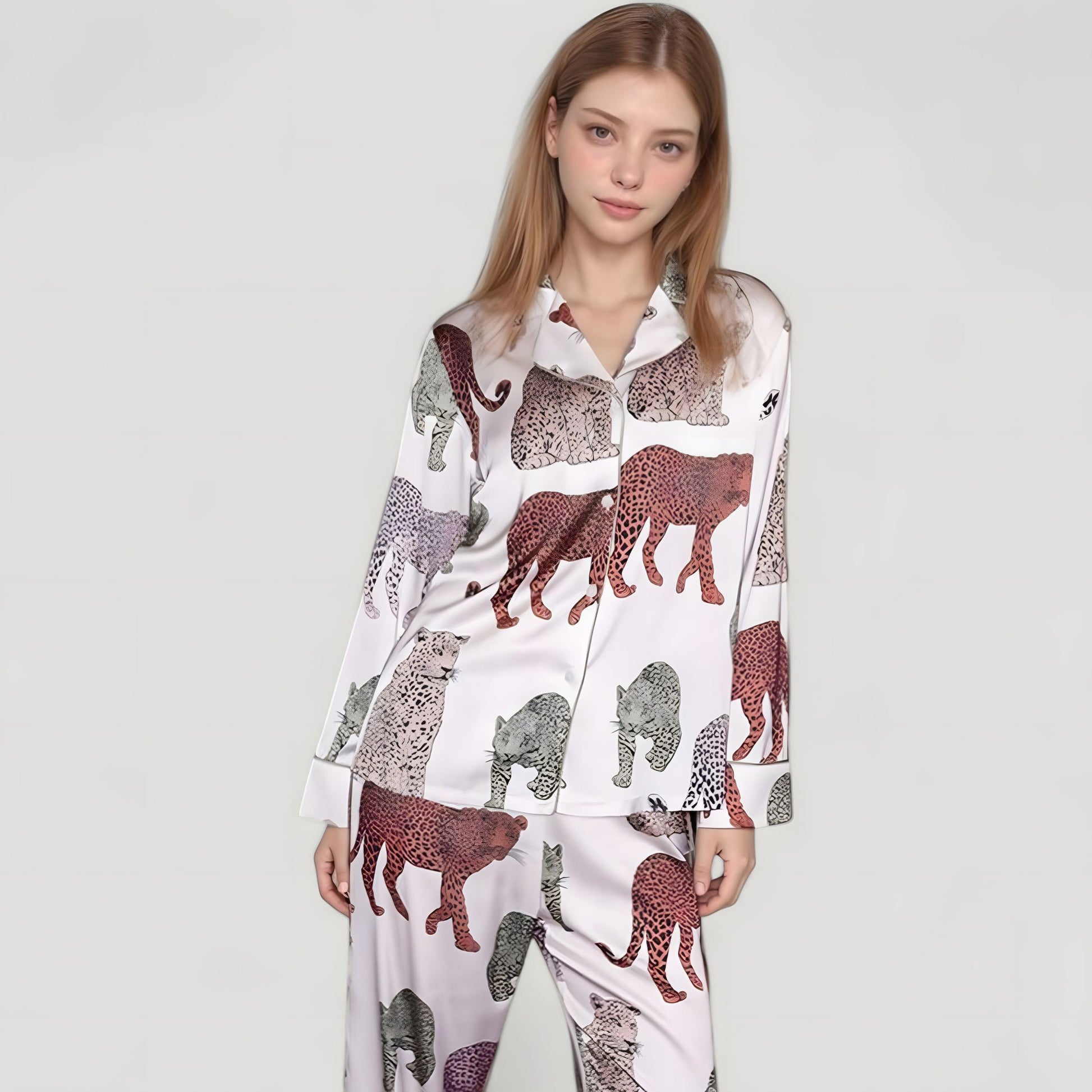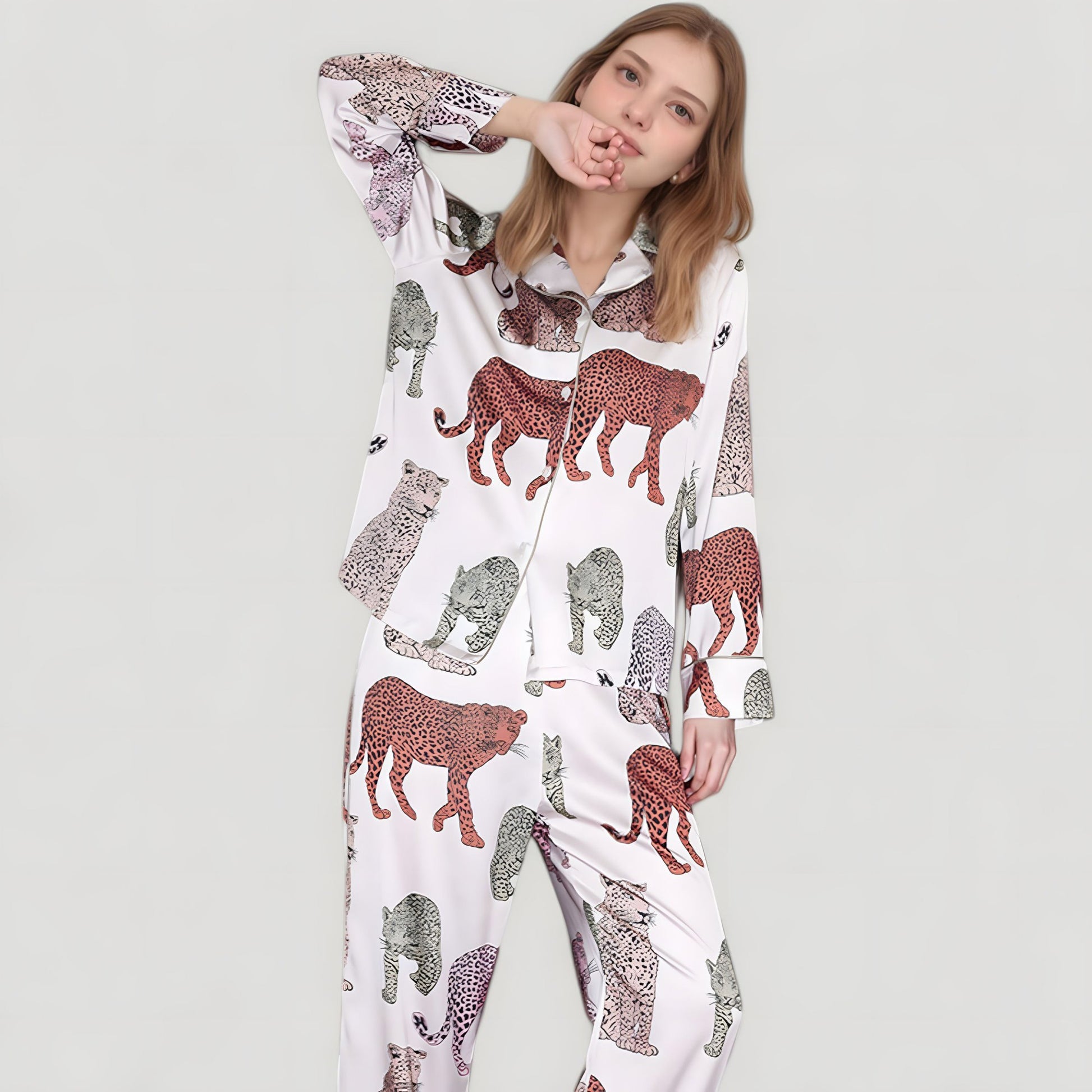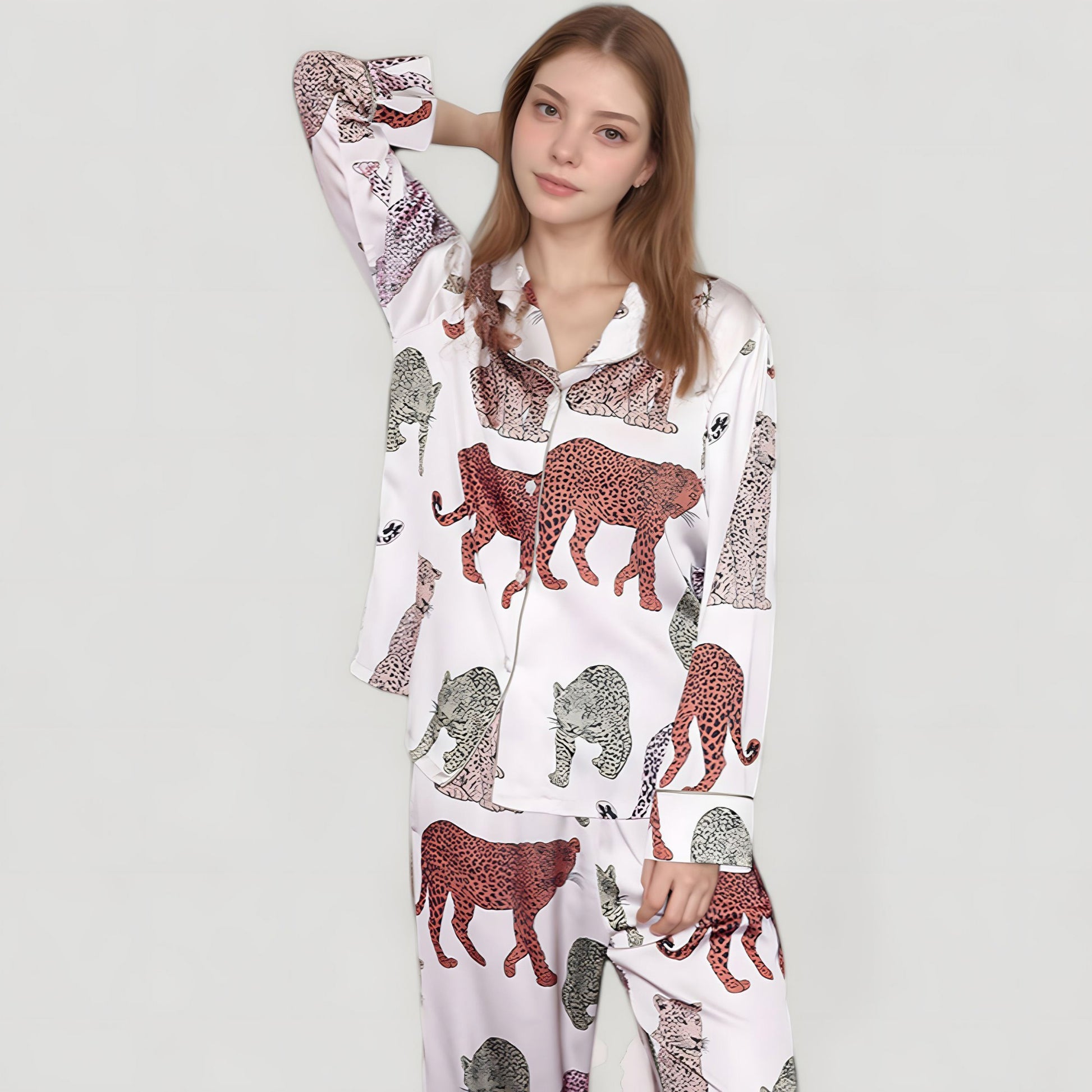 Anna-Kaci Lounge Women's Multicolored Leopard Print Pajama Set with Long Sleeve Notch Collar Top and Relaxed Straight Leg Bottoms