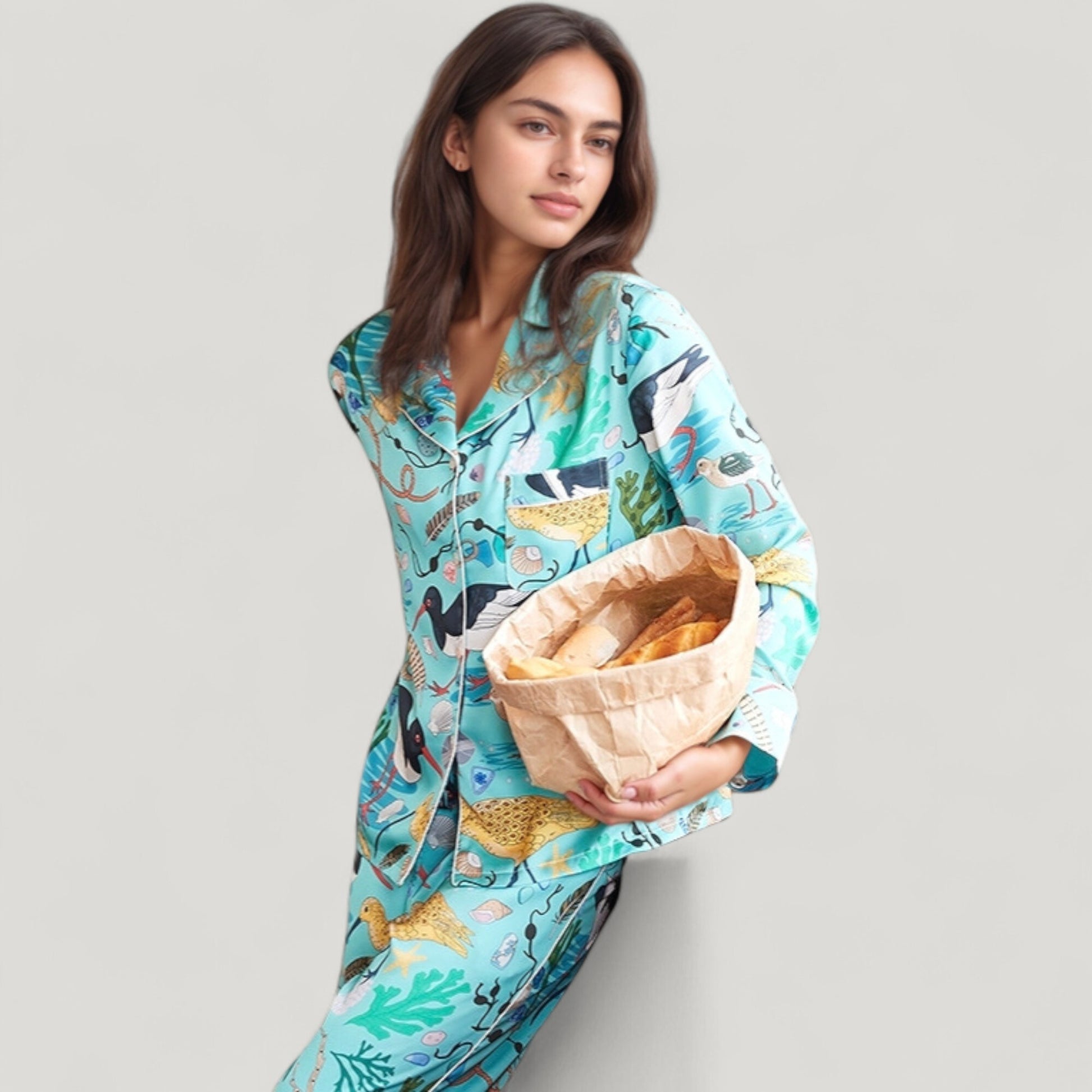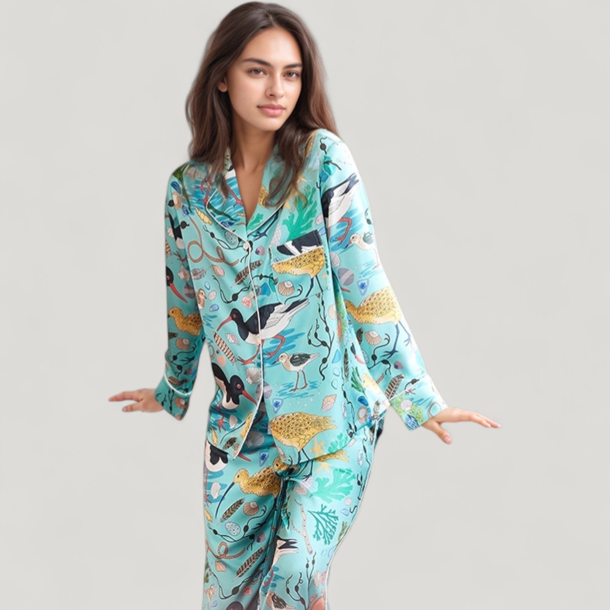 The Anna-Kaci Women's Tropical Bird Print Pajama Set brings playful charm to your nighttime wardrobe. Featuring a vibrant mix of birds, jungle animals, and tropical foliage, this silky woven set includes a relaxed-fit long sleeve button-down top and wide-leg pants. Its luxurious fabric and bold design make it a standout choice for lounging or gifting. Enjoy the soft drape and breezy feel with every wear.
