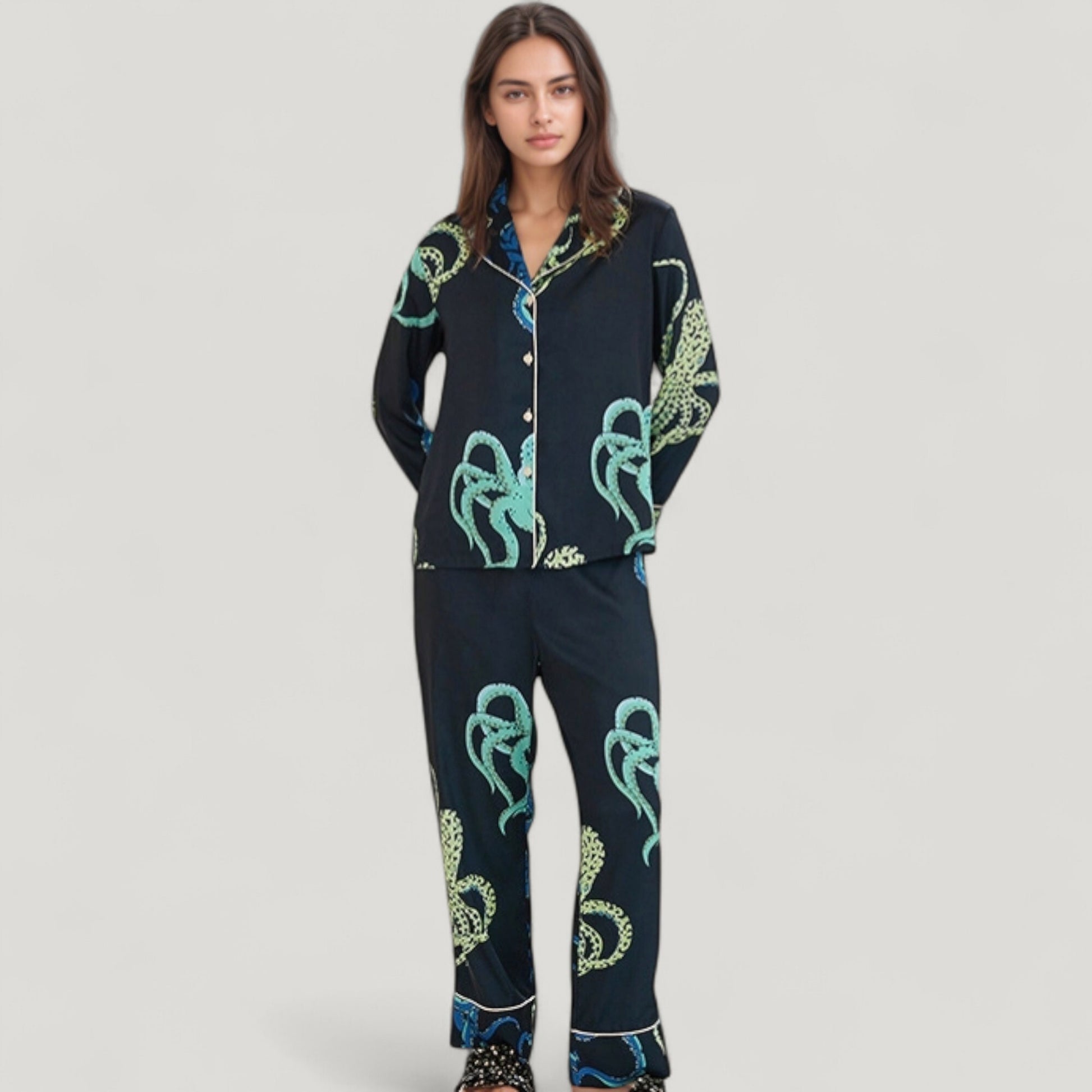 Anna-Kaci Lounge Women's Octopus Print Pajama Set with Button Front Long Sleeve Top and Relaxed Fit Wide Leg Woven Pants