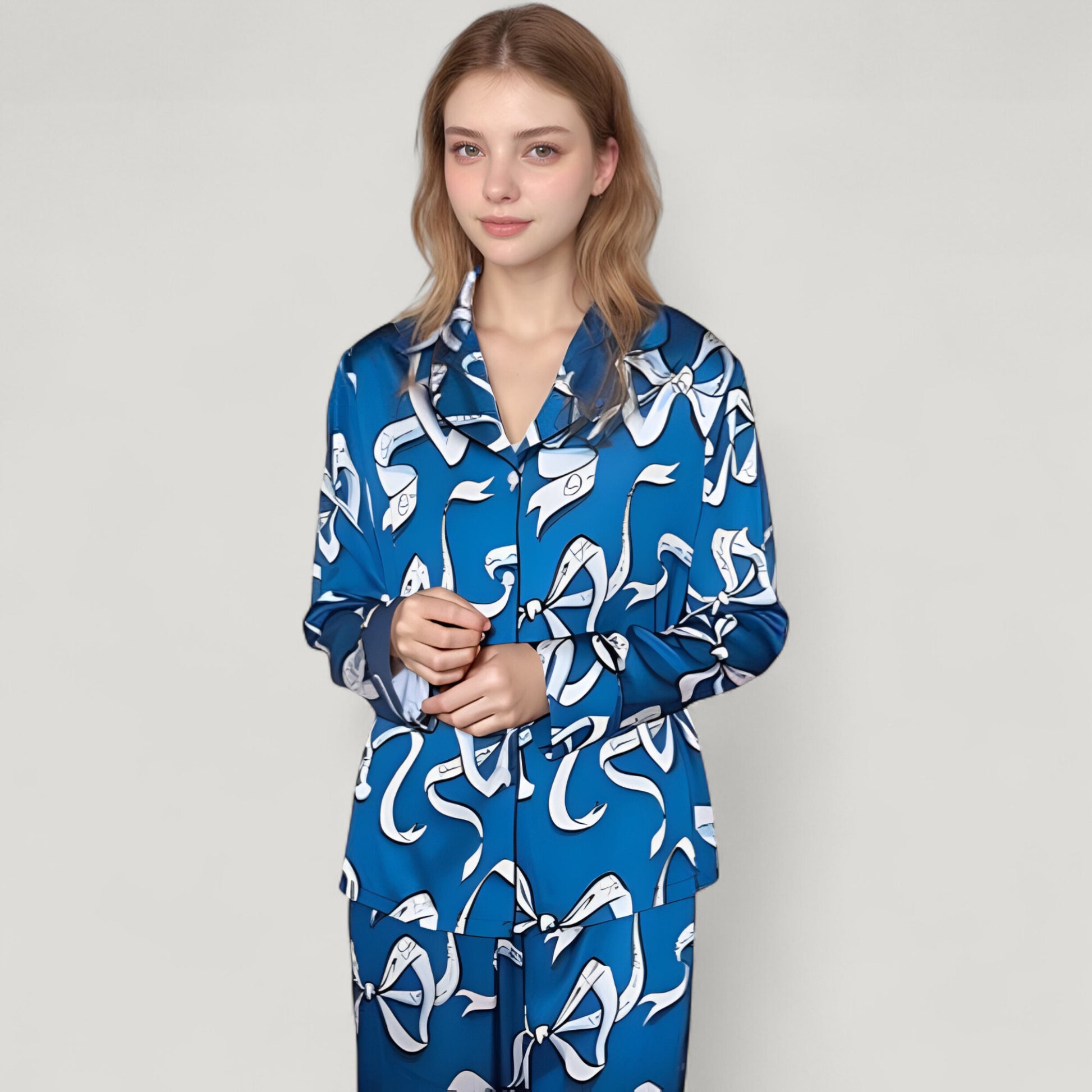 Anna-Kaci Lounge Women's Eel Print Pajama Set with Button Down Long Sleeve Top and Relaxed Fit Wide Leg Woven Pants