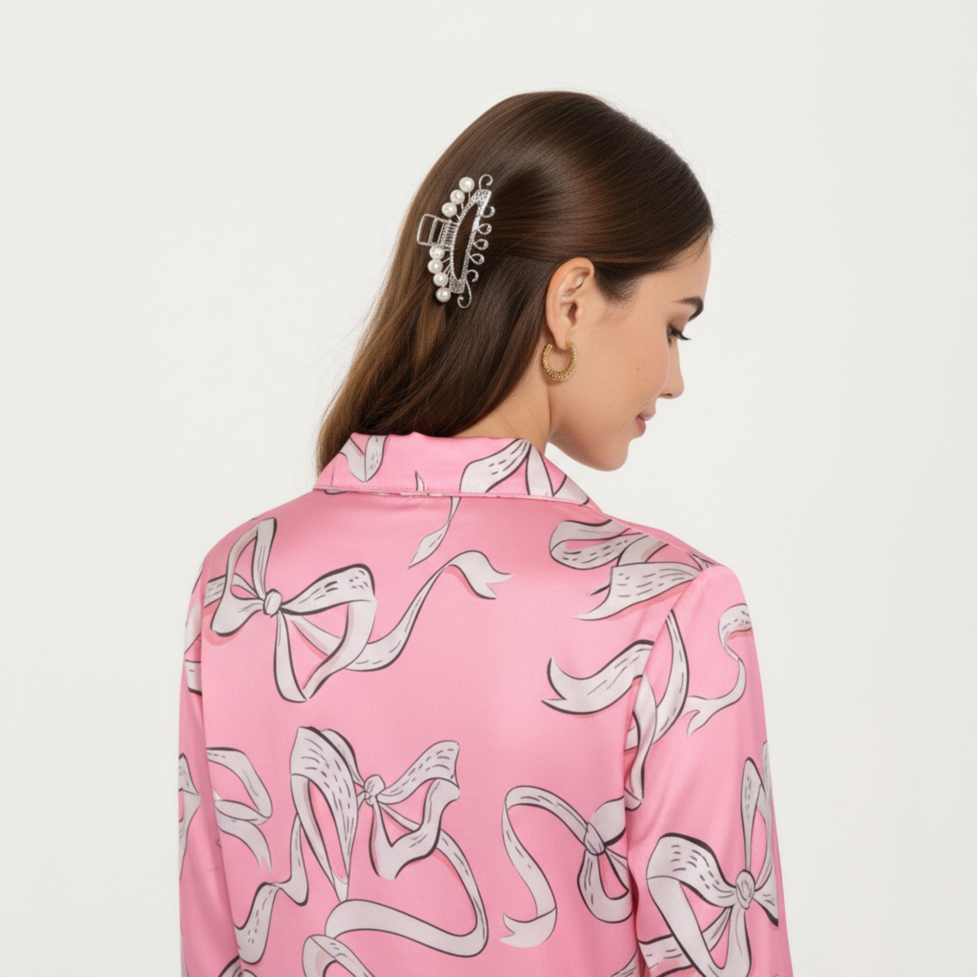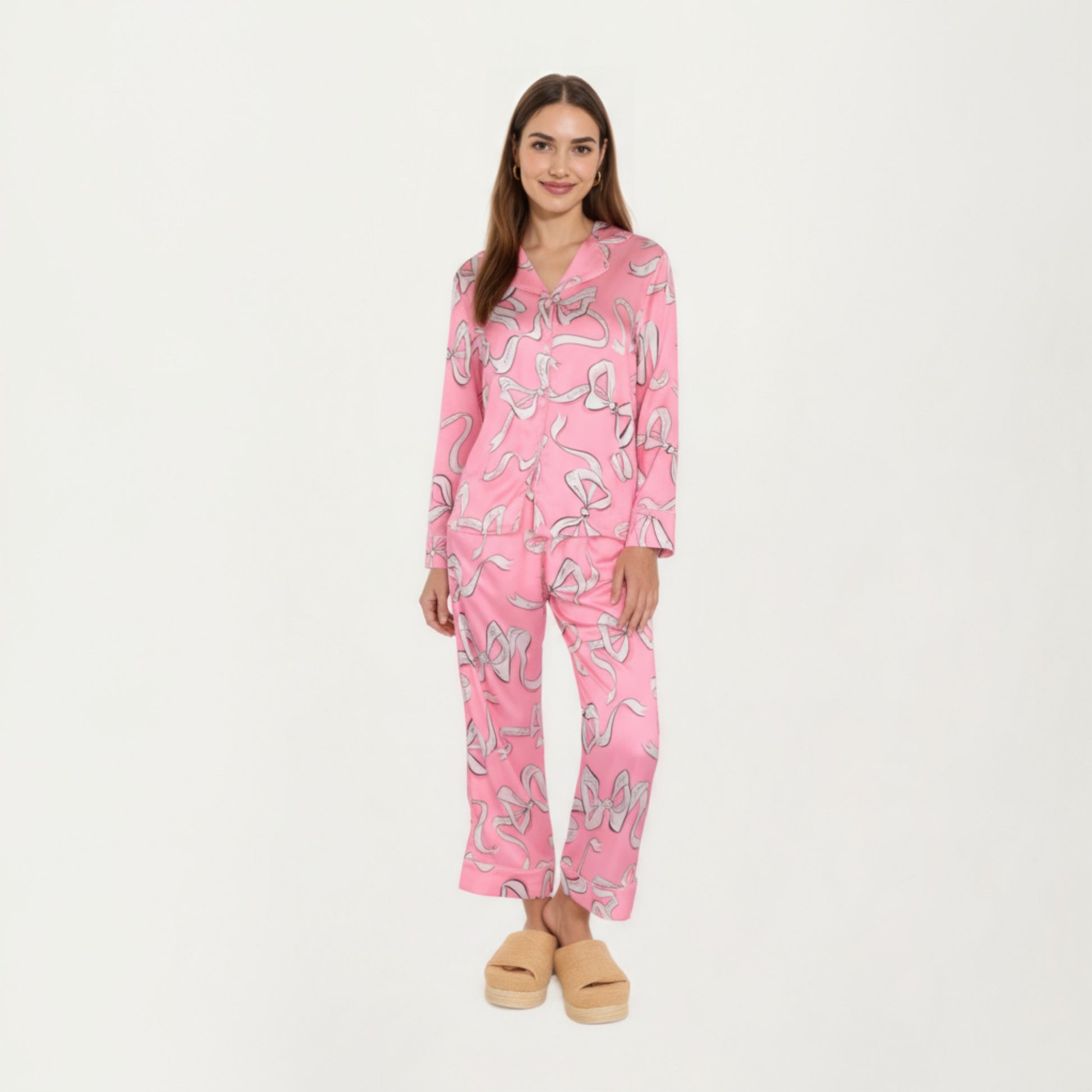 Anna-Kaci Lounge Women's 2-Piece Set Long Sleeve Button Front Pajama Set with Ribbon Print and Soft Silky Fabric for Relaxed Comfort