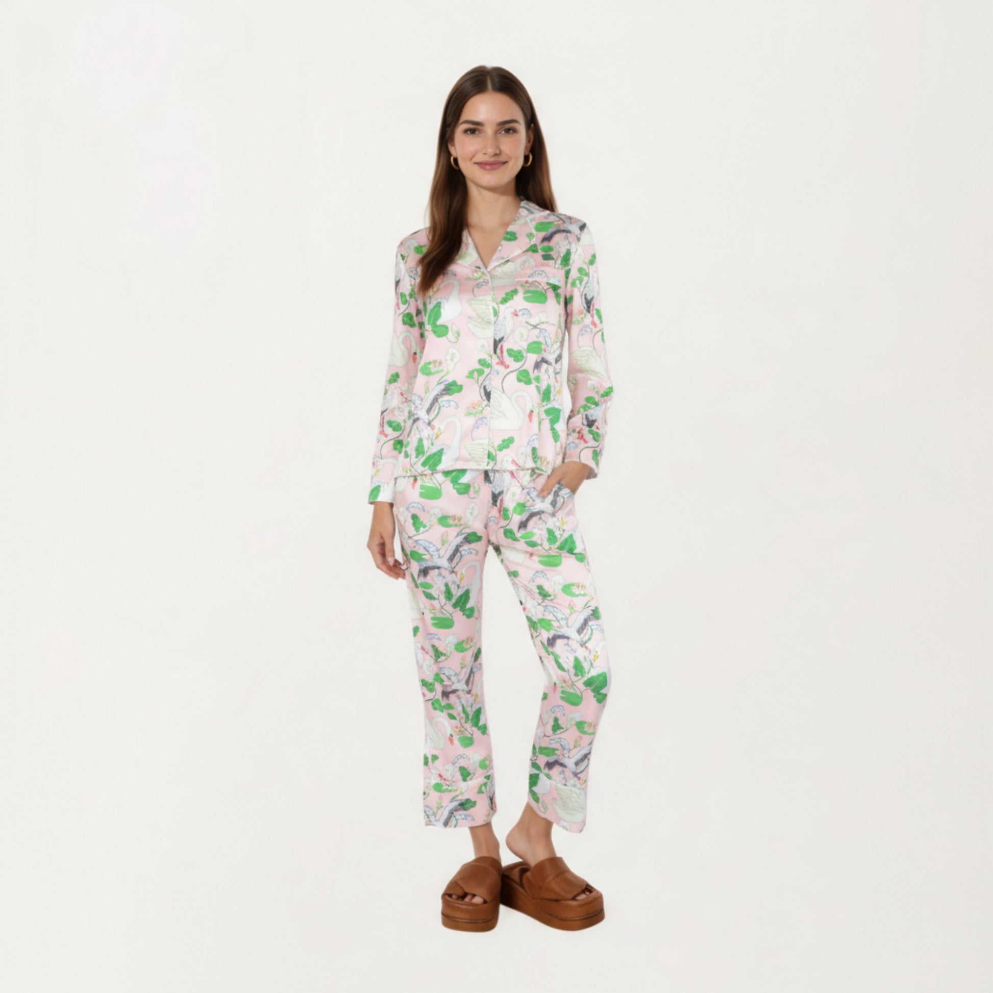 Anna-Kaci Lounge Women's 2-Piece Set Long Sleeve Button Front Pajama Set with Crane Print and Soft Silky Fabric for Relaxed Comfort