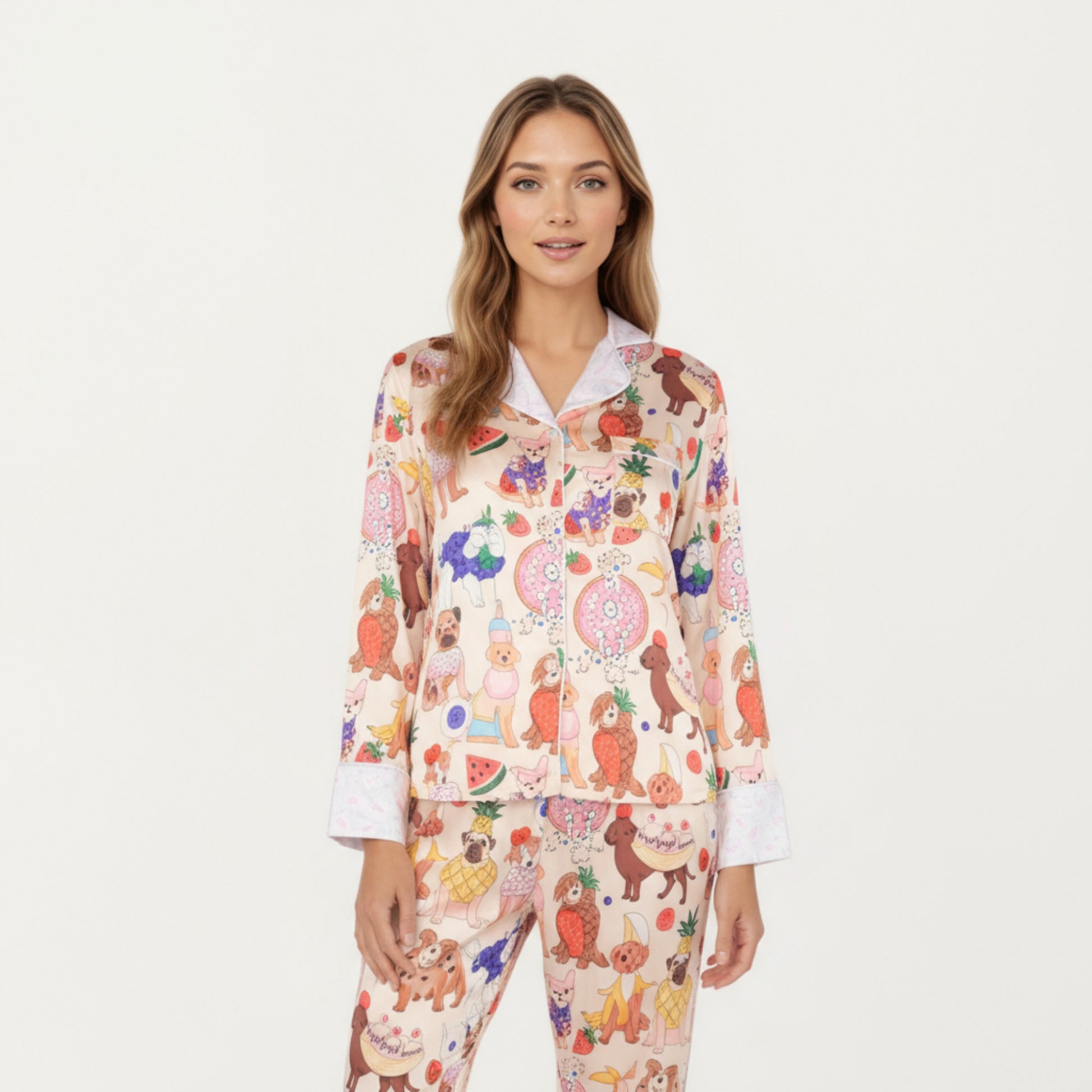 The Anna-Kaci Women's 2-Piece Set Long Sleeve Button Front Top and Relaxed Fit Pants Pajama Set combines playful design with all-night comfort. Featuring a fun dog print on smooth, silky fabric, this set includes a classic long sleeve button-front top and matching relaxed-fit pants. Perfect for lounging or bedtime, it offers a lightweight, breathable feel with a charming, lively look.
