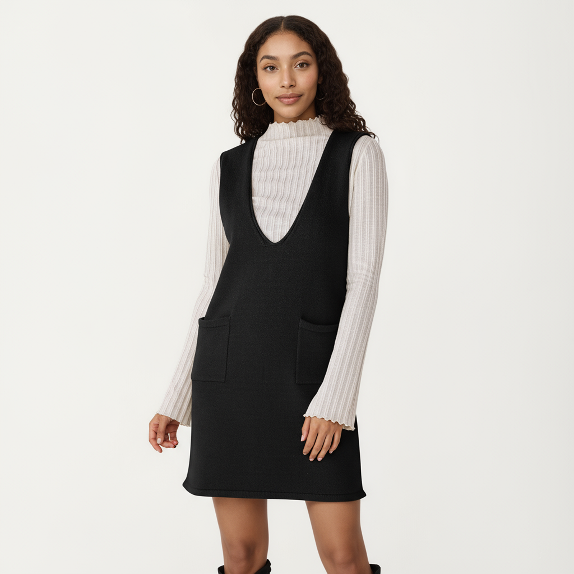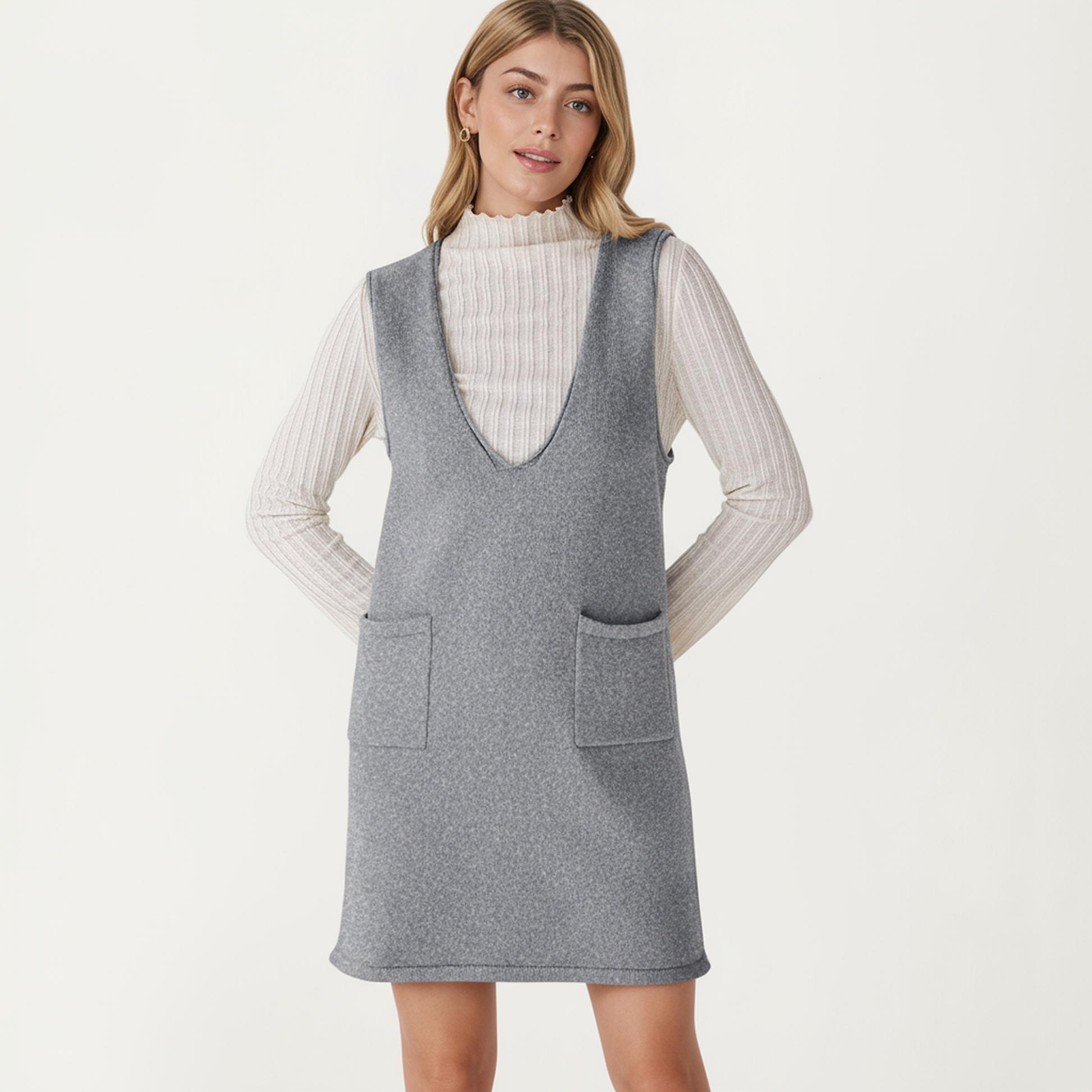 The Anna-Kaci Women's Sleeveless V-Neck Shift Dress features a minimalist silhouette with a flattering V-neckline and practical front patch pockets. Crafted from soft, comfortable fabric, this versatile dress is perfect for layering over turtlenecks or blouses for a chic, polished look. Its relaxed fit offers effortless style for any occasion.