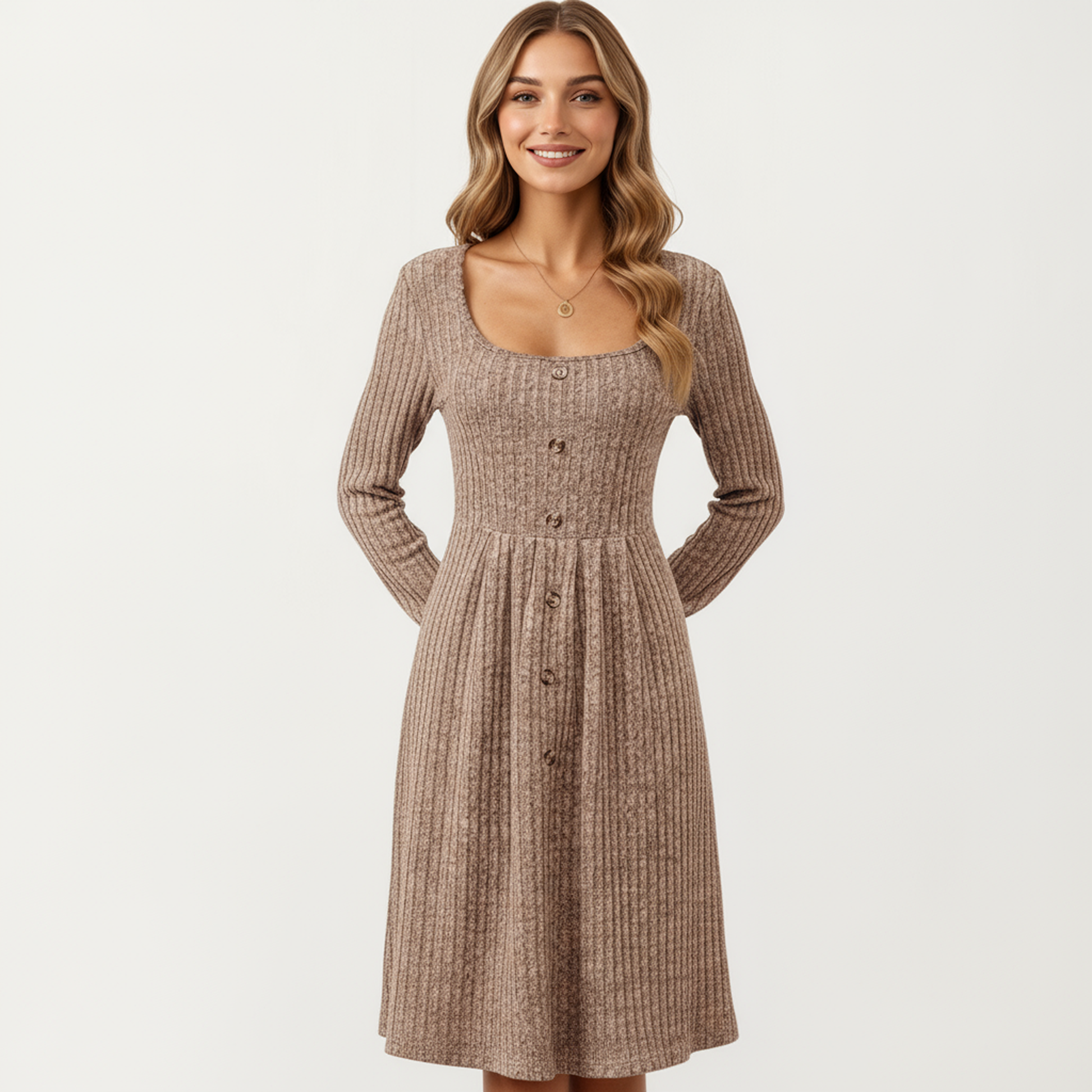 The Anna-Kaci Women's Long Sleeve Ribbed Knit A-Line Dress combines elegance and comfort with its soft ribbed knit fabric and flattering A-line silhouette. Designed with a classic scoop neckline and button front accents, this dress offers a timeless look that can be styled for any occasion. The long sleeves and stretchy material ensure ease of movement while maintaining a polished appearance.