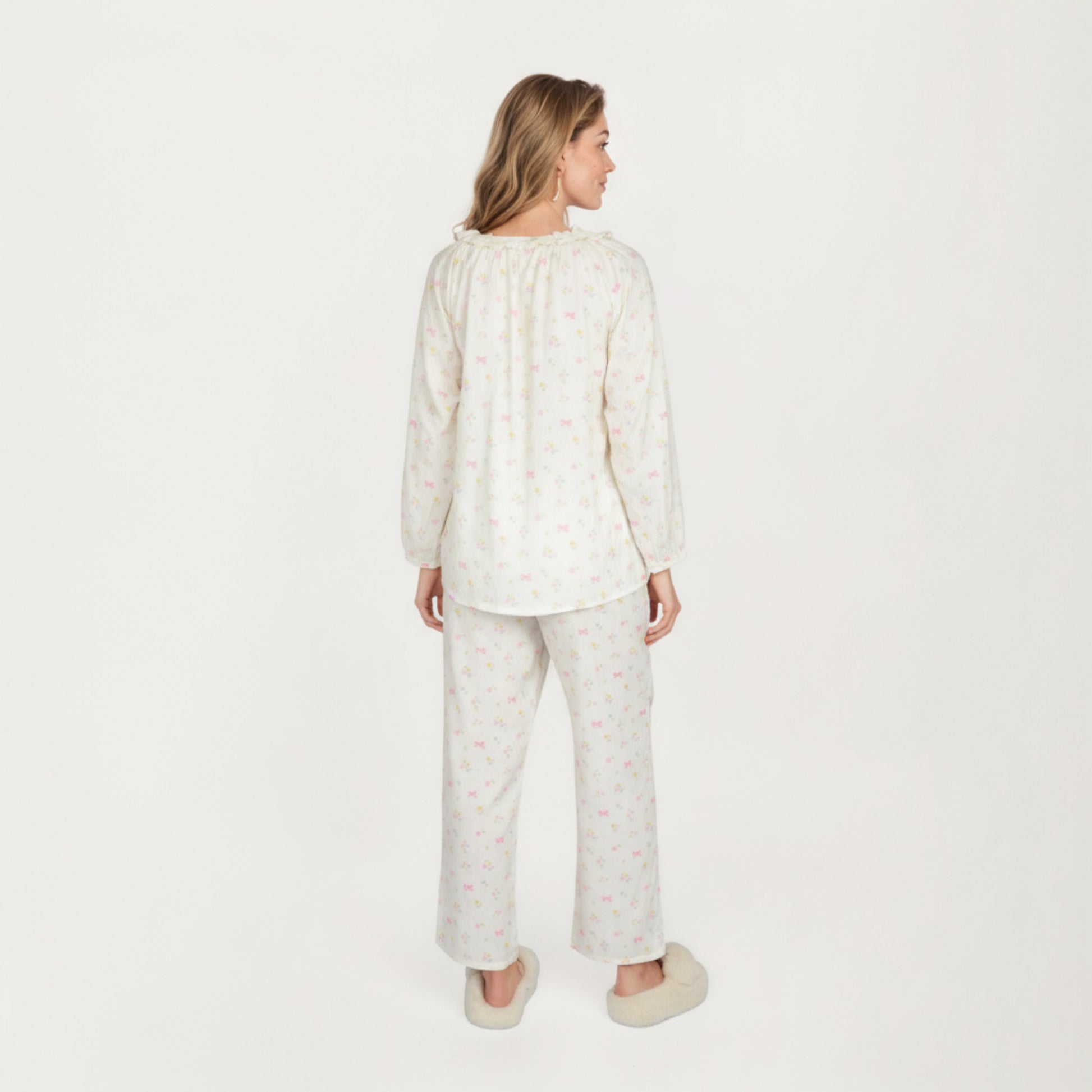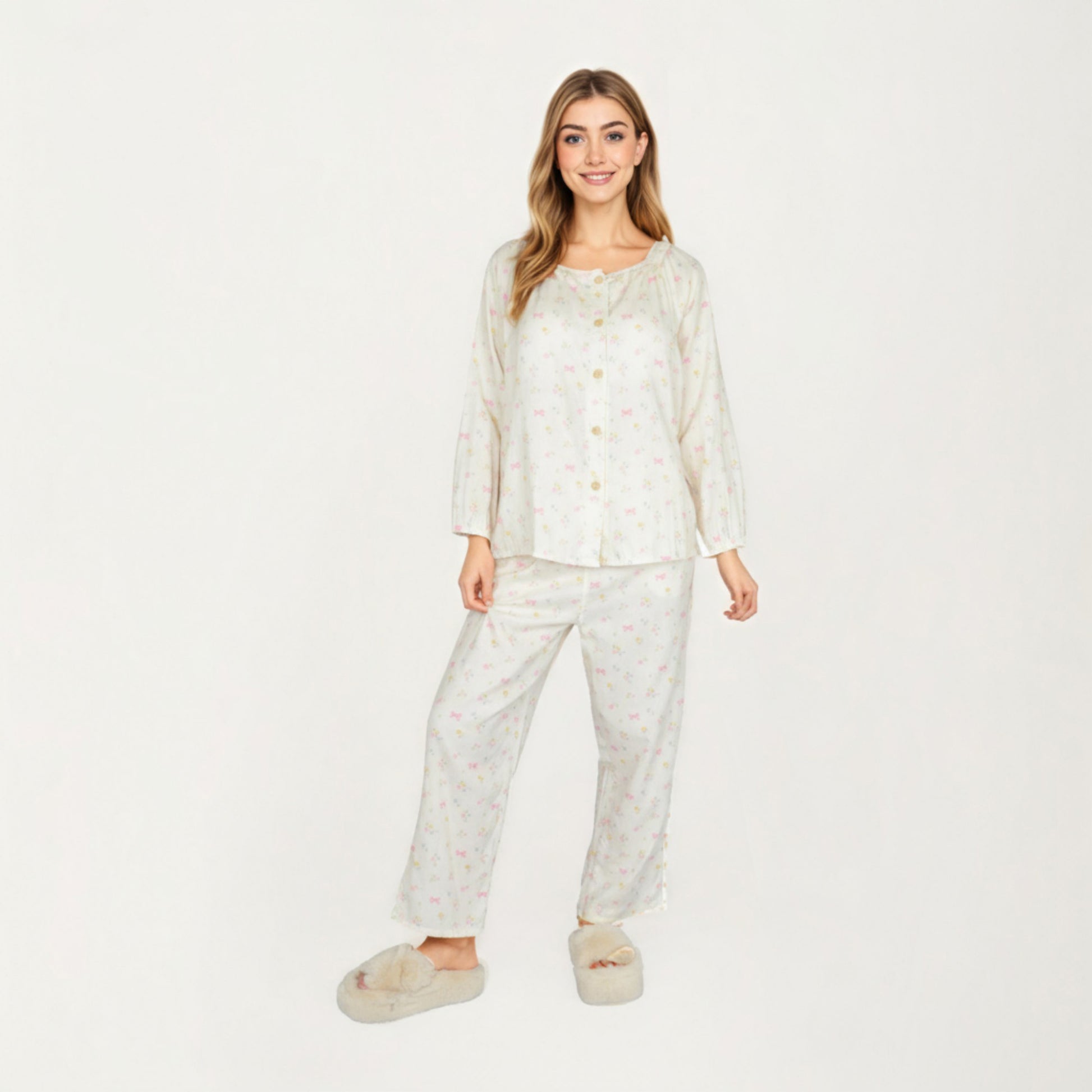The Anna-Kaci Women's 2-Piece Set Long Sleeve Button Front Top with Built-In Chest Pads and Relaxed Fit Pants Pajama Set combines feminine charm with everyday comfort. Designed with a delicate floral print, this set includes a long sleeve button-front top with built-in chest pads and matching relaxed fit pants made from soft, breathable fabric. Perfect for lounging, sleeping, or casual mornings, it offers convenience, coverage, and style in one.