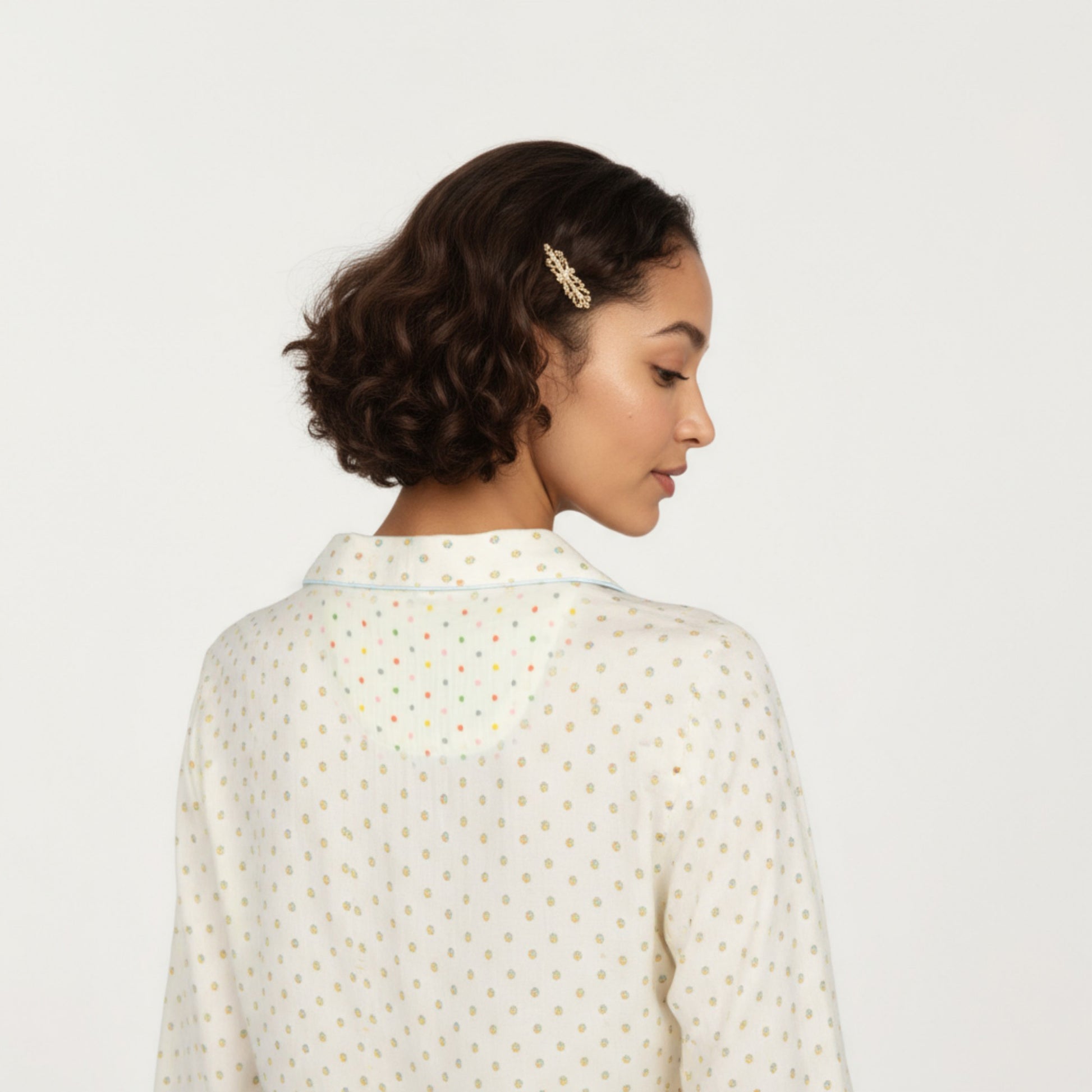 The Anna-Kaci Women's 2-Piece Set Long Sleeve Button Front Top and Relaxed Fit Pants Pajama Set combines timeless comfort with playful charm. Designed with a classic button-front long sleeve top and elastic waist relaxed fit pants, this set features a delicate polka dot print on soft, breathable fabric. Perfect for lounging or bedtime wear, it offers a cozy yet stylish sleepwear option.
