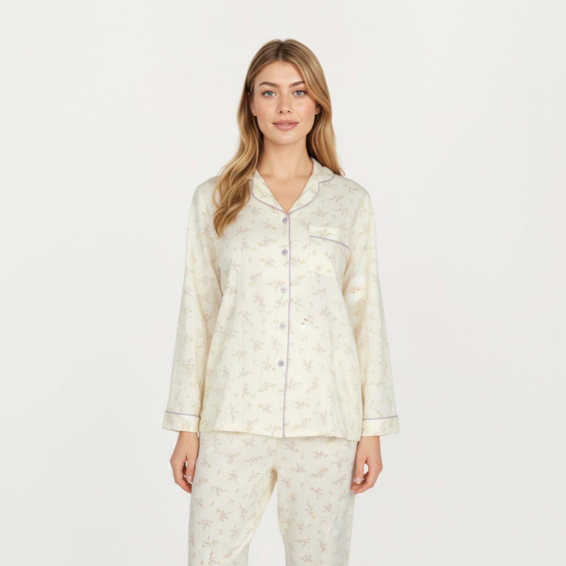 The Anna-Kaci Women's 2-Piece Set Long Sleeve Button Front Top and Relaxed Fit Pants Pajama Set brings comfort and charm to your sleepwear. Featuring a delicate floral print, this set includes a button-front long sleeve top paired with elastic waist relaxed fit pants. Crafted from soft, breathable fabric, it ensures both style and ease for lounging or sleeping.