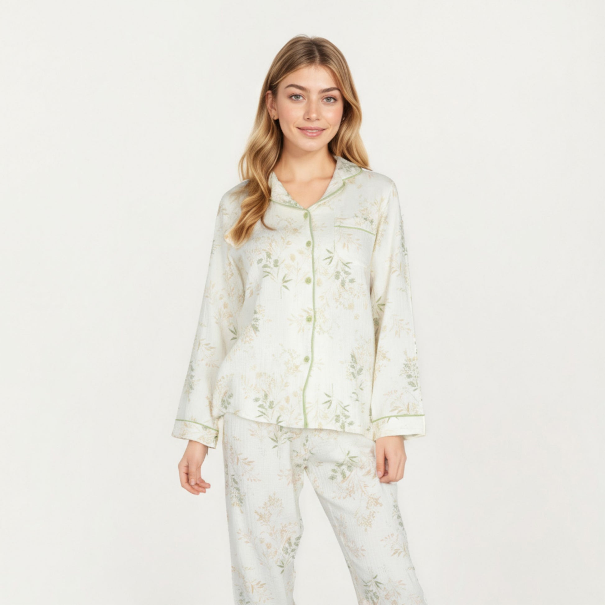 The Anna-Kaci Women's 2-Piece Set Long Sleeve Button Front Top and Relaxed Fit Pants Pajama Set combines comfort with natural elegance. Featuring a soft botanical print on breathable fabric, the set includes a classic button-front long sleeve top and relaxed fit pants with an elastic waistband. Perfect for lounging or bedtime, it brings a cozy yet stylish touch to your sleepwear collection.