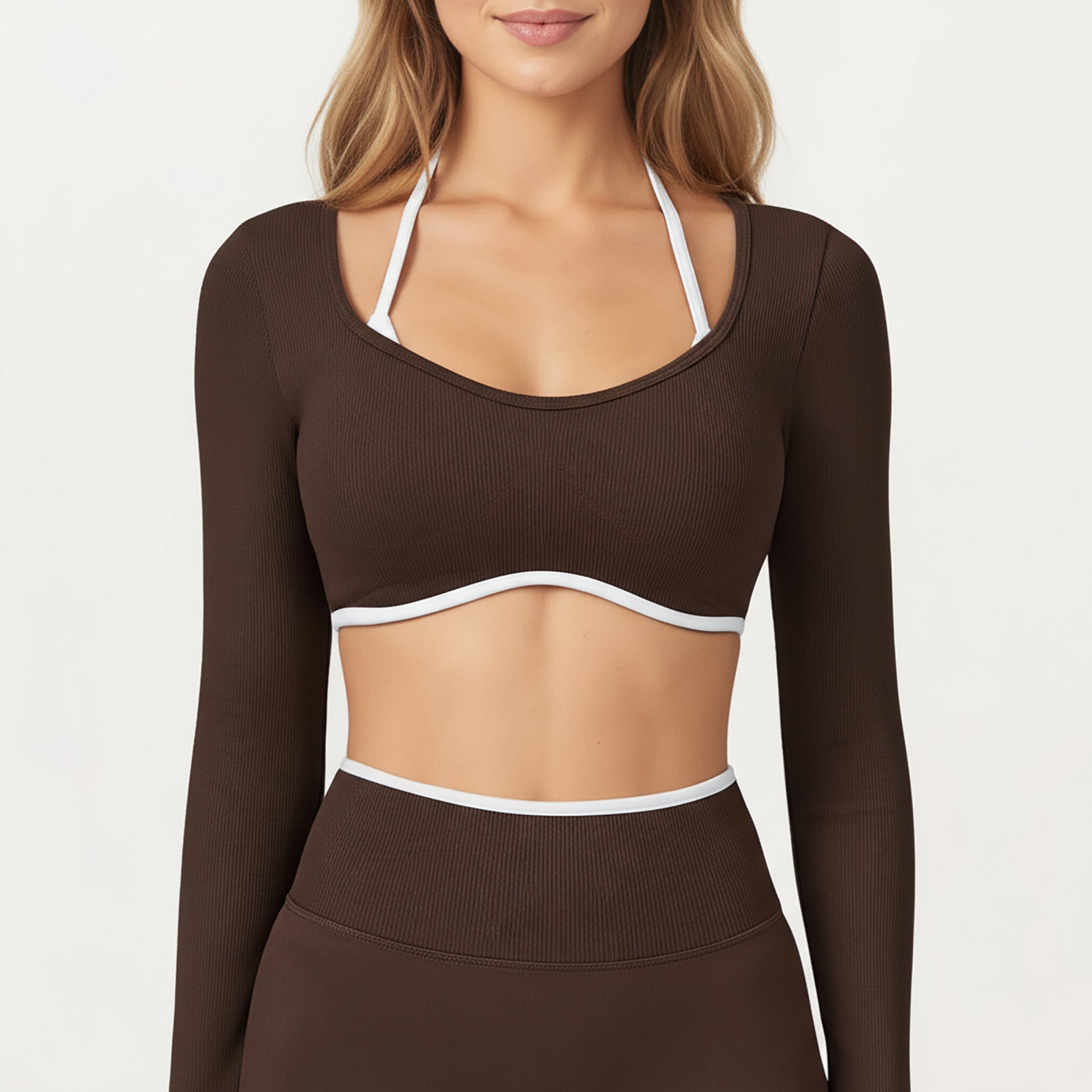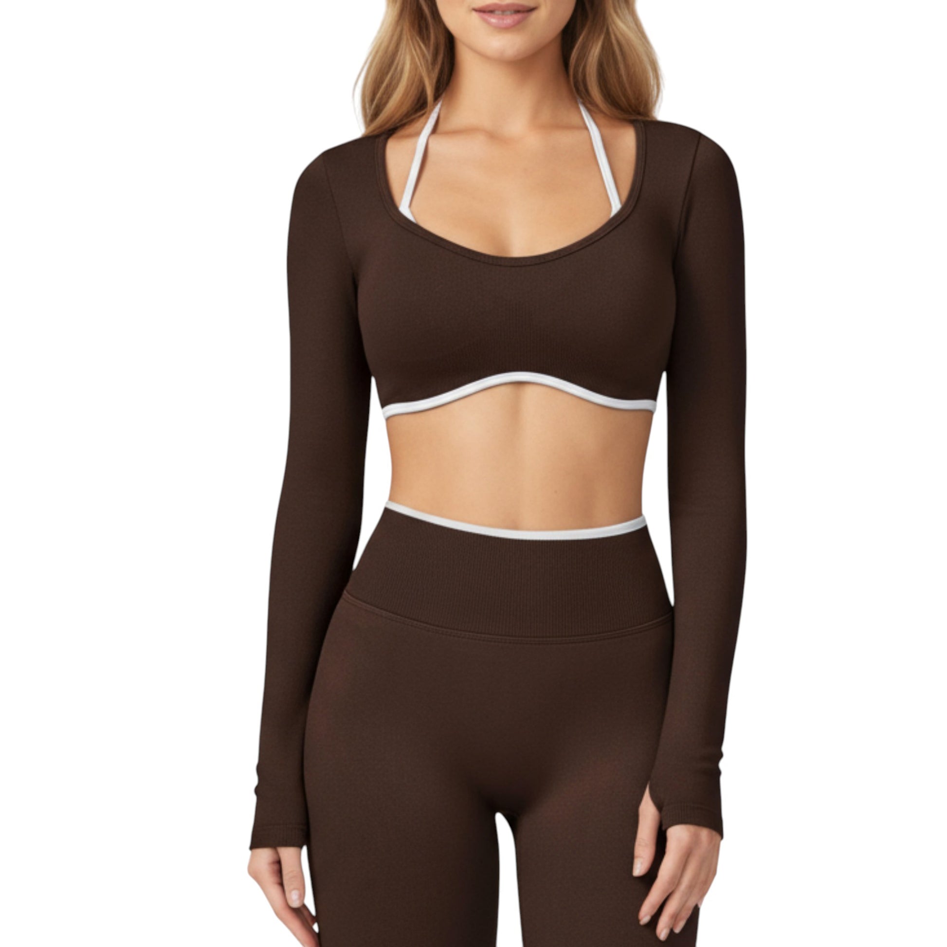 Anna-Kaci Active Women's Long Sleeve Crop Top with Contrast Trim and Scoop Neckline