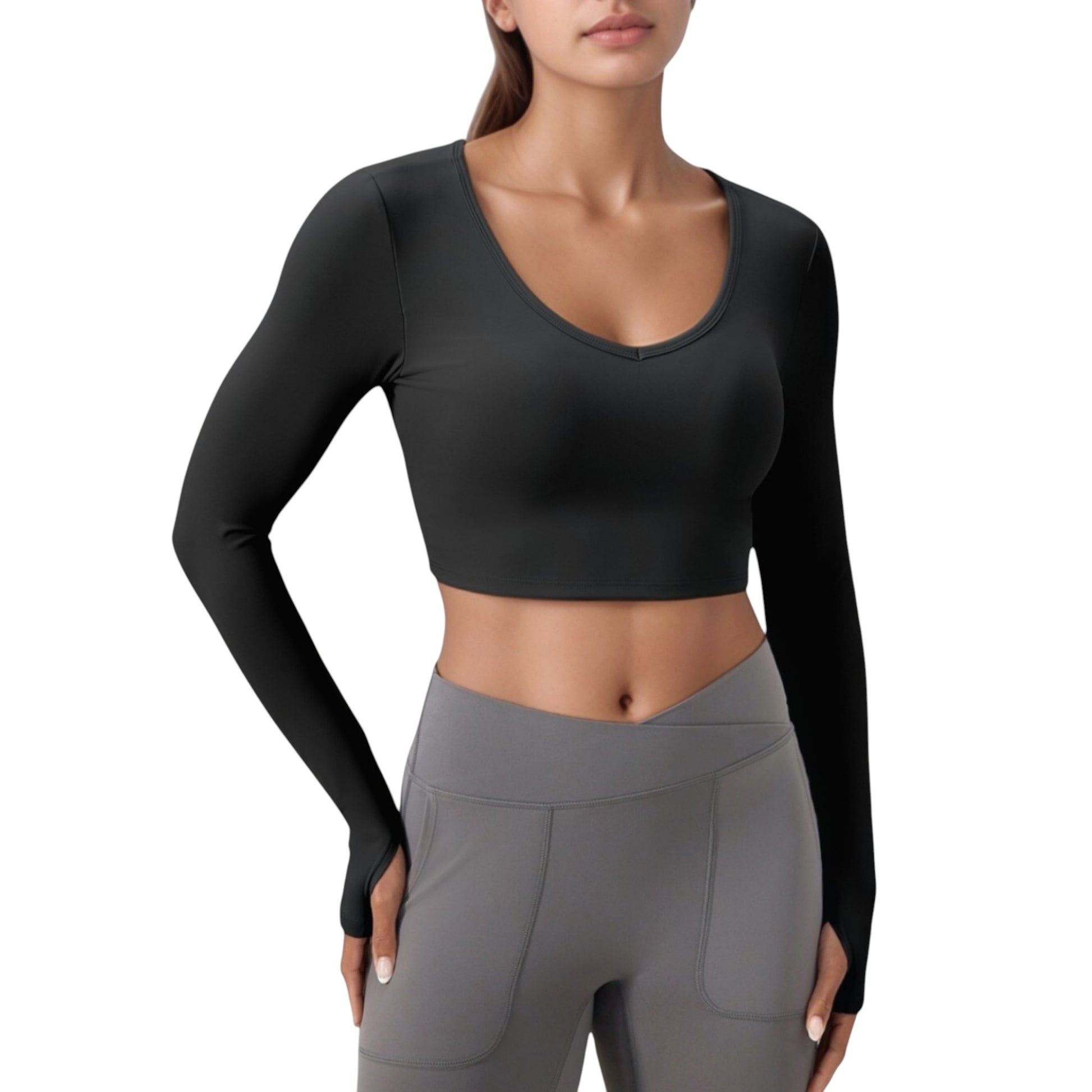 Anna-Kaci Active Women's Long Sleeve V-Neck Cropped Active Top with Thumbhole Cuffs and Stretch Fit for Workouts