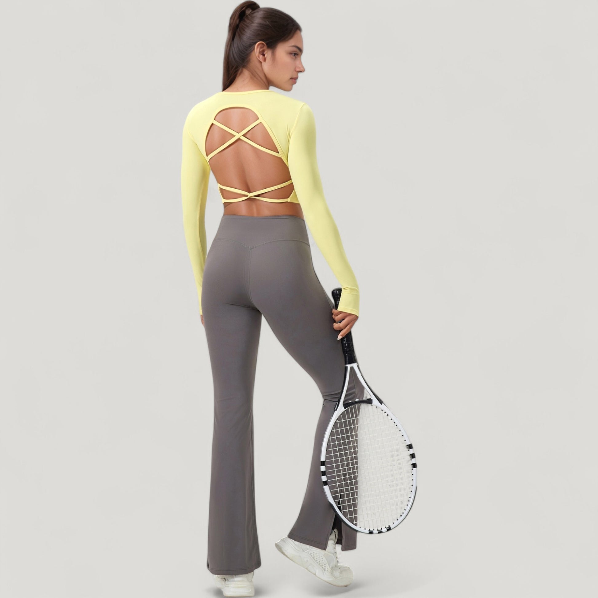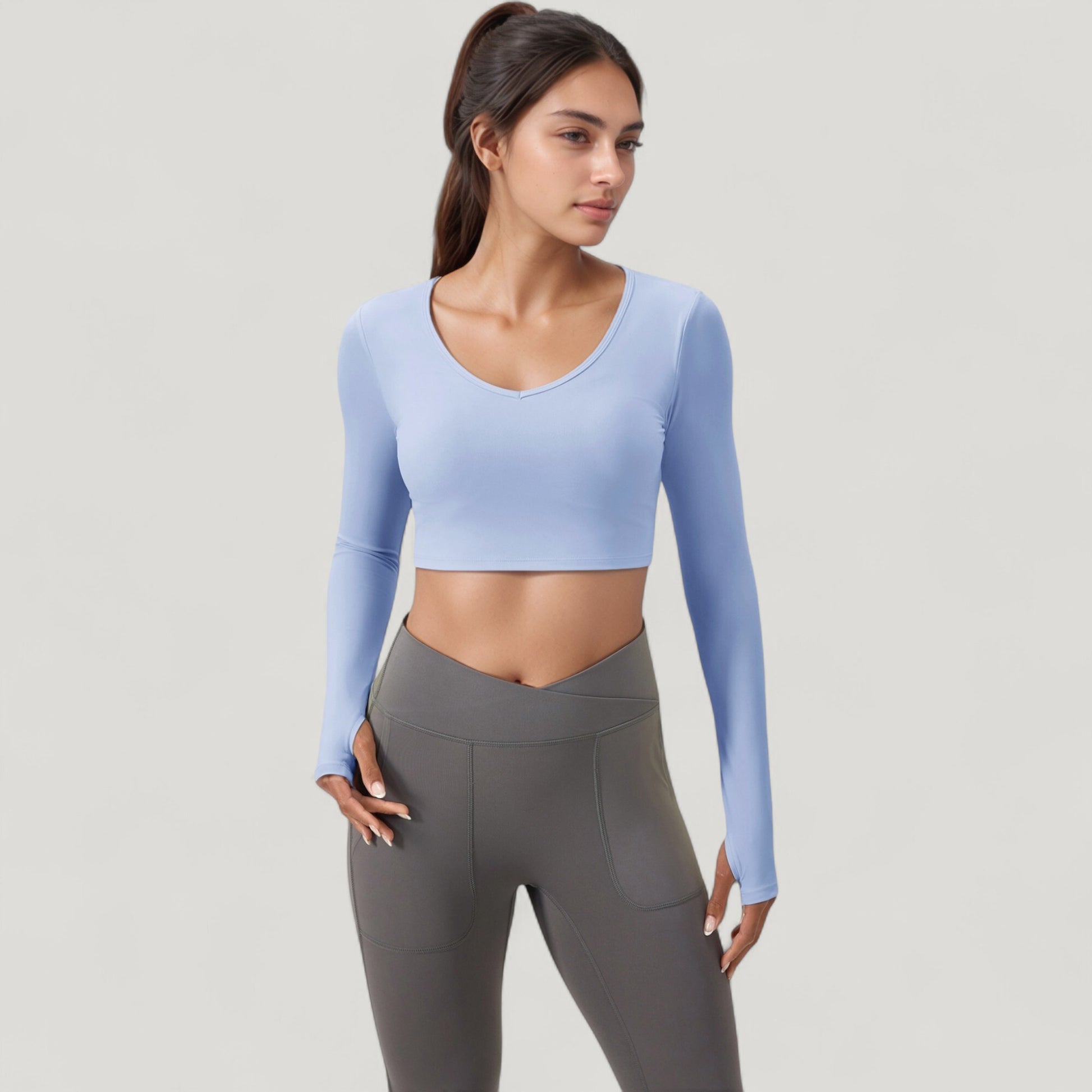 The Anna-Kaci Women's Long Sleeve Cropped Active Top blends sleek style with functional comfort. Designed with a flattering V-neckline and a modern cropped silhouette, this top features thumbhole cuffs for added security and warmth during activities. The soft, stretchy fabric ensures ease of movement, making it perfect for workouts, yoga sessions, or athleisure wear.
