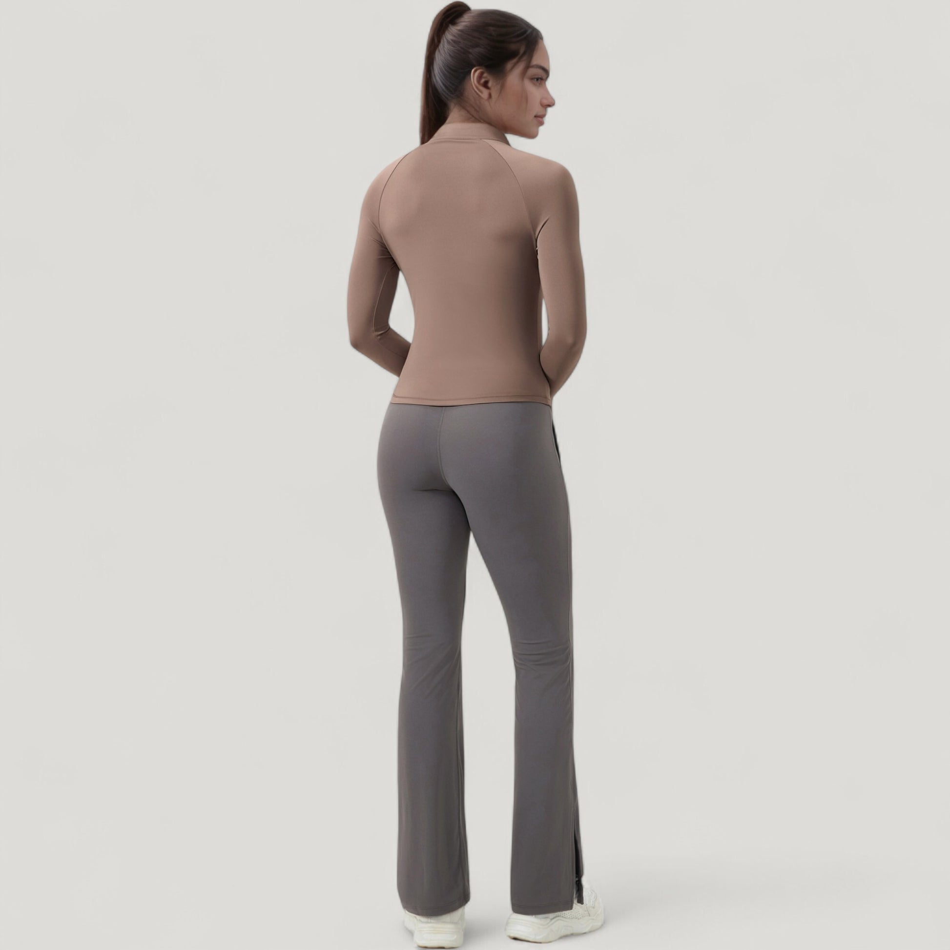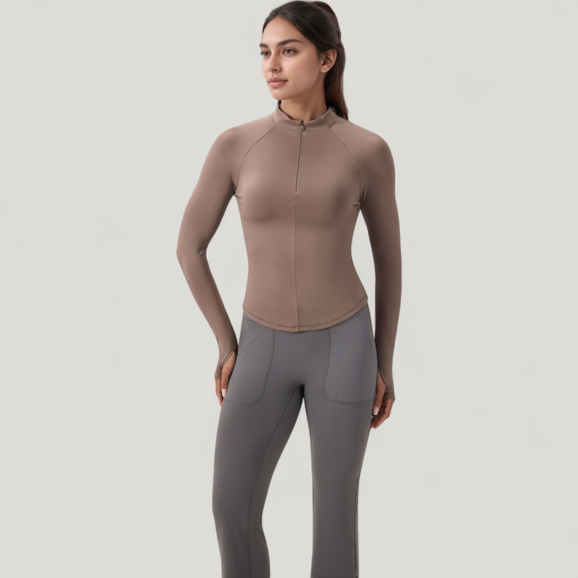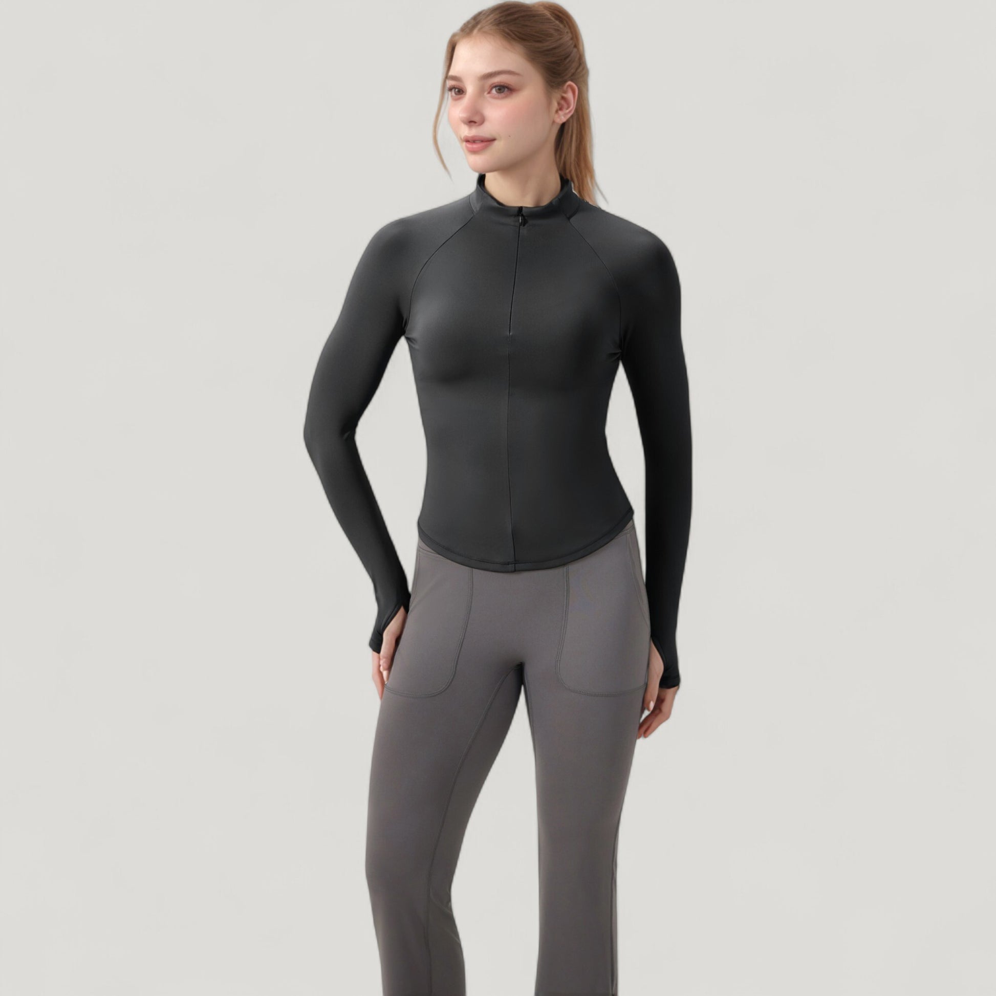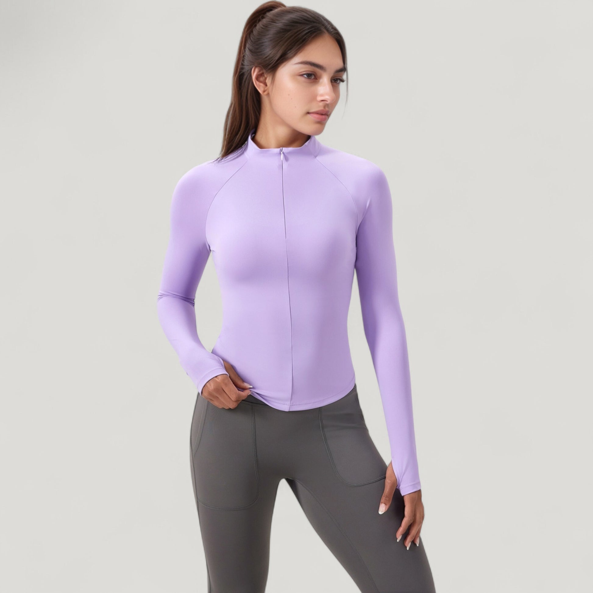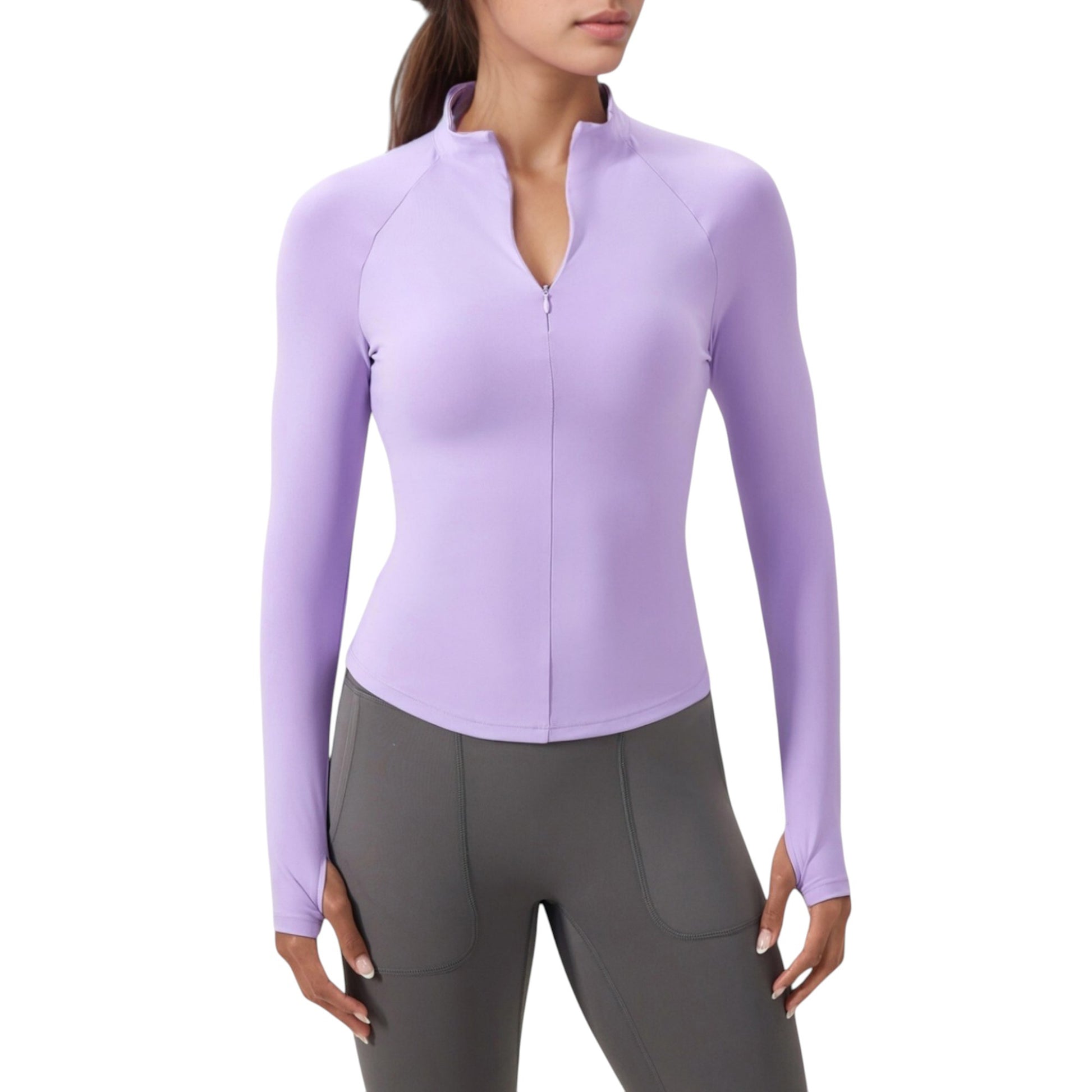 The Anna-Kaci Women's Long Sleeve Half-Zip Active Jacket offers a sleek, performance-ready design with a flattering slim-fit silhouette. Featuring a mock neck for added coverage, this jacket includes a half-zip closure for adjustable ventilation and thumbhole cuffs to keep sleeves in place during movement. Crafted from lightweight, stretchy performance fabric, it provides comfort, flexibility, and a polished look for workouts or casual outings.