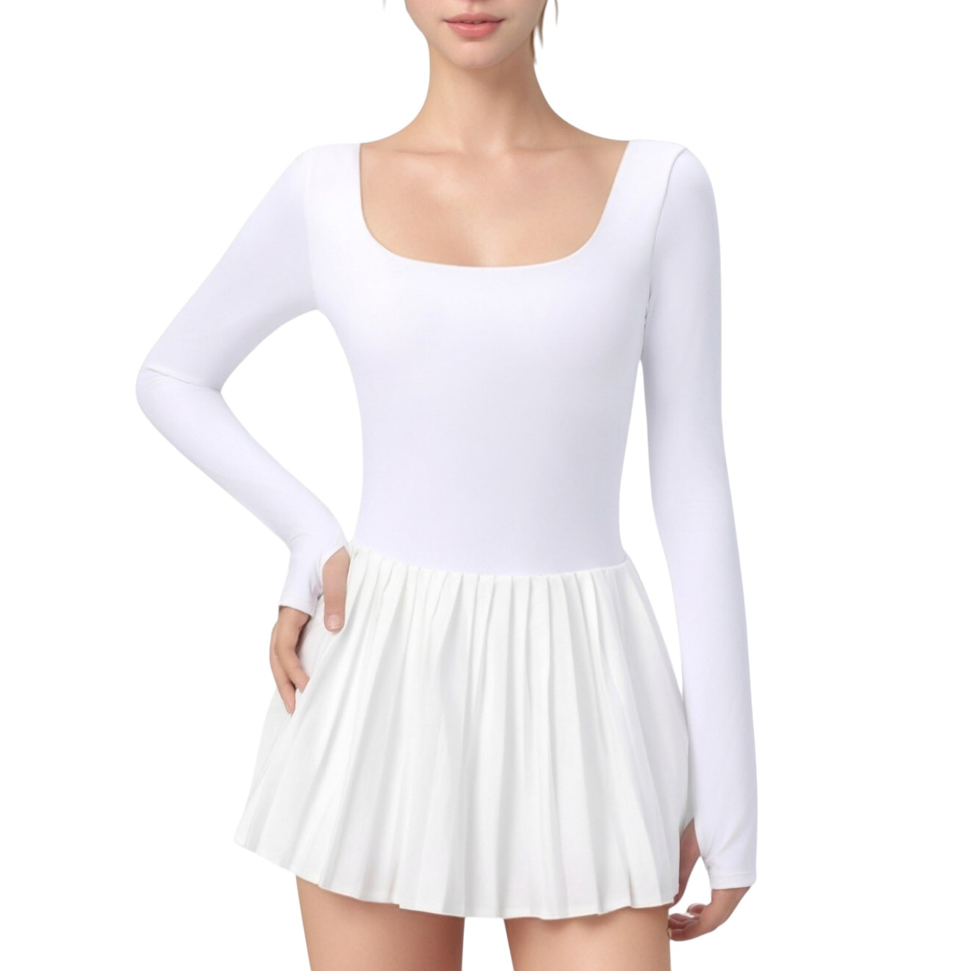 Anna-Kaci Active Women's Long Sleeve Pleated Skirt Active Dress with Scoop Neckline