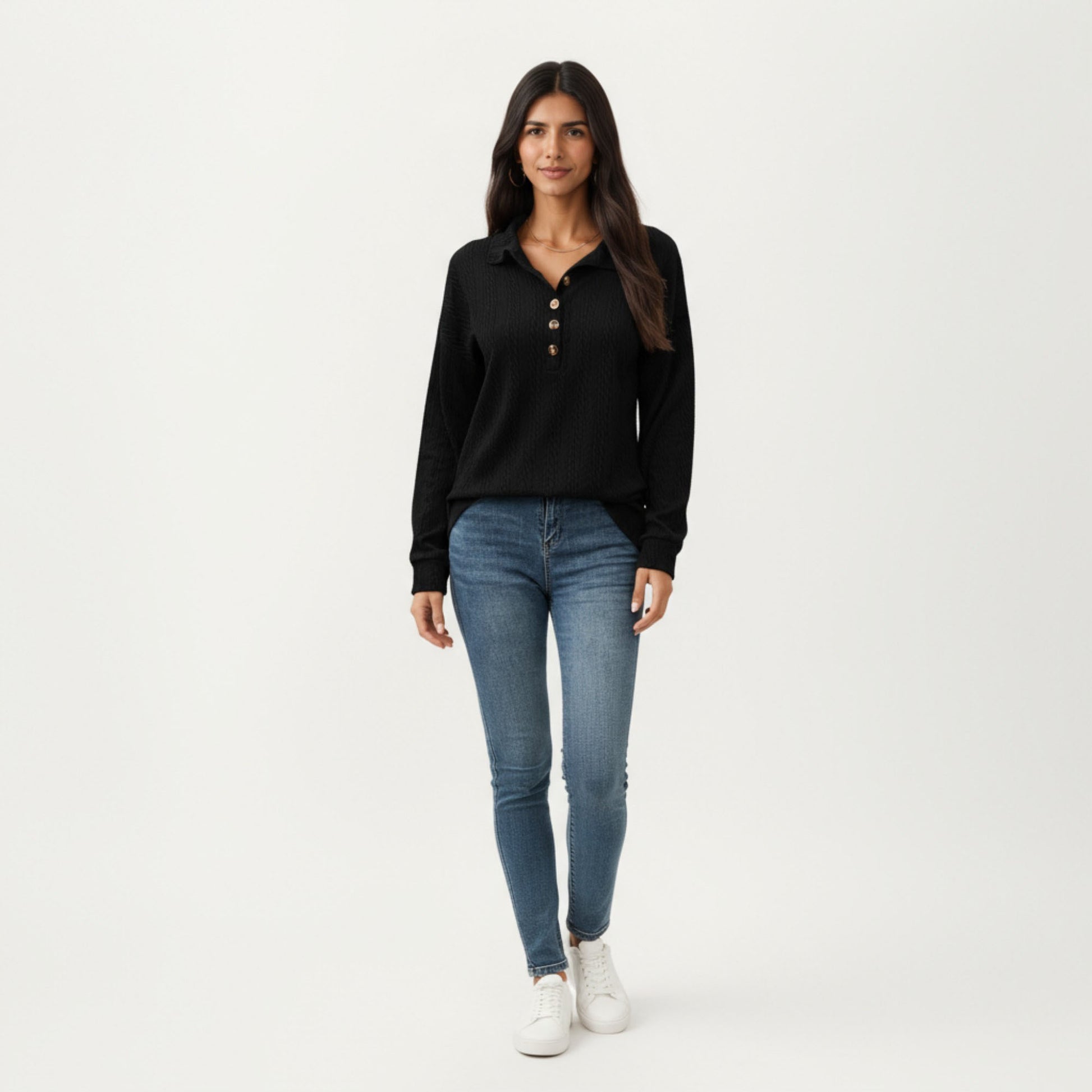 Anna-Kaci Women's Collared Long Sleeve Button-Up Top with Textured Knit Design