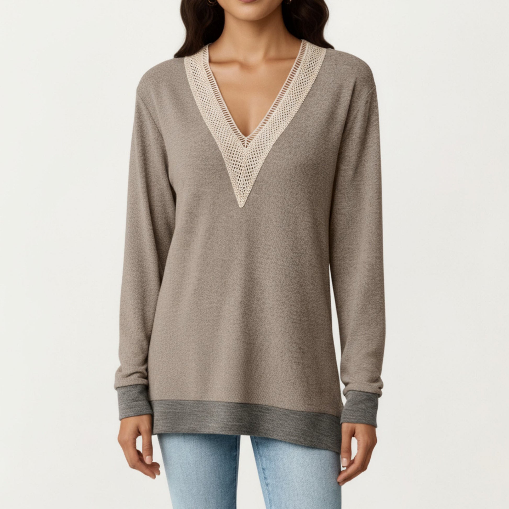 Anna-Kaci Women's Long Sleeve V-Neck Top with Contrast Crochet Trim and Relaxed Hem