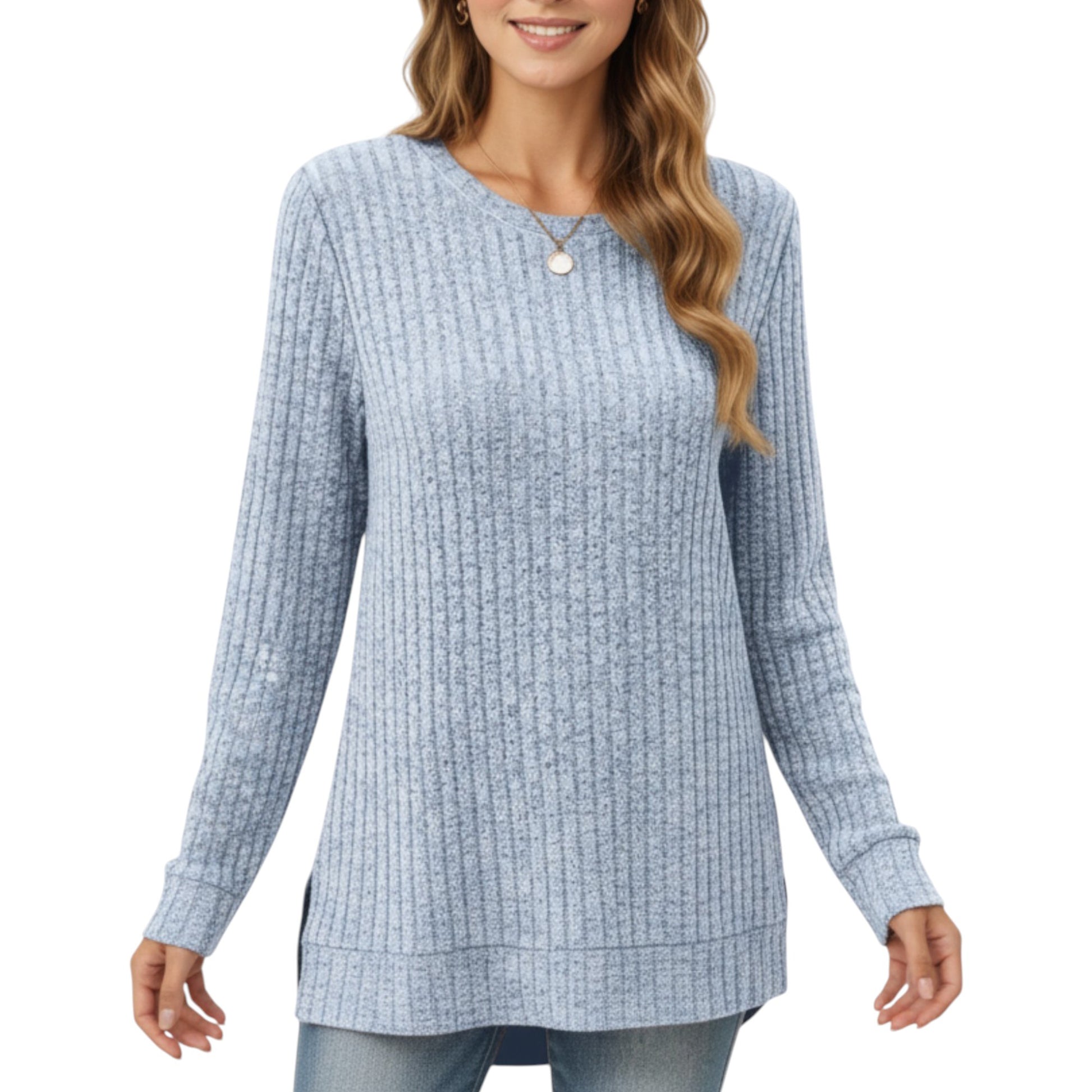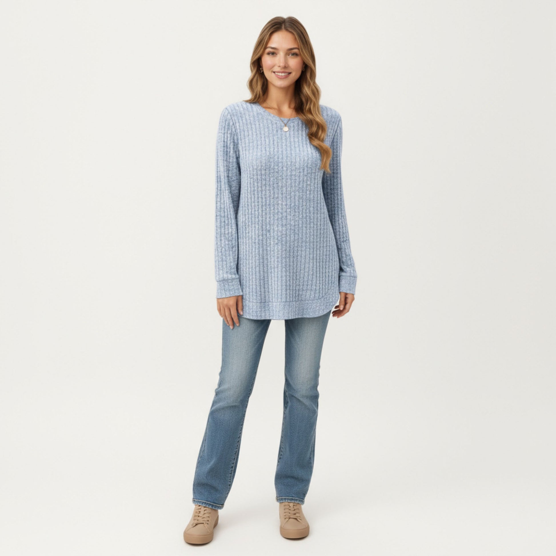 Anna-Kaci Women's Long Sleeve Ribbed Knit Top with Rounded Hem and Relaxed Fit
