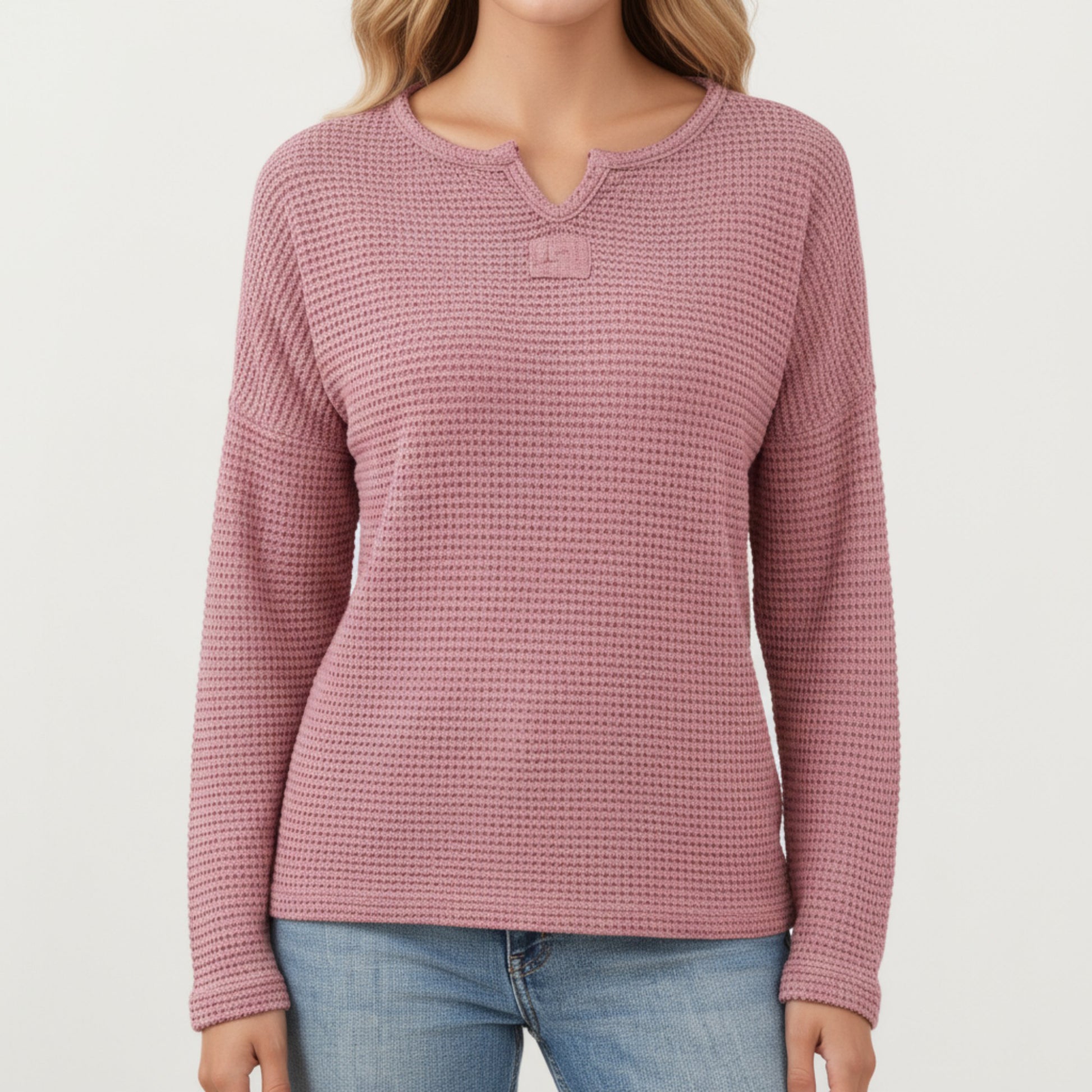 Anna-Kaci Women's Long Sleeve Textured Knit Pullover Top with Split Neck and Relaxed Fit