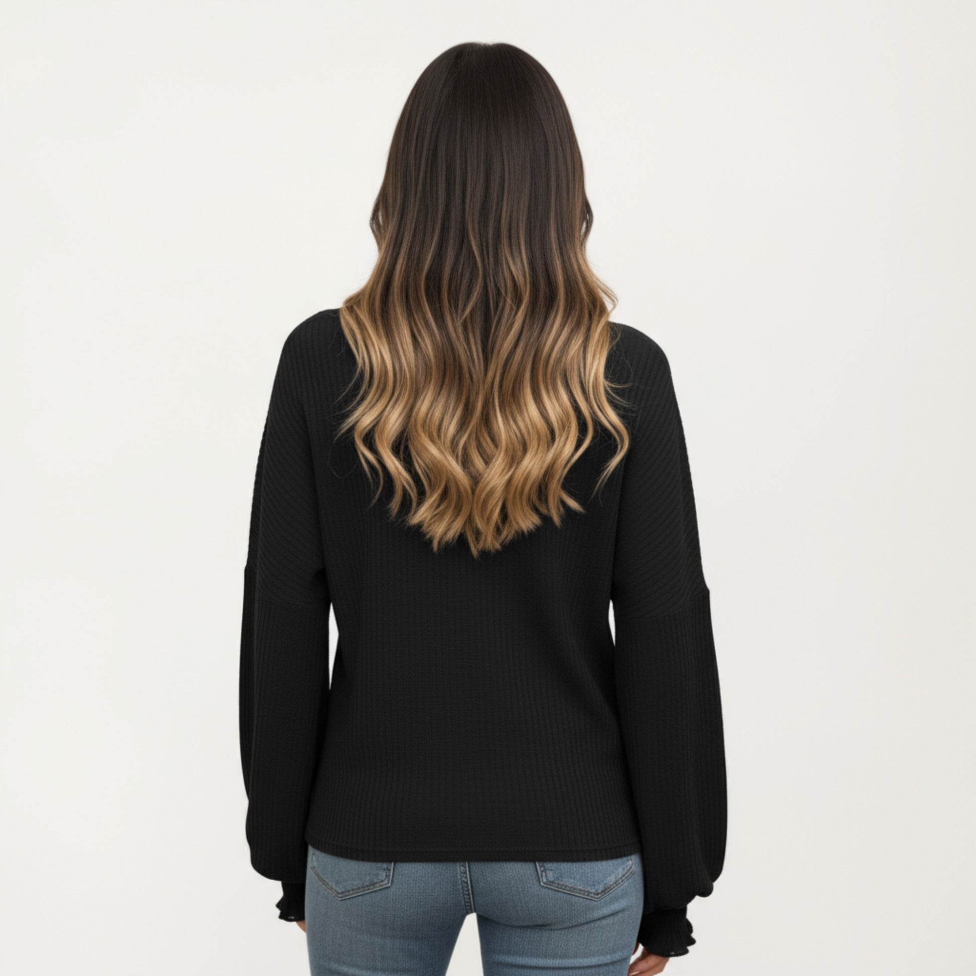 The Anna-Kaci Women's Long Sleeve Ribbed Knit Top combines a classic silhouette with delicate details. Featuring a soft ribbed texture and feminine ruffle cuffs, this top offers a comfortable yet polished style. Perfect for layering or wearing on its own, it pairs effortlessly with jeans, skirts, or tailored pants for versatile outfits.