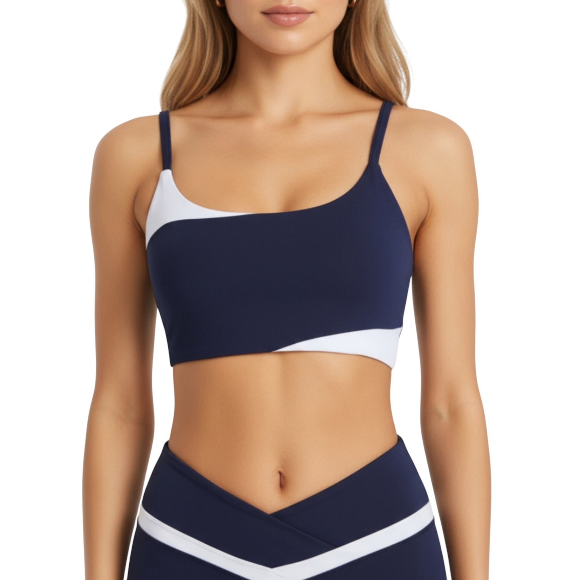 The Anna-Kaci Women's Asymmetrical Neck Colorblock Sports Bra blends sleek design with supportive comfort. Featuring a modern asymmetrical neckline with a shoulder strap on each side, this sports bra delivers a balanced and stylish silhouette. The smooth, stretchy fabric ensures flexibility and ease of movement, while the colorblock pattern adds a bold, dynamic touch. Perfect for yoga, workouts, or casual wear, it combines contemporary fashion with everyday functionality.