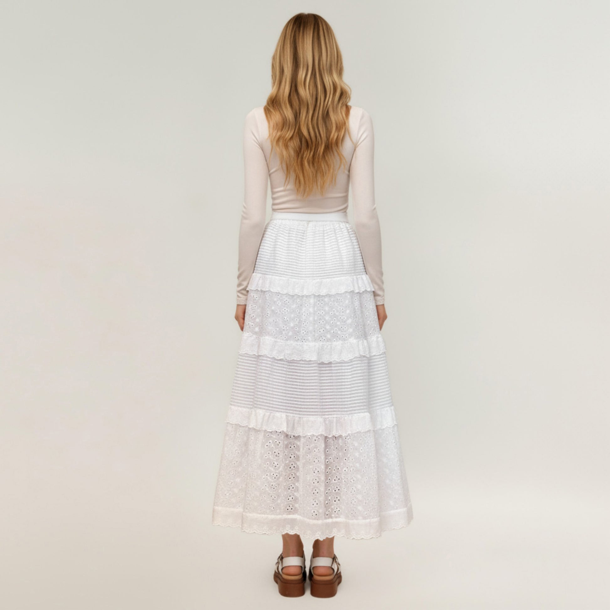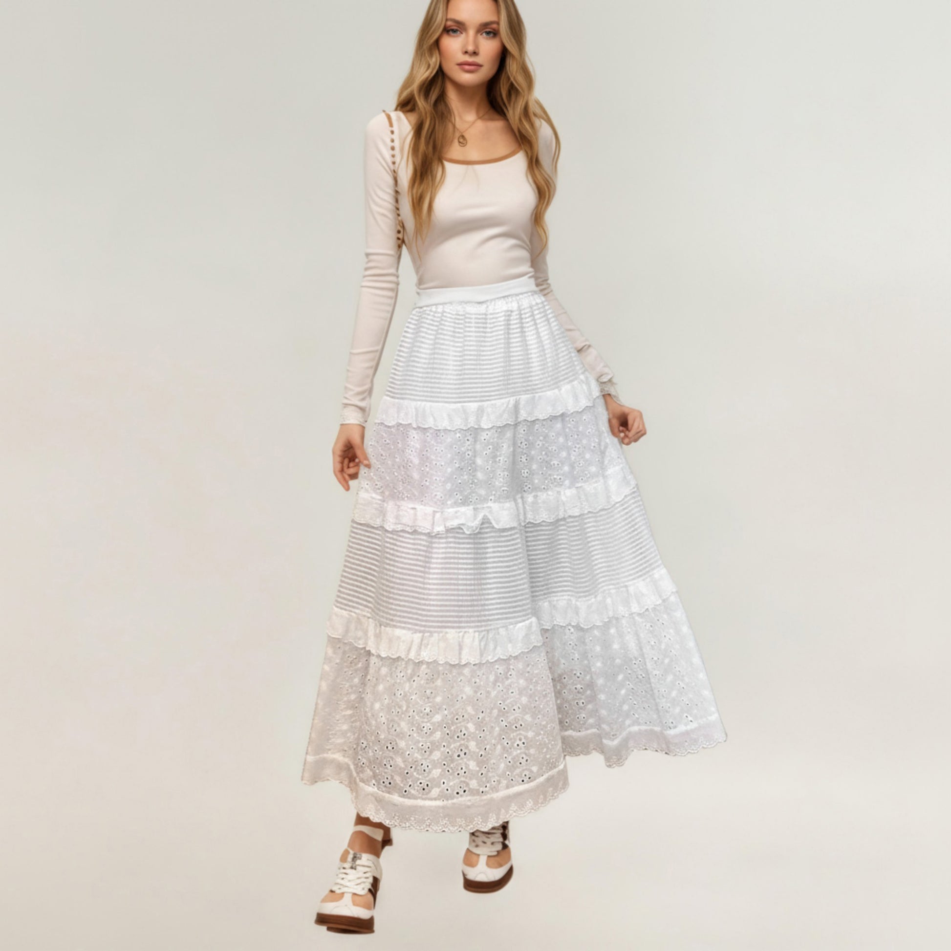 The Anna-Kaci Women's Tiered Maxi Skirt blends classic elegance with a soft, romantic charm. Designed with alternating lace eyelet panels and textured stripe sections, this skirt offers beautiful contrast and depth. Its tiered construction creates graceful movement, while the full-length silhouette flatters effortlessly. Crafted from lightweight, breathable fabric, it¡¯s ideal for pairing with fitted tops or blouses for an effortlessly refined look that transitions seamlessly through the seasons.