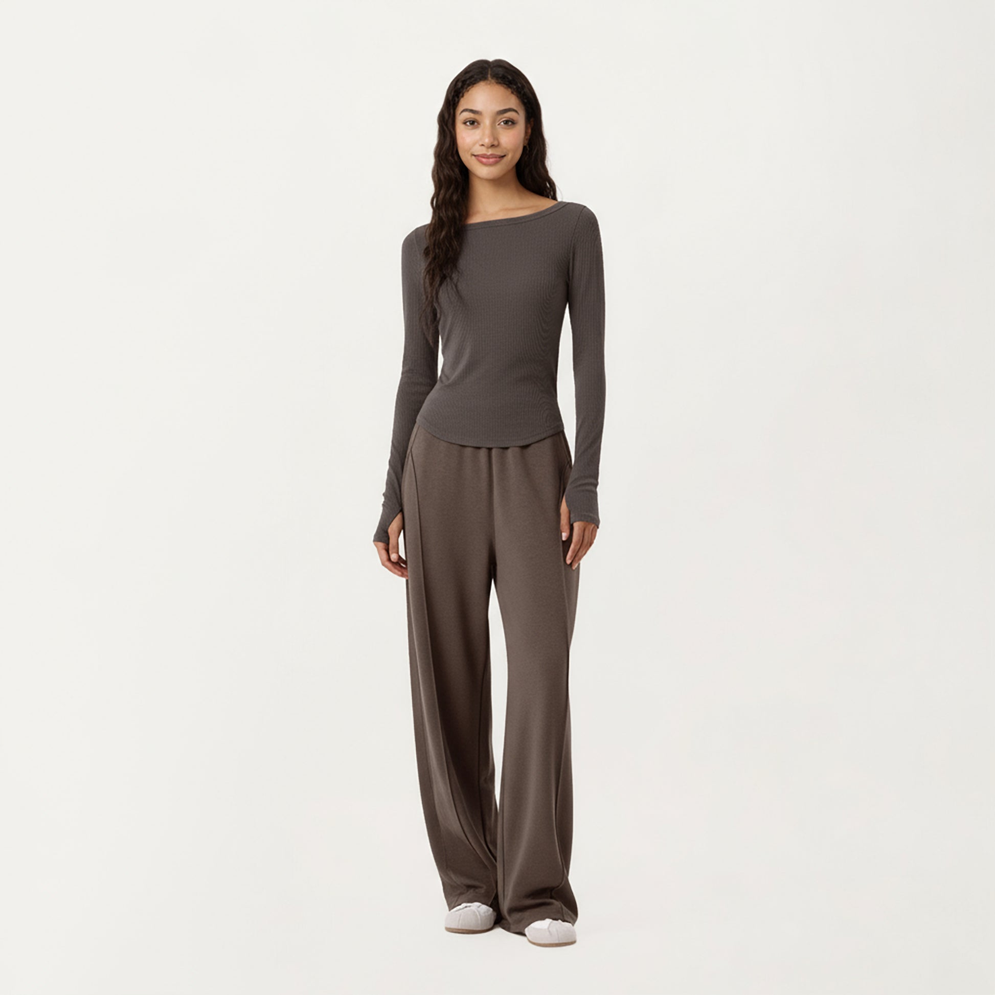 Anna-Kaci Active Women's Long Sleeve Rib Knit Top with Boat Neckline and Slim Fit Silhouette
