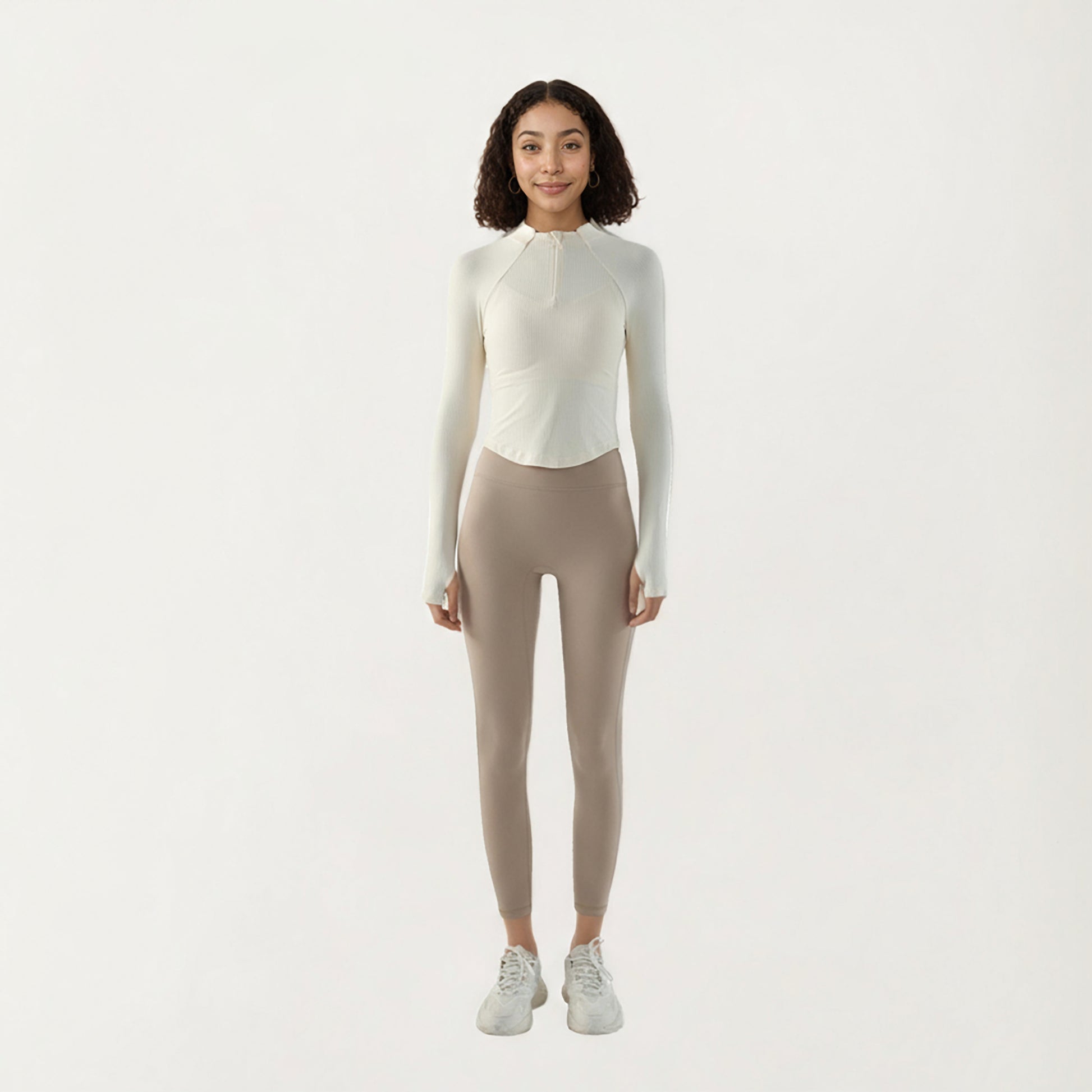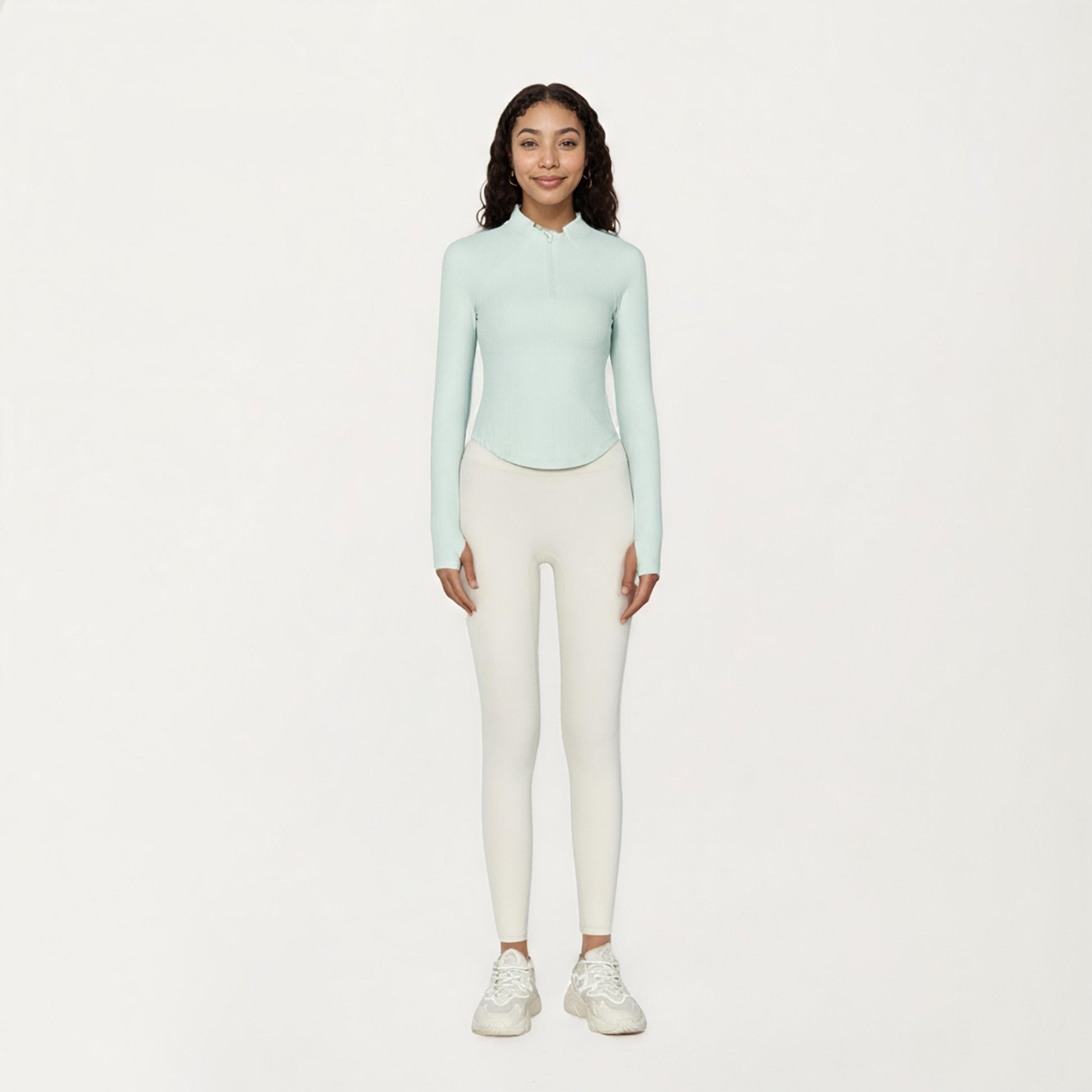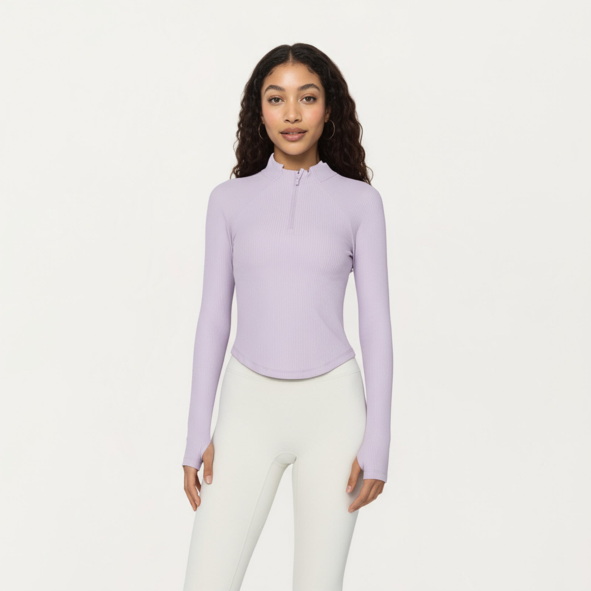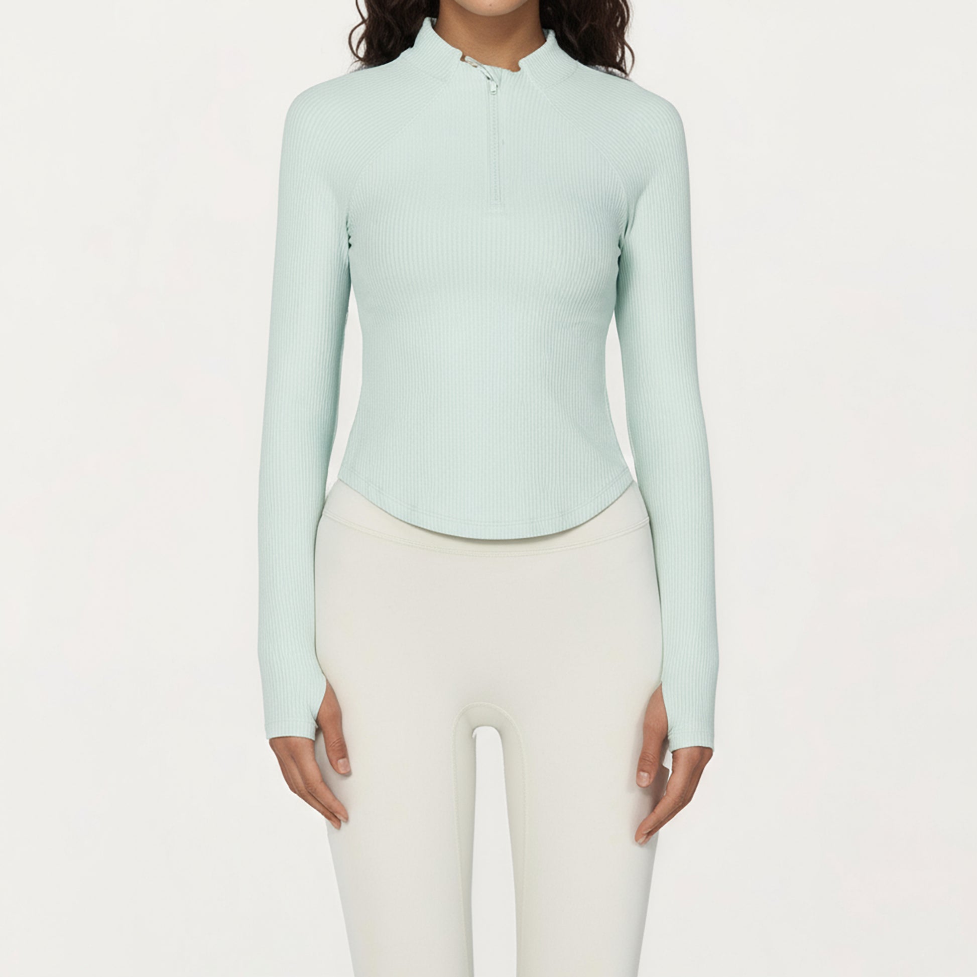 Anna-Kaci Active Women's Long Sleeve Ribbed Knit Half Zip Top with Curved Hem and Fitted Silhouette