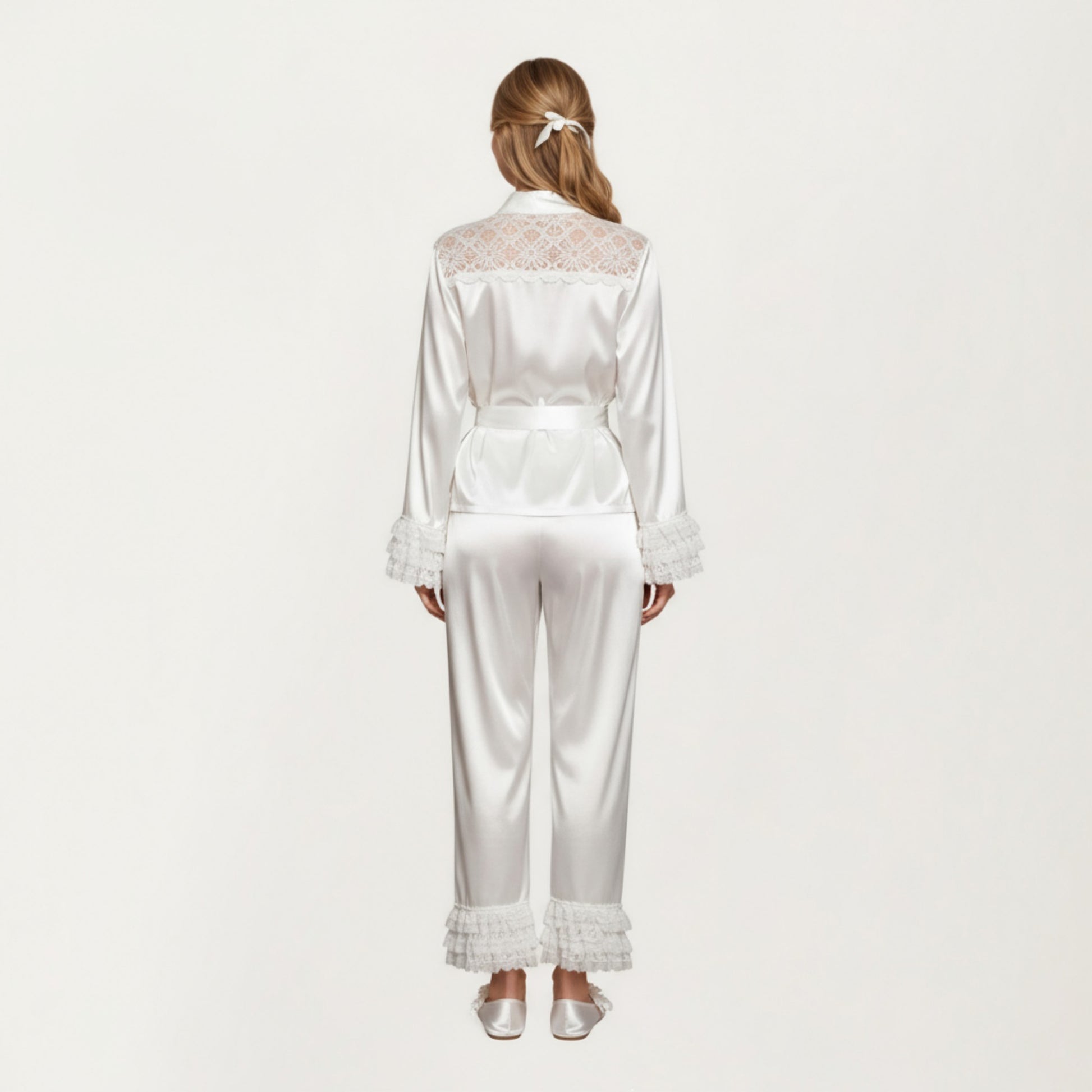 The Anna-Kaci Women's 2-Piece Set Satin Lace Trim Long Sleeve Top with Tie Waist and Ruffle Hem Pants exudes sophistication and comfort. Crafted from smooth satin fabric, the wrap-style top features delicate lace detailing and a waist tie for a flattering silhouette. Matching straight-leg pants with ruffled hems add a touch of elegance, creating a luxurious lounge look that feels as stunning as it appears.