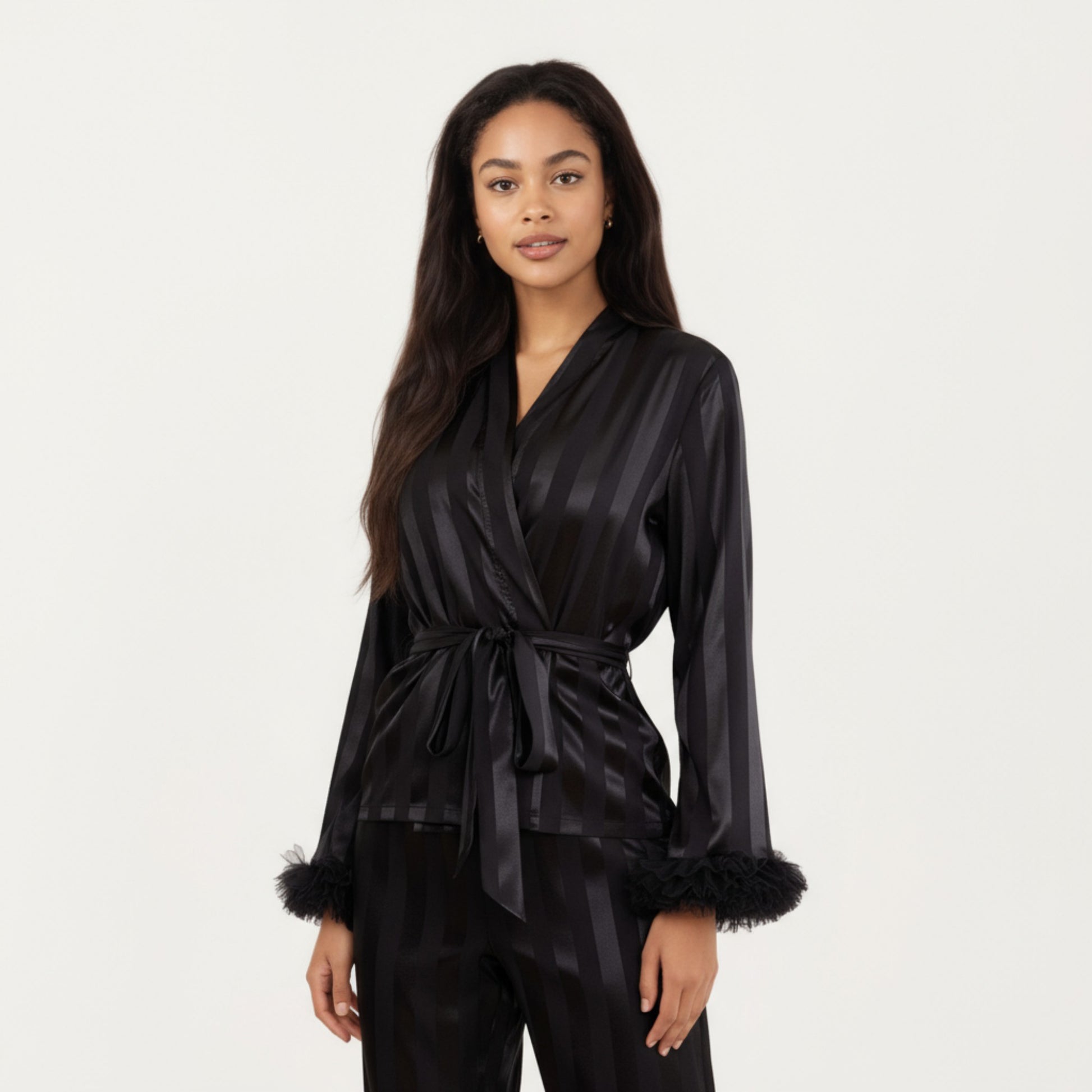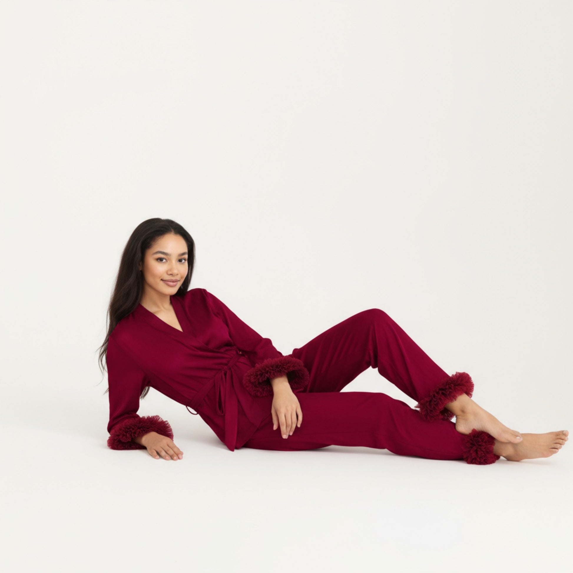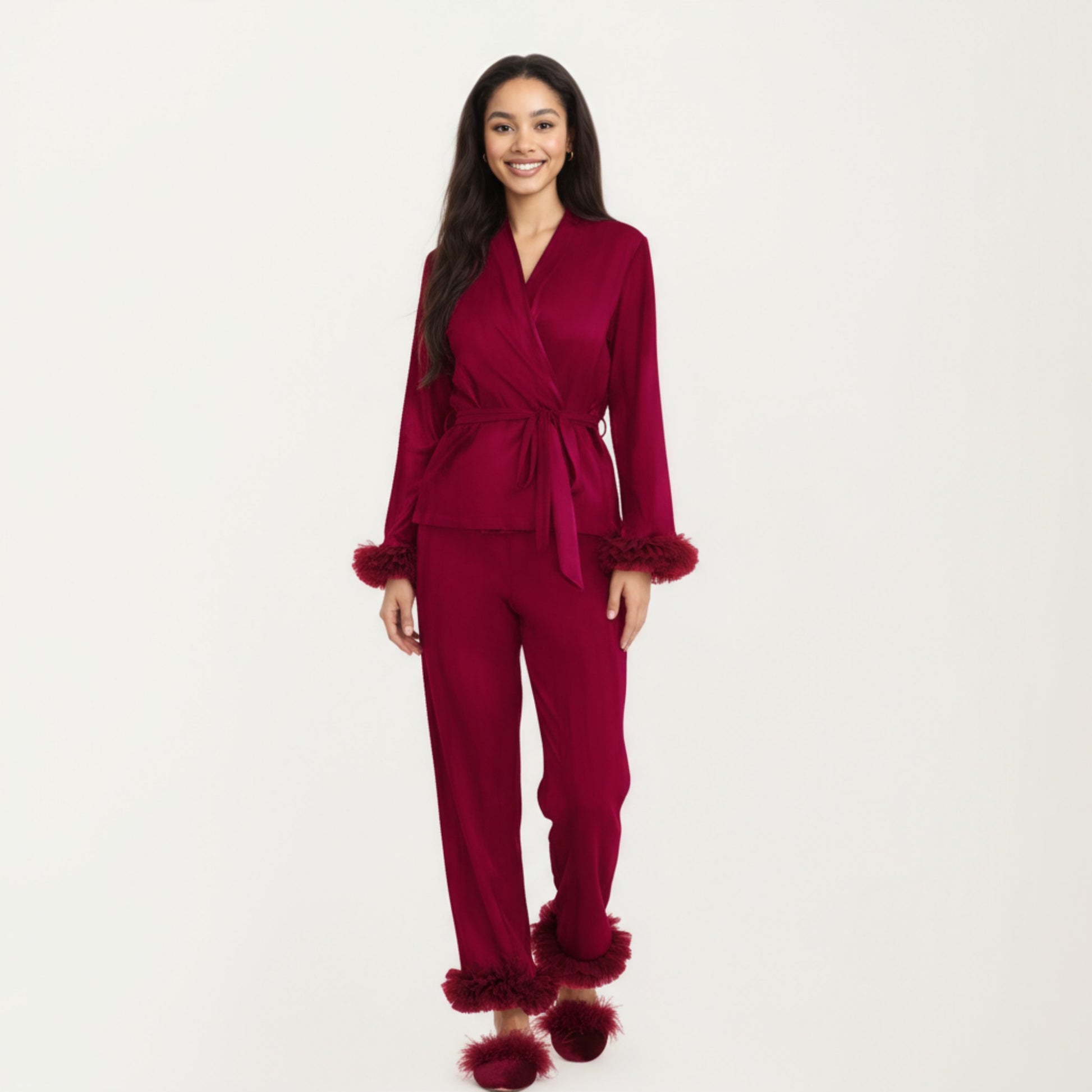 The Anna-Kaci Women's 2-Piece Set Satin Wrap Top with Feather Trim Cuffs and Matching Straight-Leg Pants brings playful sophistication to your loungewear collection. Designed from smooth satin fabric, the wrap top features a flattering tie waist that defines the silhouette, while soft feather trim accents add a glamorous touch. The coordinated pants complete the set with a relaxed fit, offering a luxurious yet comfortable feel for effortless elegance.