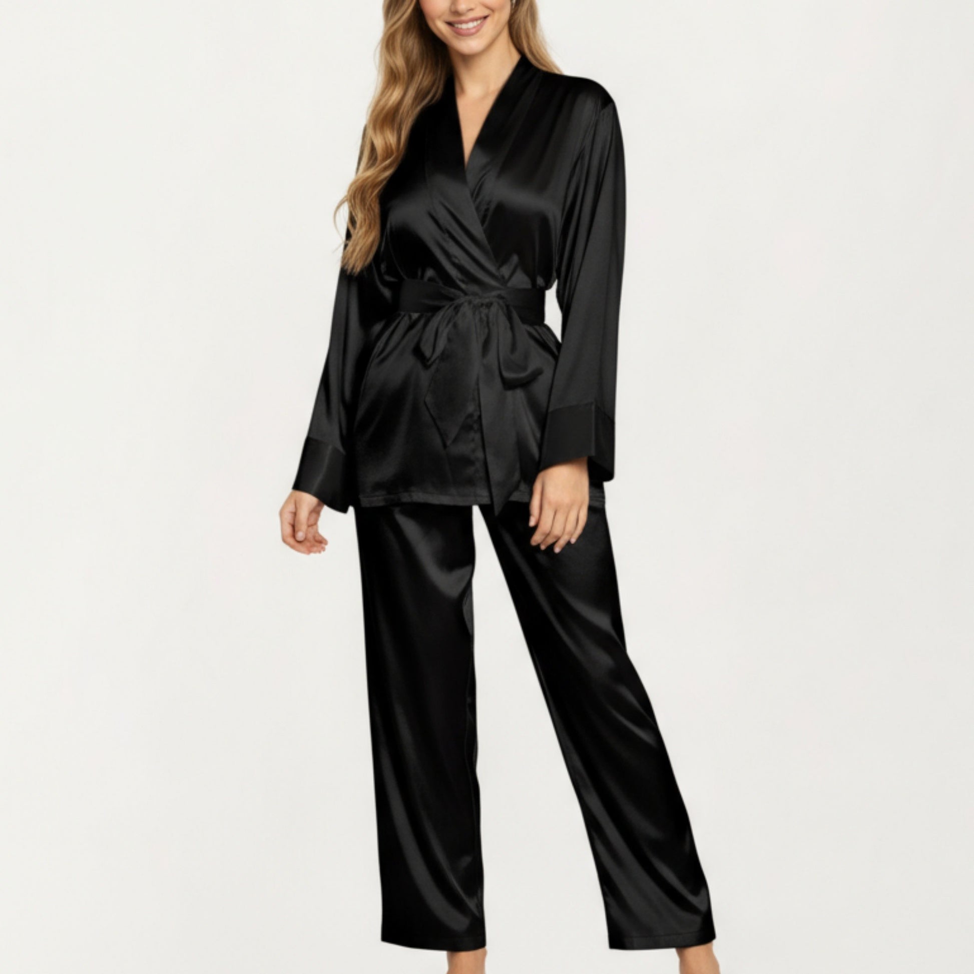 The Anna-Kaci Women's 2-Piece Set Satin Wrap Top with Tie Waist and Matching Straight-Leg Pants embodies refined elegance with a modern touch. Crafted from smooth satin fabric, this coordinated set features a belted wrap top with wide cuffs for a luxurious finish. The straight-leg pants provide a relaxed yet sophisticated silhouette, while the soft sheen of the satin enhances its timeless appeal. Perfect for unwinding in style or enjoying a polished loungewear look.