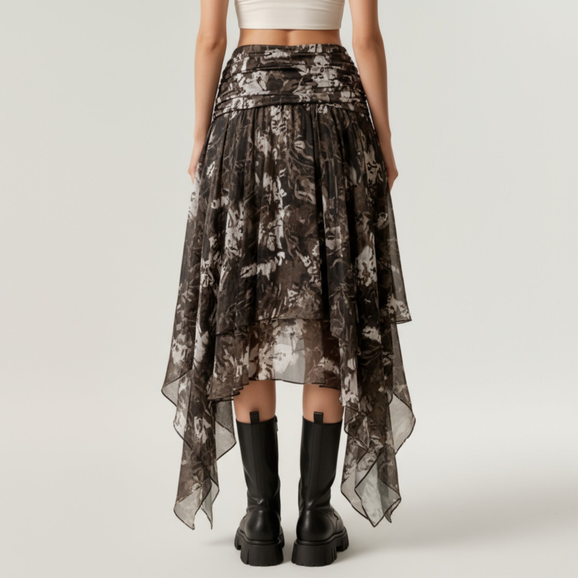 The Anna-Kaci Women's Asymmetrical Floral Chiffon Midi Skirt with Draped Waist and Layered Handkerchief Hem brings a romantic edge to your wardrobe. Crafted from lightweight chiffon with a flowy, layered silhouette, this skirt moves beautifully with every step. The draped waistband flatters the figure, while the soft floral print adds a touch of modern elegance. Its asymmetrical hemline creates a dynamic shape, making it perfect for pairing with fitted tops or edgy boots for a bold, feminine look.