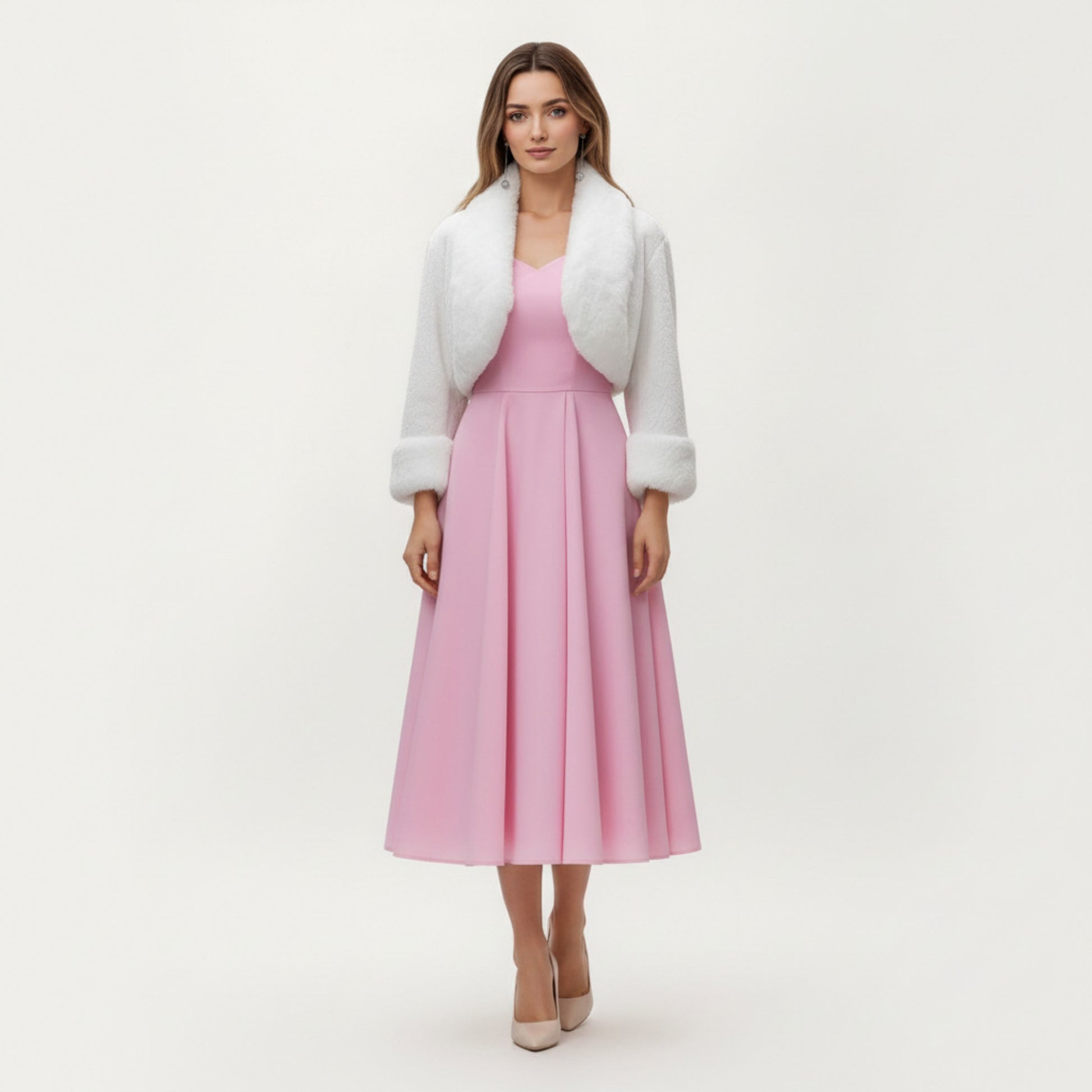 The Anna-Kaci Women's Faux Fur Trim Cropped Jacket adds a refined, luxurious touch with its plush shawl collar and soft textured body. The clean open-front design keeps the look smooth and polished while offering comfortable layering over dresses and special pieces. Long sleeves with plush trim provide cozy warmth without bulk, creating a beautifully balanced silhouette that enhances formal and feminine outfits.