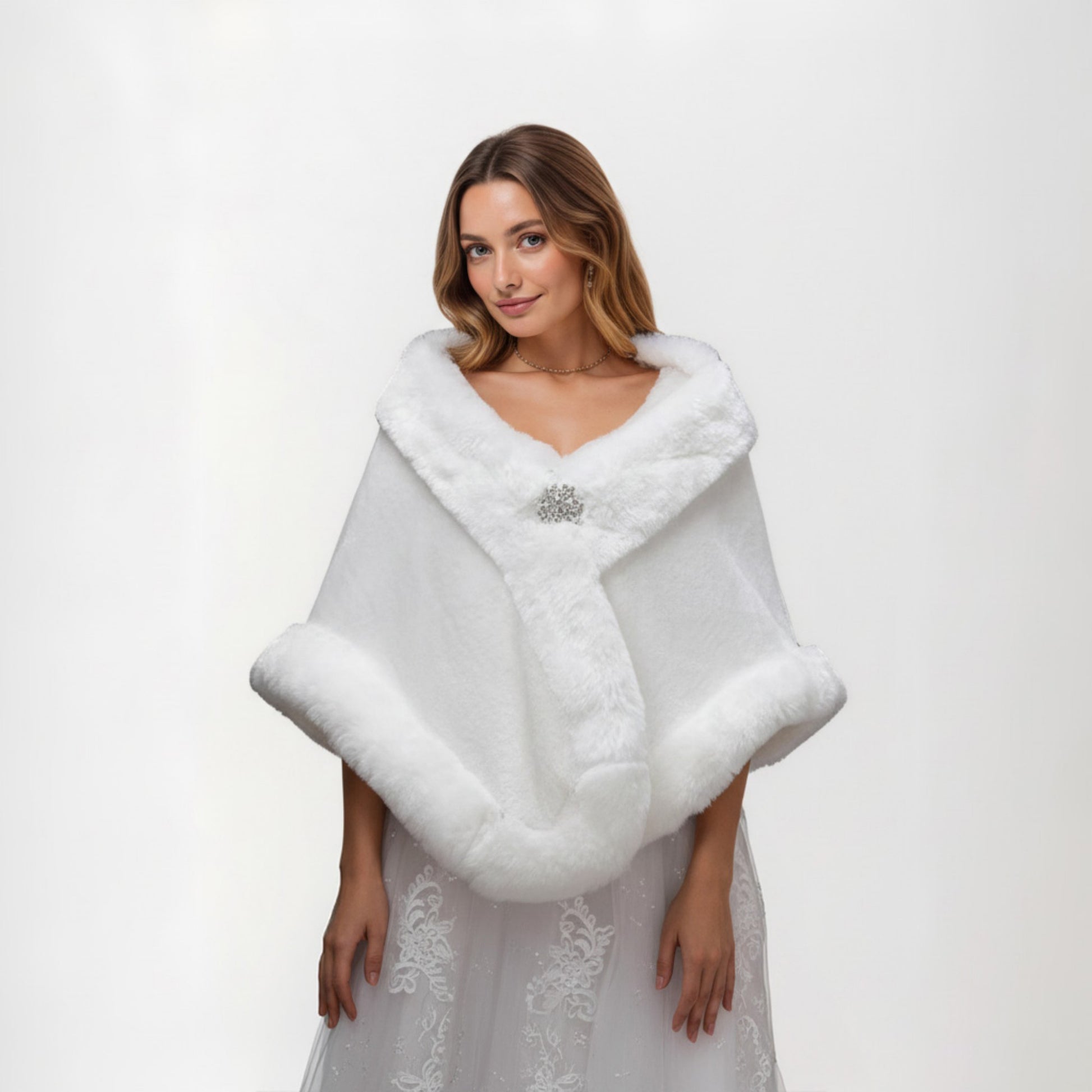Anna-Kaci Women's Faux Fur Trim Wrap Shawl with Plush Textured Finish Sparkling Brooch Closure and Draped Silhouette 19in