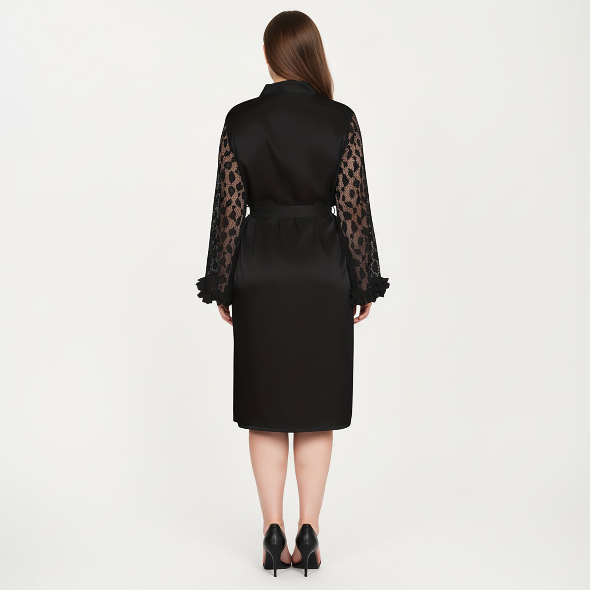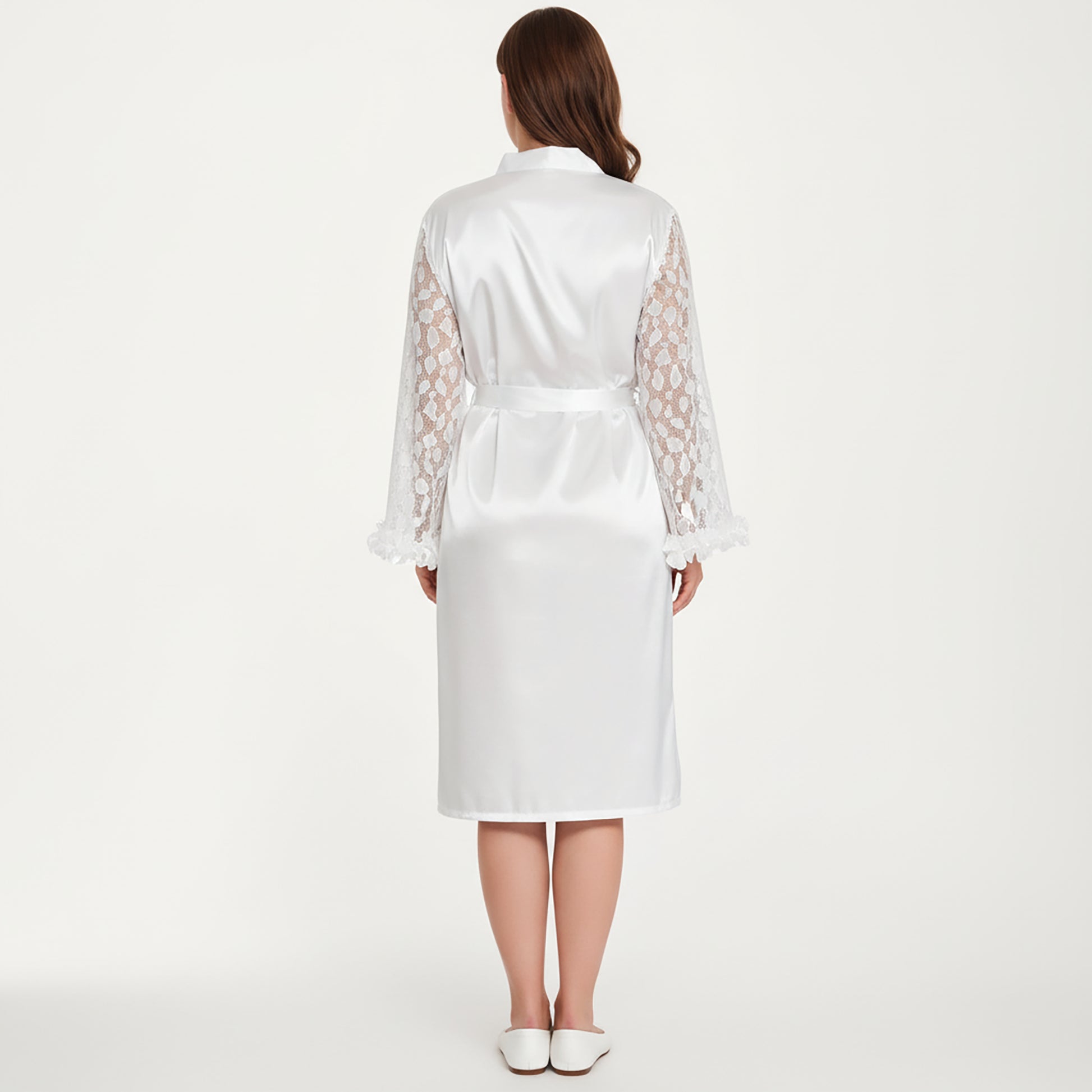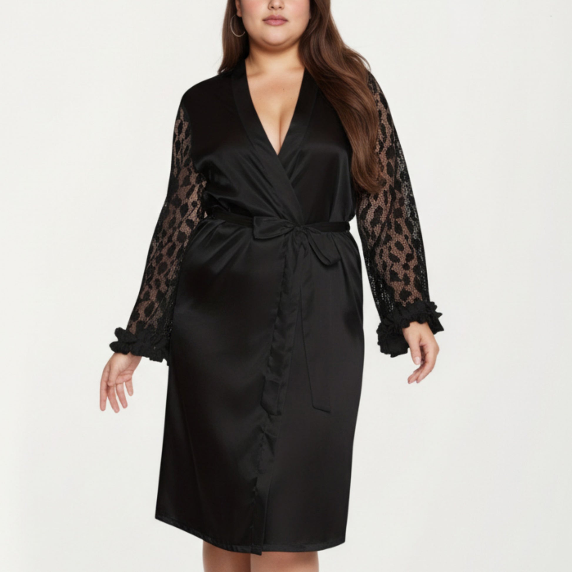 Anna-Kaci Lounge Women's PLus Size Satin Robe with Sheer Floral Lace Sleeves, Ruffled Cuffs, and Adjustable Waist Tie