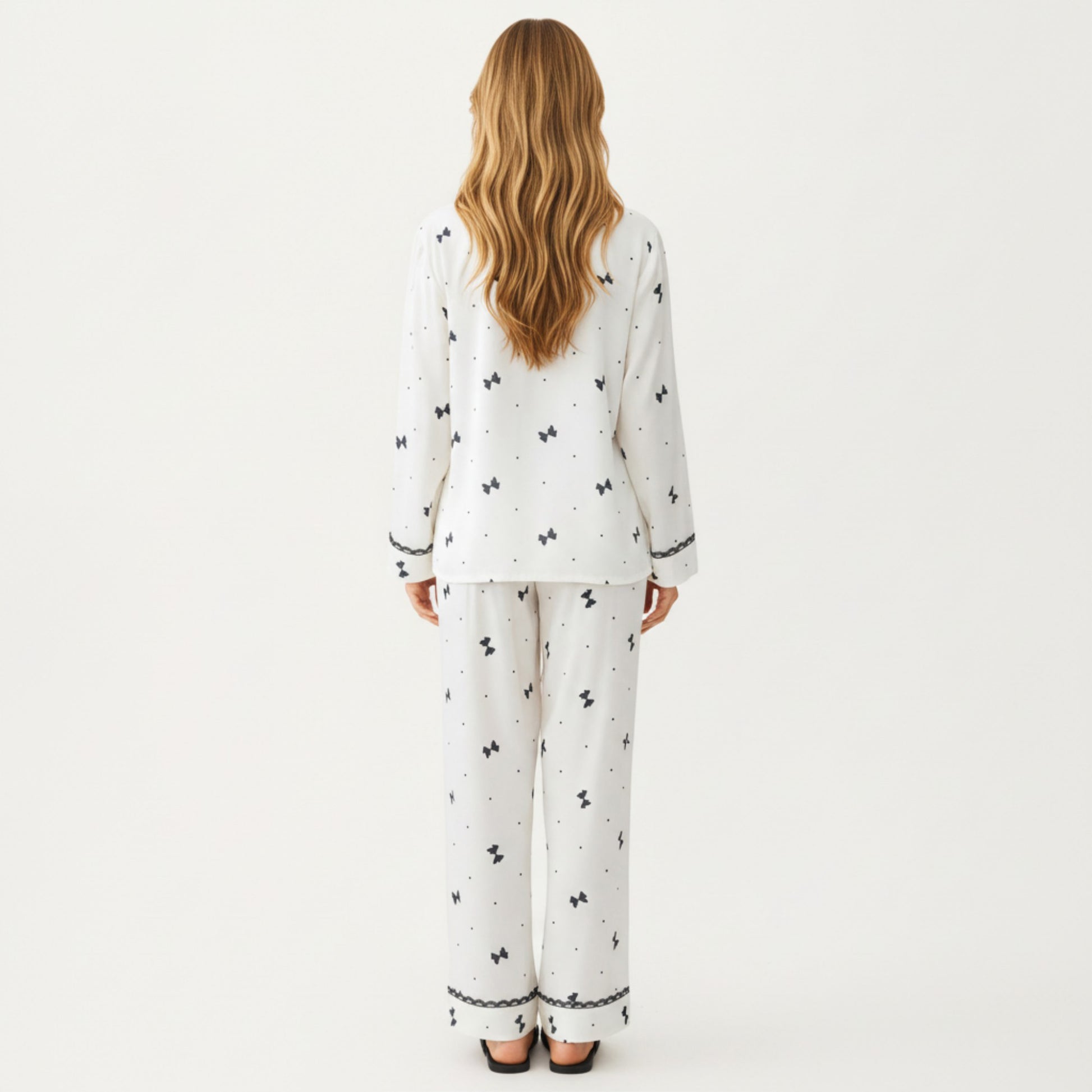 This Anna-Kaci Women's 2-Piece Set features a printed button-front pajama top paired with coordinating relaxed fit pants for a soft, easy feel. The contrast trim outlining the collar, cuffs, and pocket adds a playful, polished touch to the minimalist print. The lightweight fabric drapes smoothly for breathable comfort, while the full-length pants offer gentle movement. Designed for everyday ease, this set blends charm, comfort, and a clean, coordinated look.