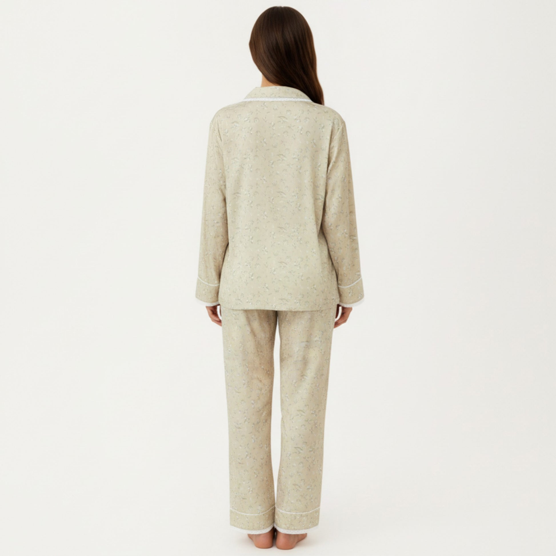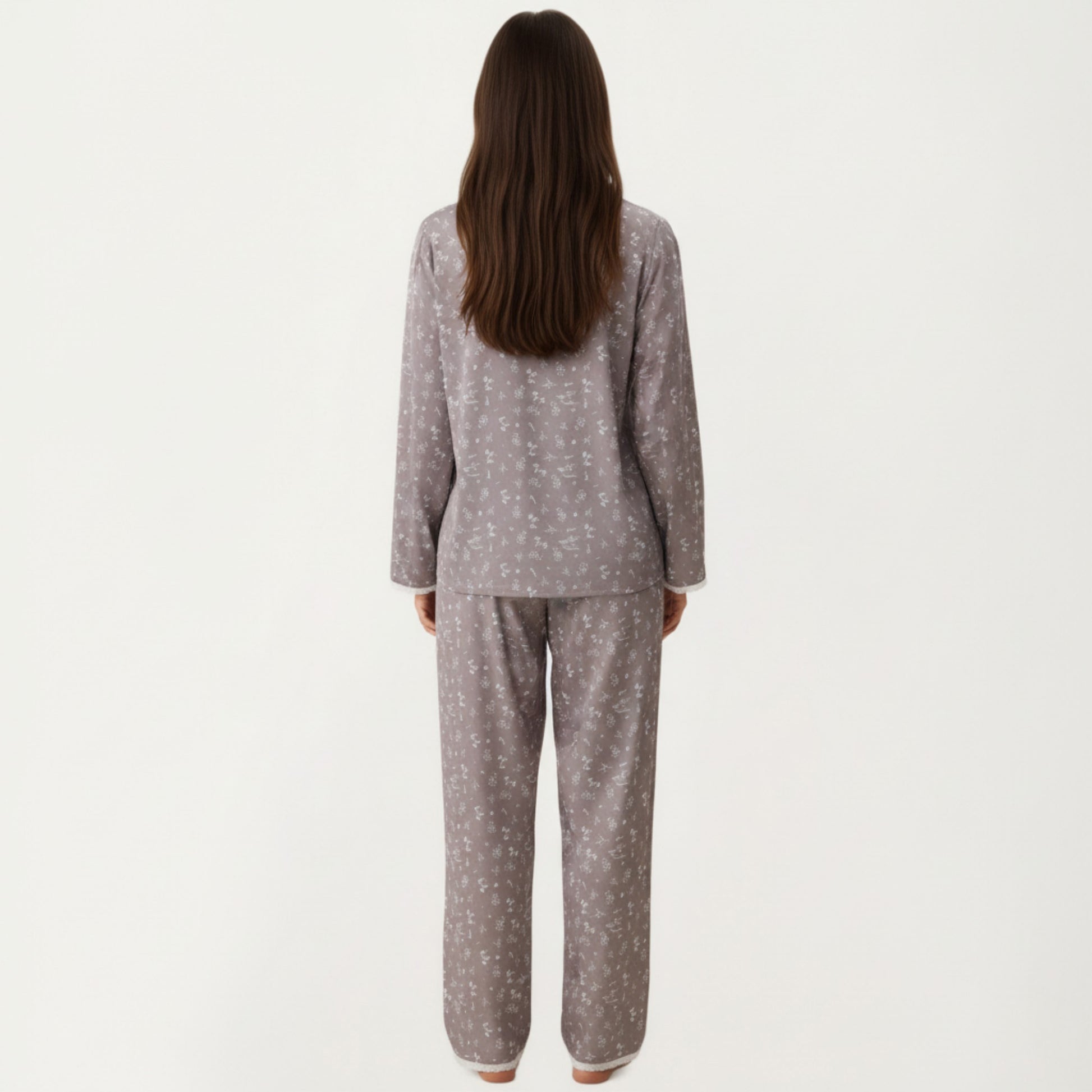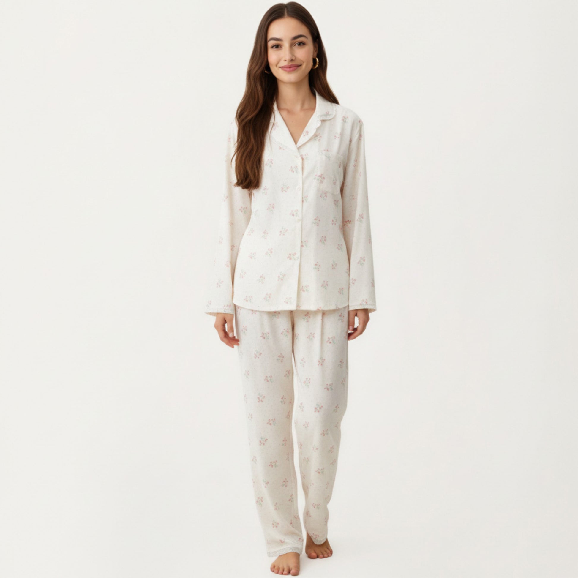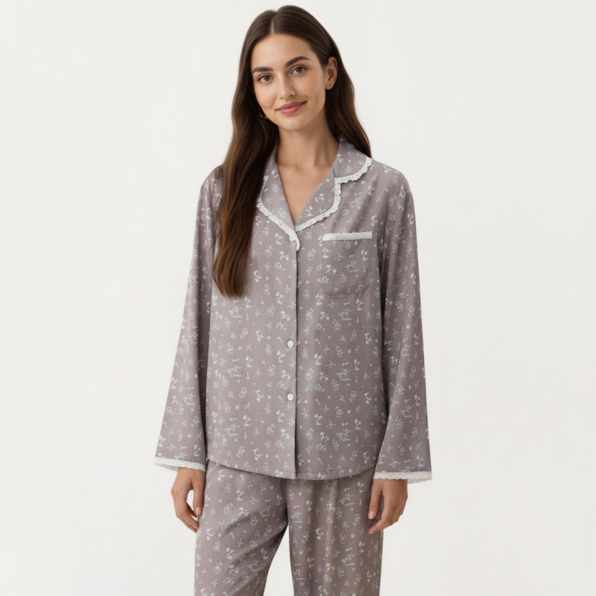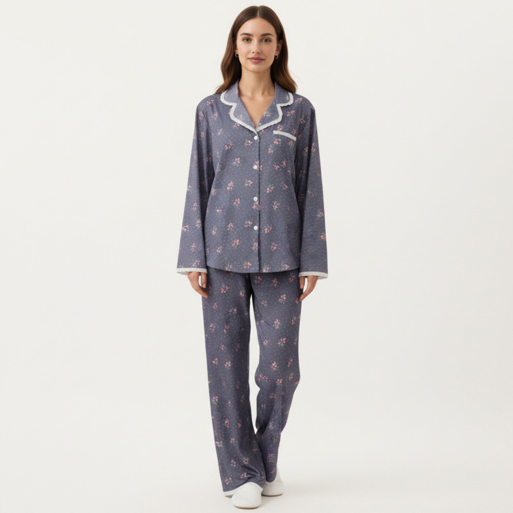 This Anna-Kaci Women's 2-Piece Set features a floral print pajama top and matching relaxed fit pants designed for softness and ease. The button-front top includes delicate trim detailing and a smooth drape that pairs beautifully with the coordinating bottoms. Crafted from a lightweight, gentle fabric, this set offers a cozy, breathable feel. Its fluid silhouette enhances comfort while maintaining a charming, polished look for everyday relaxation.
