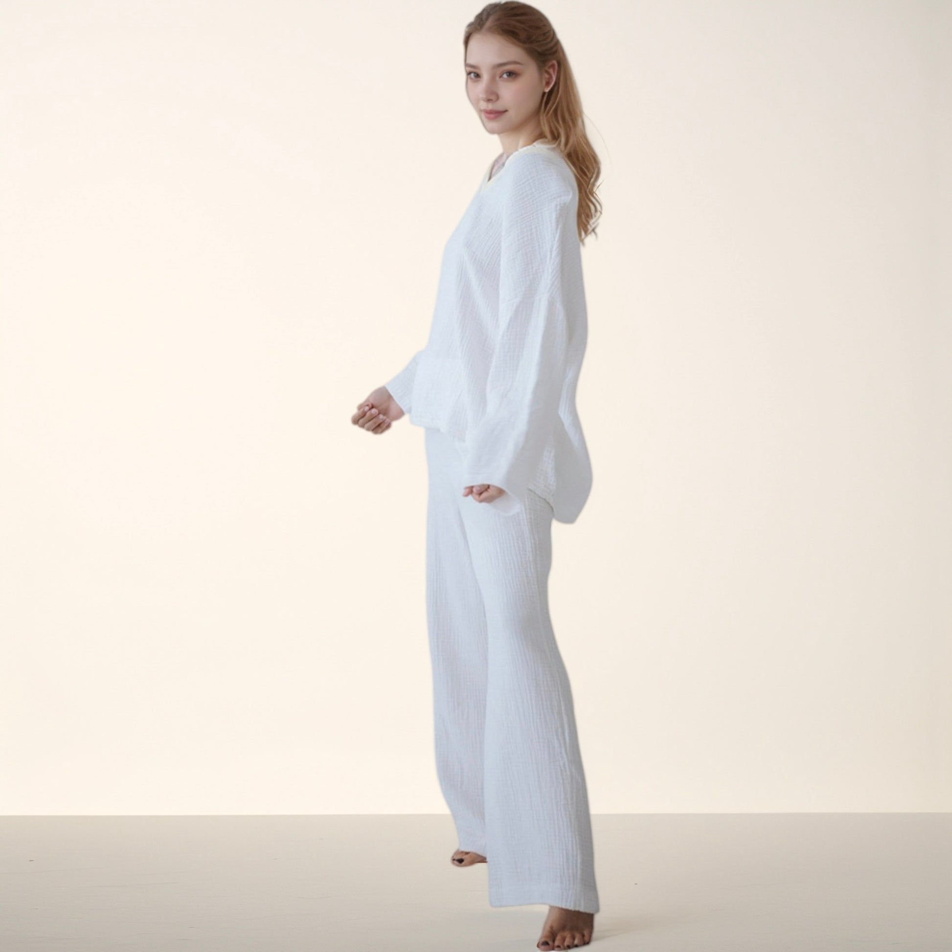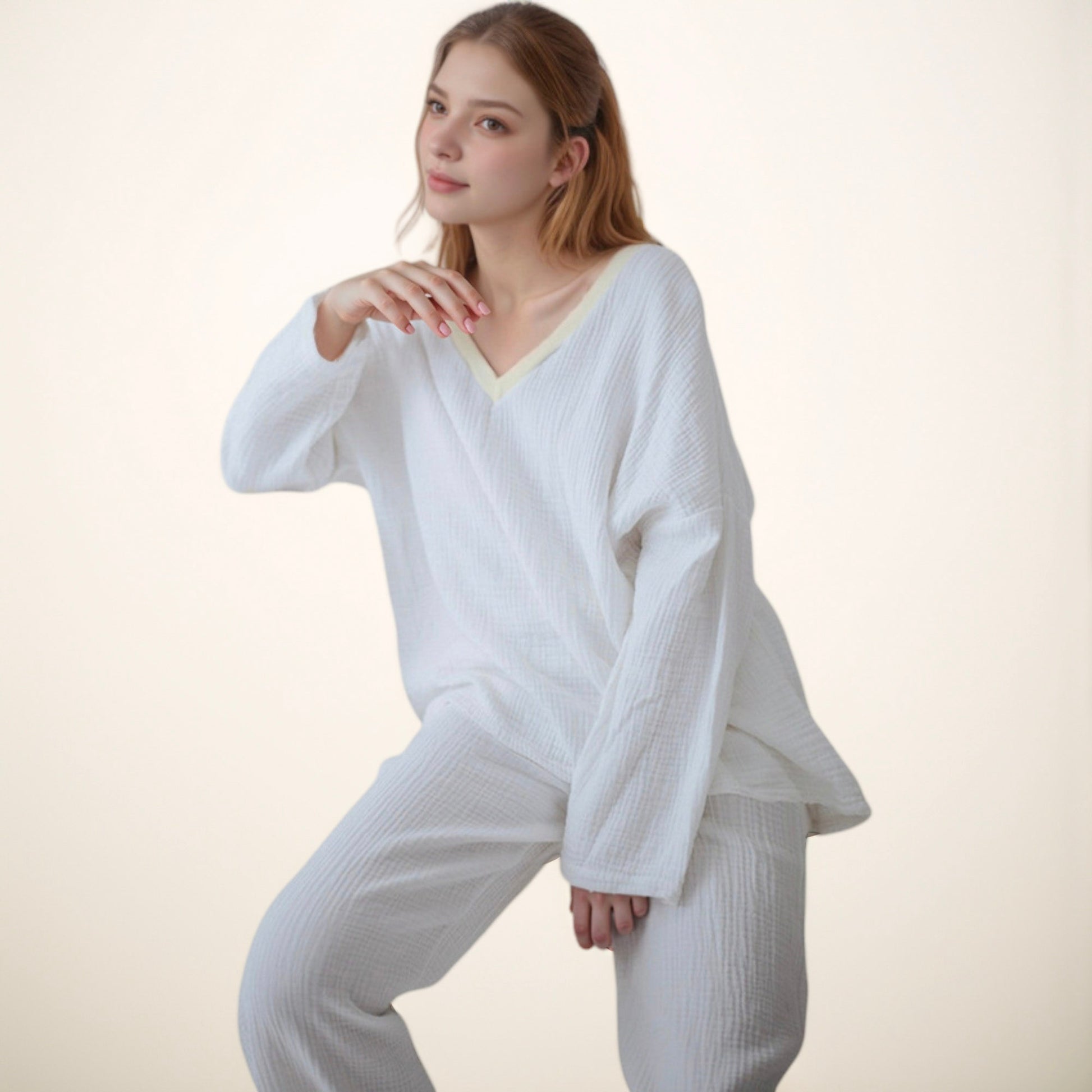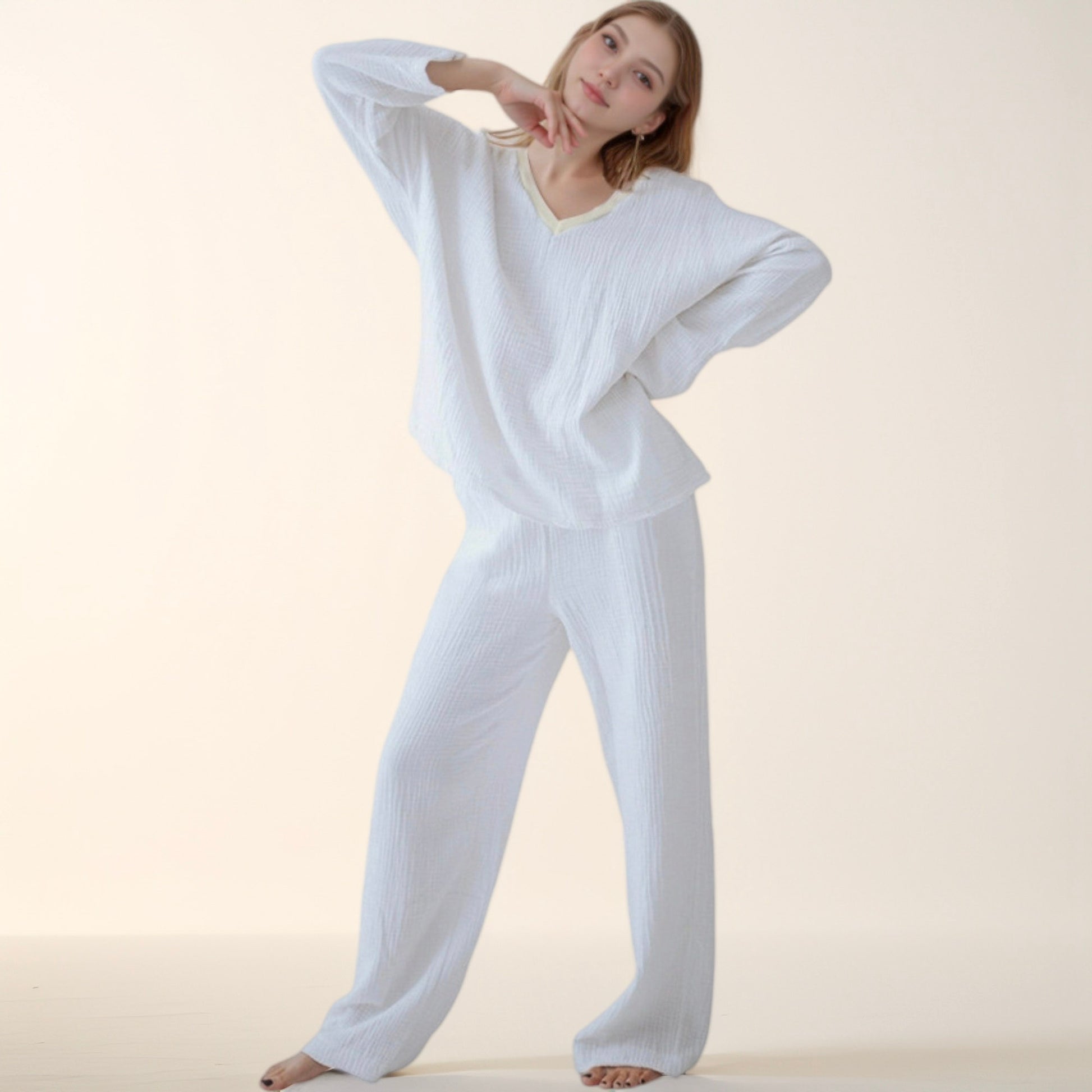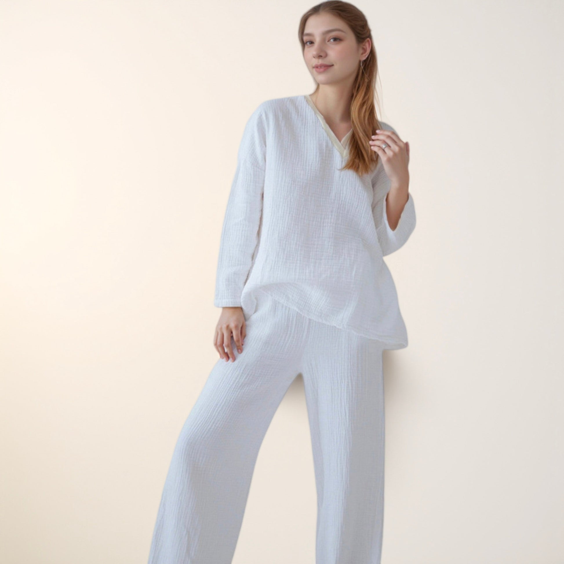 This women's lounge set features a soft waffle-textured fabric with a relaxed V-neck long sleeve top and wide leg pants. The lightweight material and loose silhouette provide ultimate comfort while maintaining a clean, stylish look. Perfect for lounging at home or casual indoor wear, this set offers effortless style and coziness. Enjoy a breathable and soothing feel in every season with this two-piece outfit.