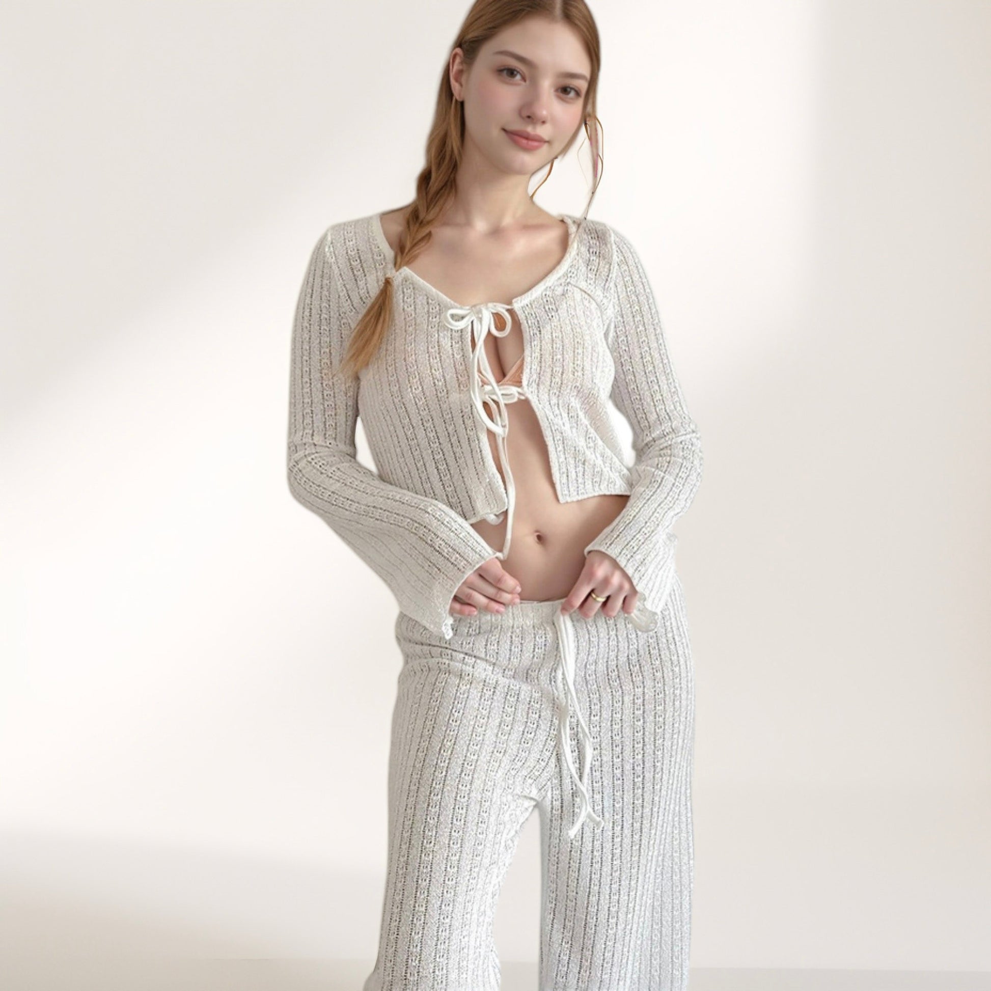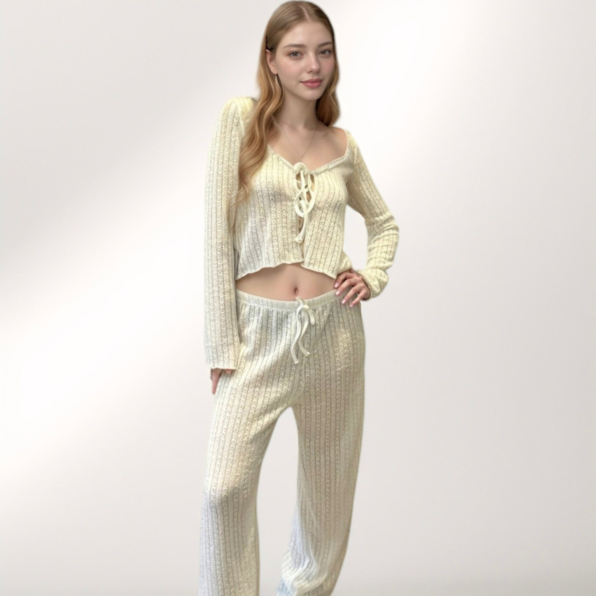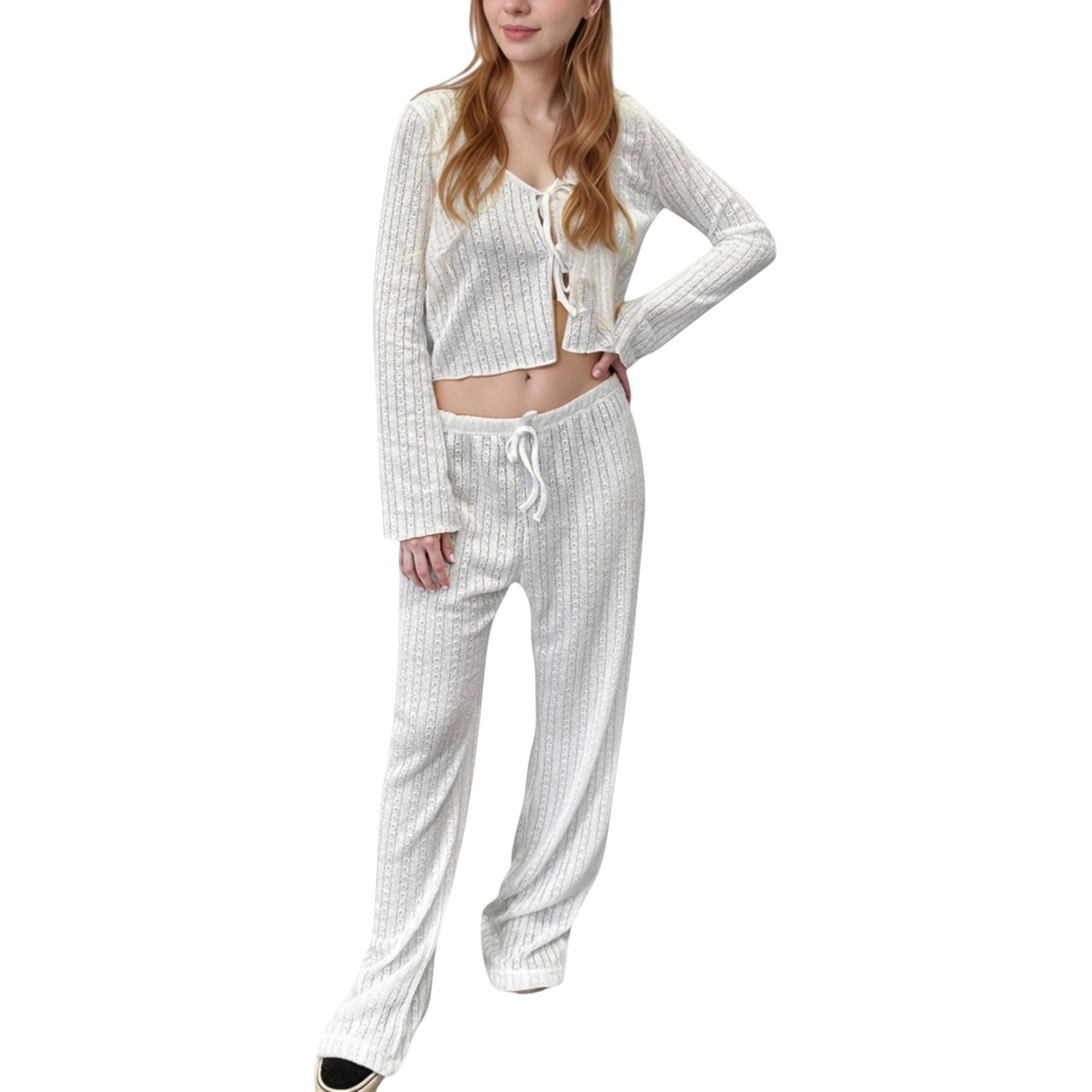 This women's lounge set features a textured ribbed knit fabric with a cropped long sleeve top and relaxed drawstring pants. The top includes a stylish front tie closure that adds a playful touch to the cozy, fitted silhouette. The pants offer a comfortable wide-leg fit with an adjustable waistband for personalized comfort. Ideal for indoor lounging or casual home wear, this set blends relaxed charm with modern styling.