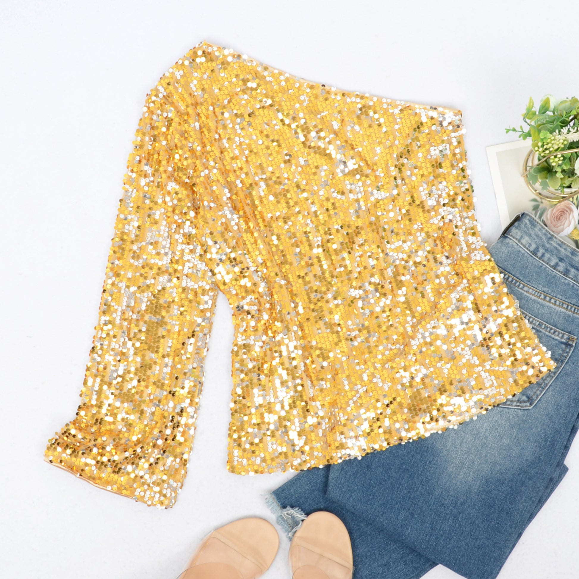 Turn heads at your next event with this Women¡¯s One-Shoulder Sequin Top. Designed with an asymmetrical neckline and shimmering sequins, this blouse brings instant glamour to any outfit. The long sleeve detail balances the bold design, making it a chic choice for parties, night outs, or special occasions. Pair it with jeans, skirts, or tailored pants for a dazzling look.