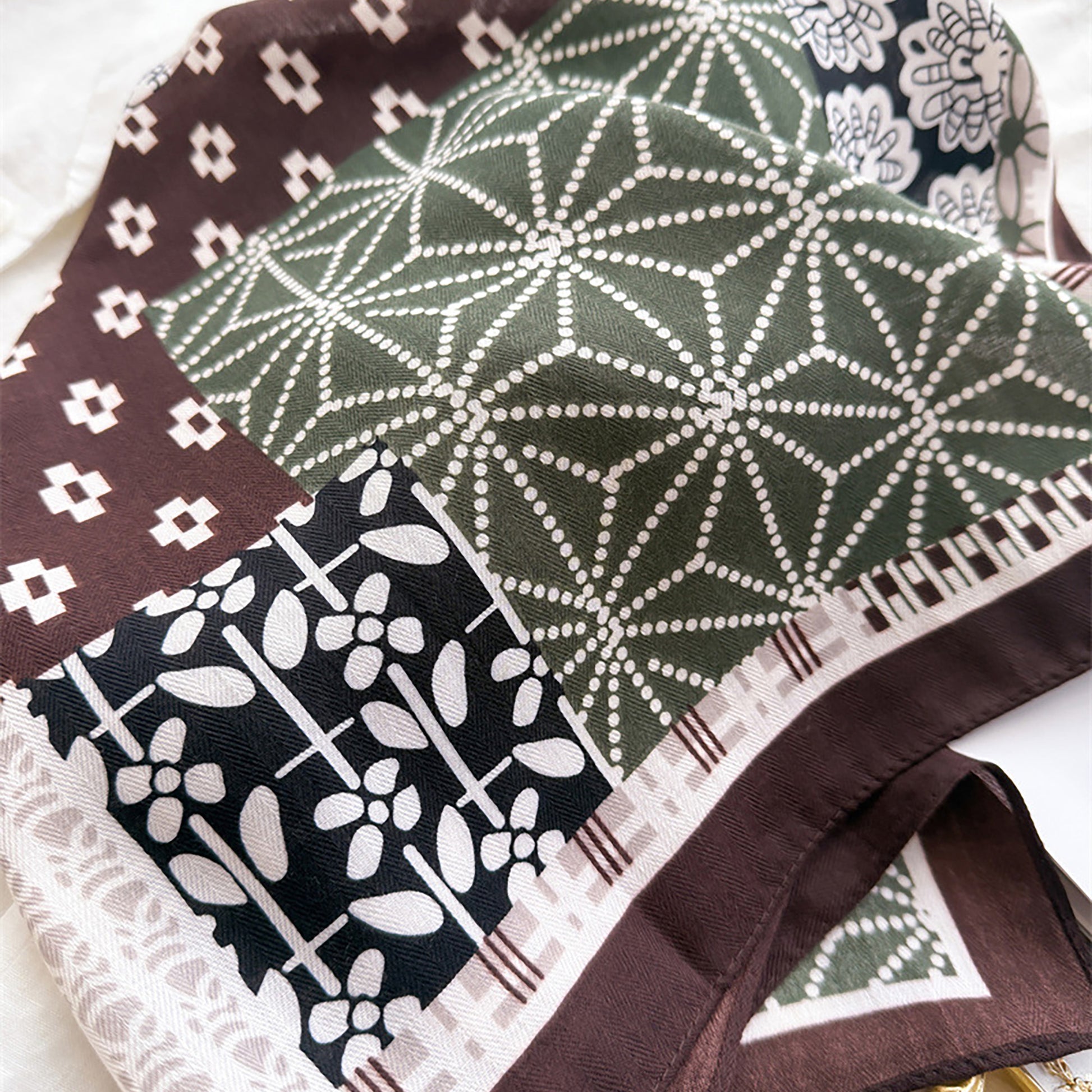 The scarf combines modern artistry with everyday elegance. Made from soft, breathable faux cotton-linen fabric, it offers a lightweight and textured finish that feels natural and comfortable. The patchwork of floral and geometric patterns creates a distinctive, refined style that pairs effortlessly with any wardrobe. Whether tied around the neck, worn as a headscarf, or styled on a handbag, this scarf adds a stylish, contemporary touch to your look.