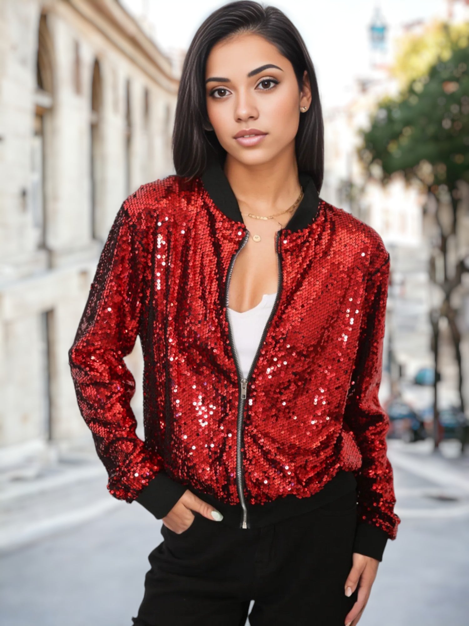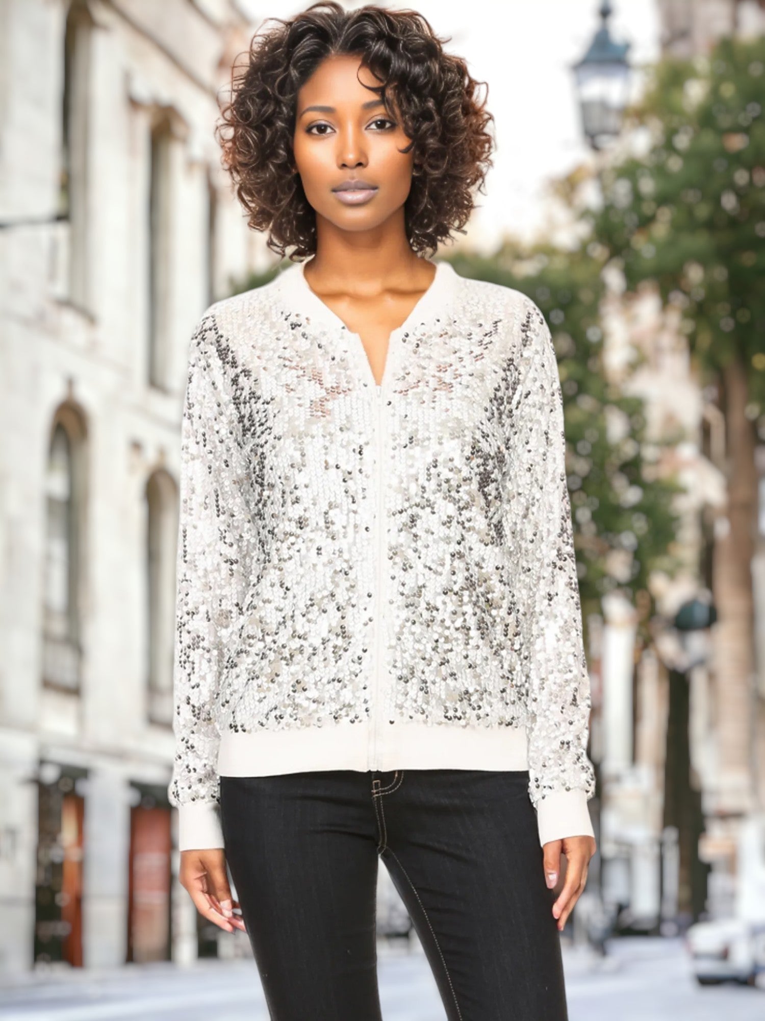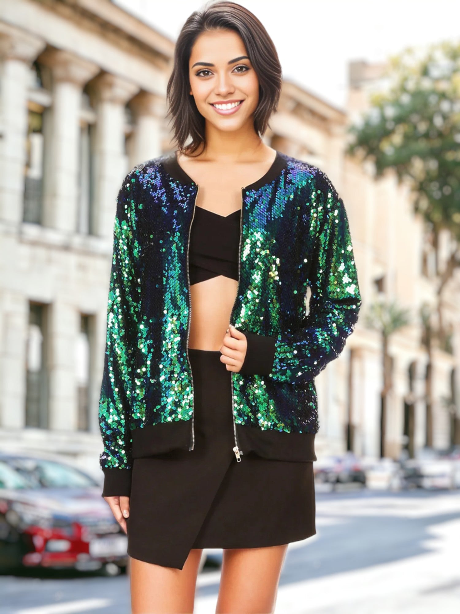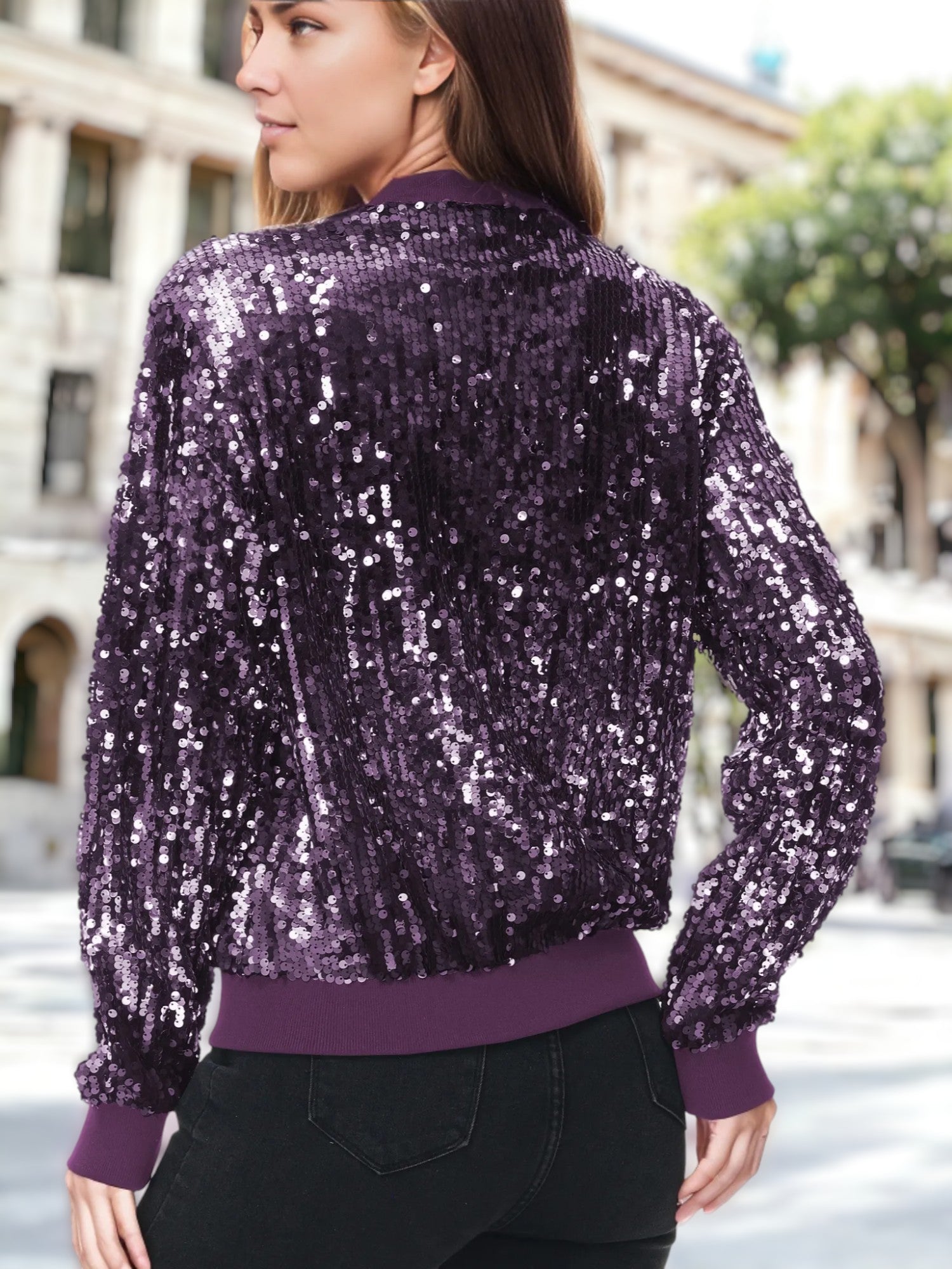 Sequin Bright Color Bomber Zip-Up Solid Jacket