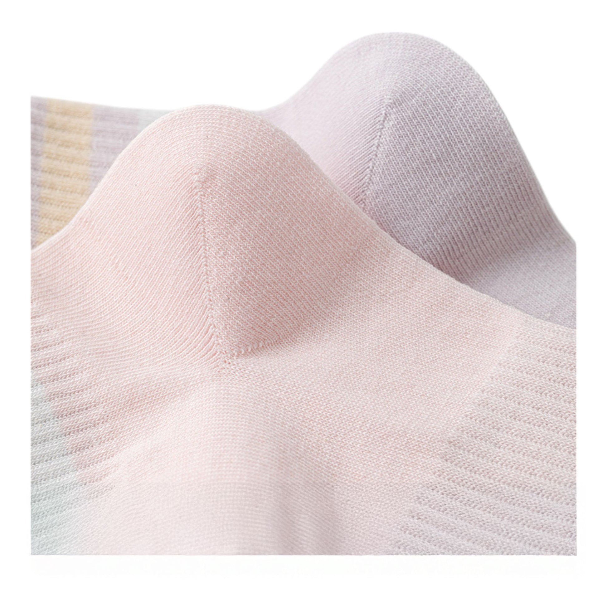 This 5-pair pack of Women ankle socks features soft cotton knit fabric with pastel striped cuffs for a subtle pop of color. The breathable and stretchy ribbed design offers lasting comfort and a secure fit. Ideal for daily wear, lounging, or casual outings, these socks are easy to care for and maintain their softness after every wash.