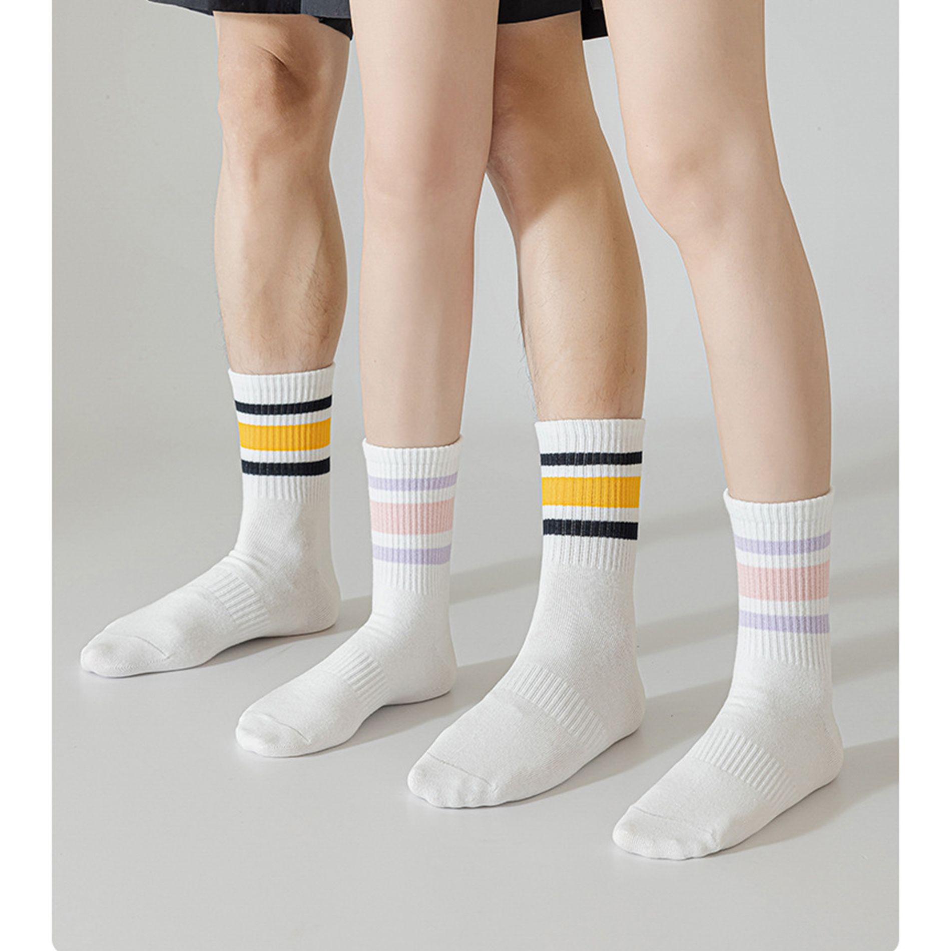 Anna-Kaci Crew Socks 4-Pack White Base Colorful Ribbed Cuff Striped Design Stretch Comfort Breathable Fit