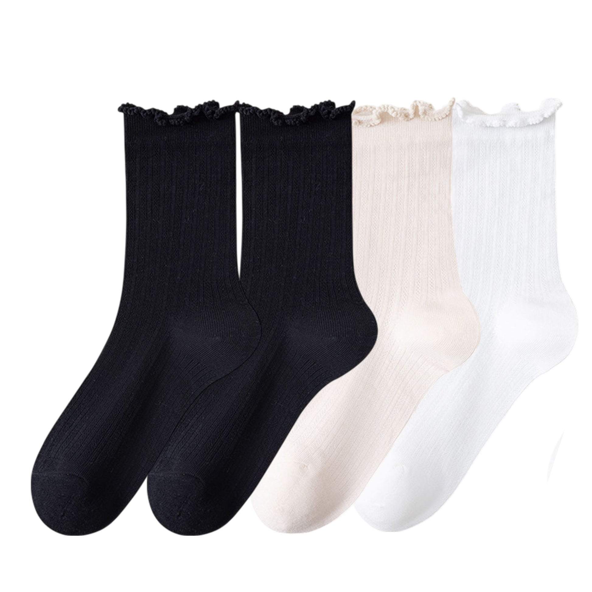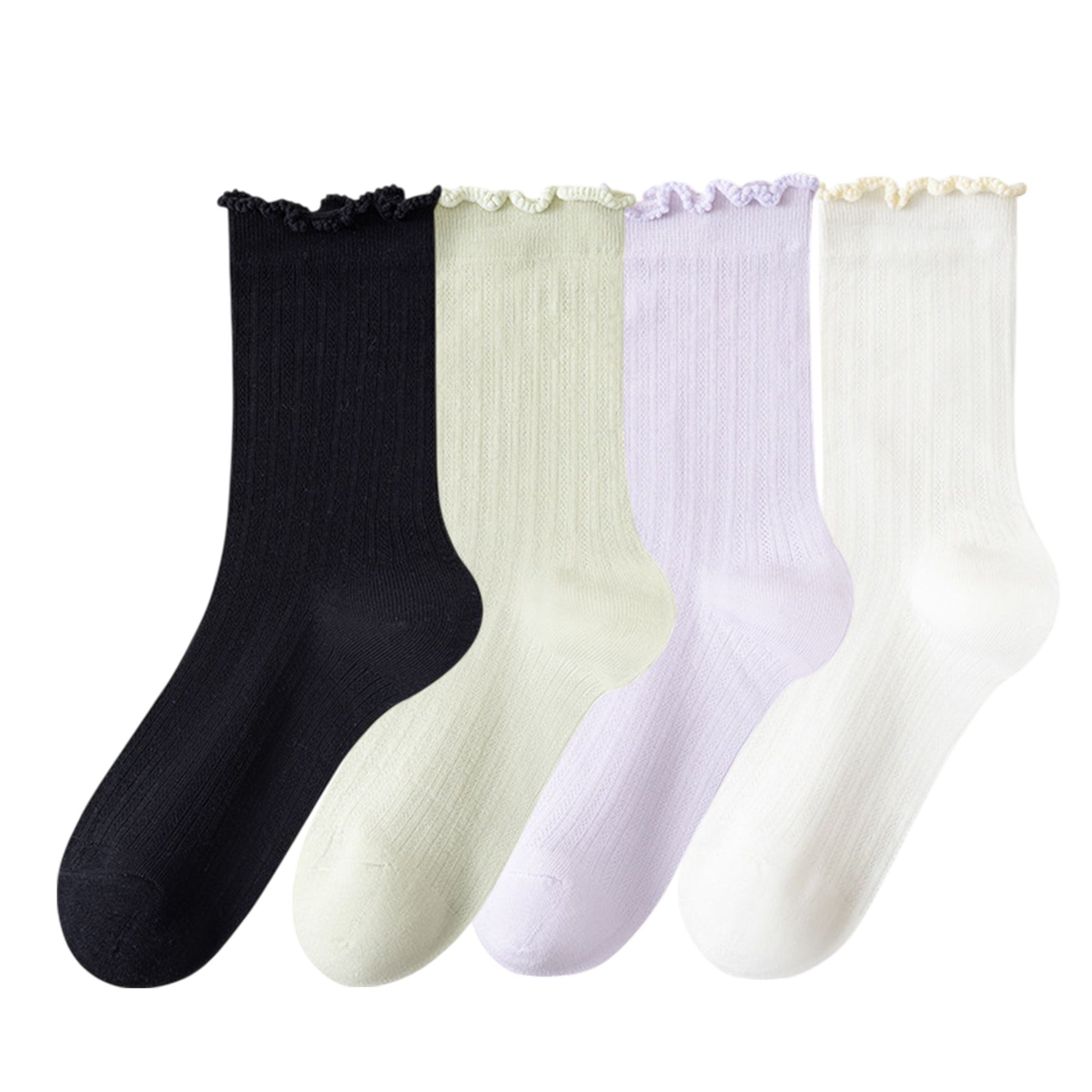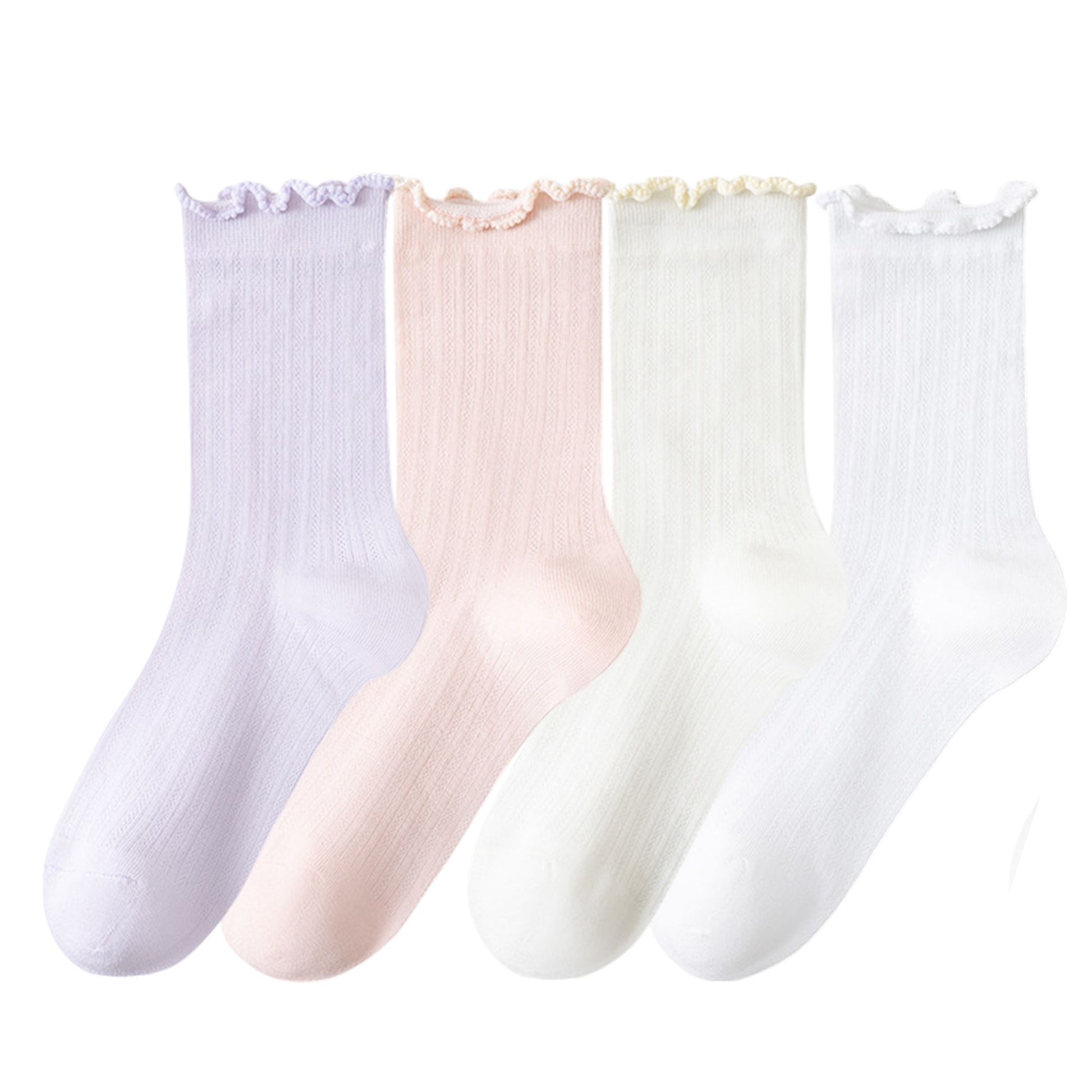 This women's 4-pair pack of socks features a soft ribbed knit texture and charming ruffled edge, offering a delicate and breathable fit for daily comfort. Each set includes four pastel or neutral-toned pairs that are lightweight and stretchy for all-day wear. The ankle length and slim profile make them ideal for pairing with loafers, Mary Janes, or sneakers. Available in five different color combinations to match your wardrobe with ease.