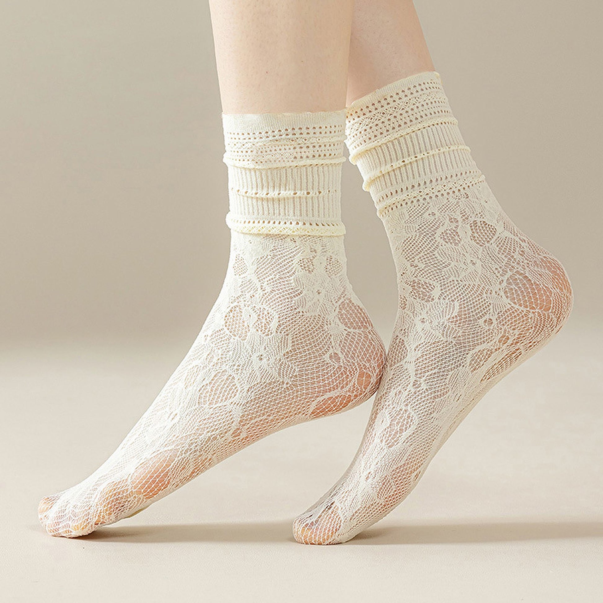 Elevate your sock game with our Women's Black Lace Ankle Socks. These socks feature an intricate floral lace design that exudes femininity and sophistication, making them a perfect accessory to dress up any outfit. The delicate ruffled cuff adds a cute, stylish touch, while the sheer lace fabric ensures breathability and comfort throughout the day.